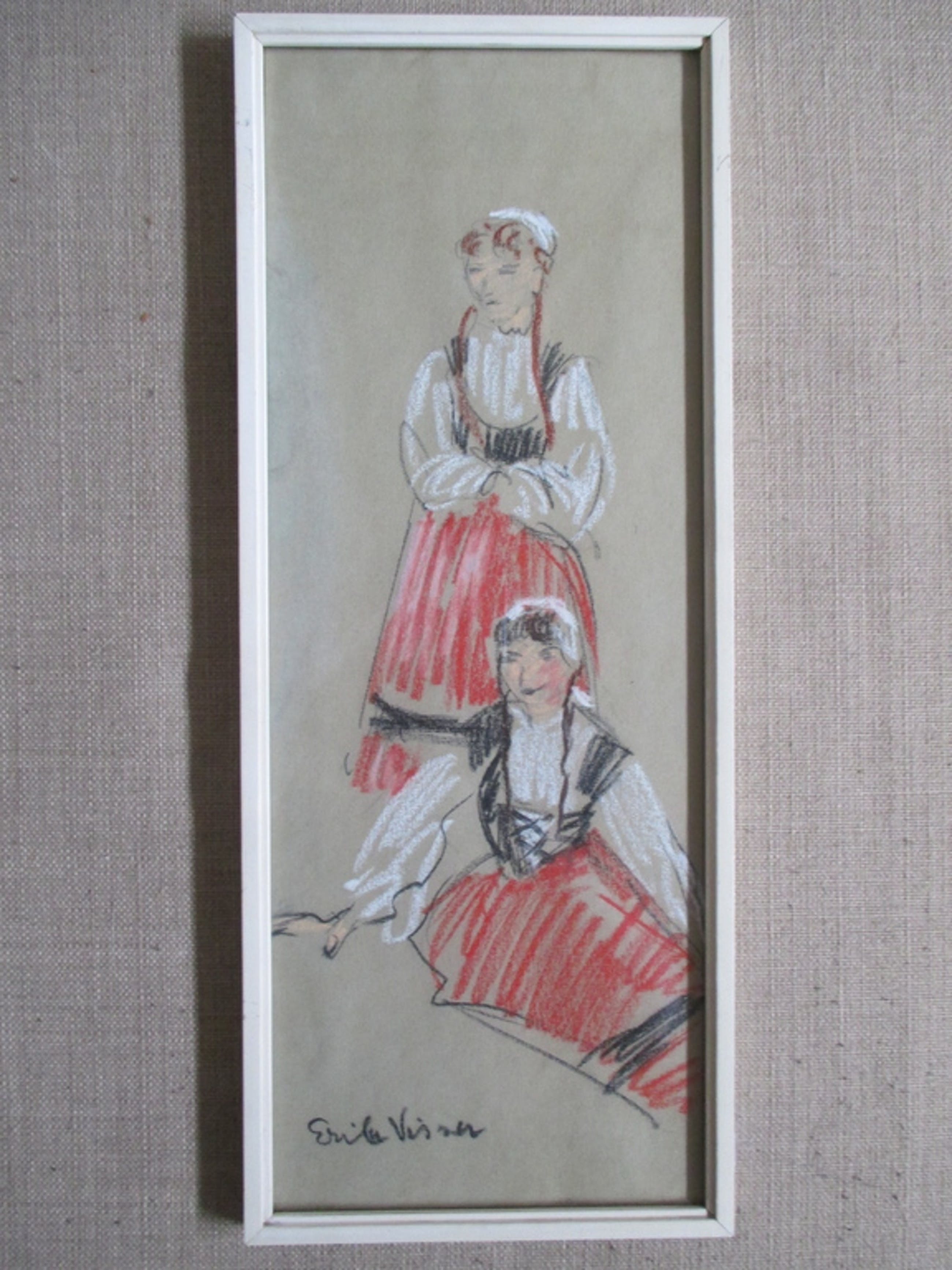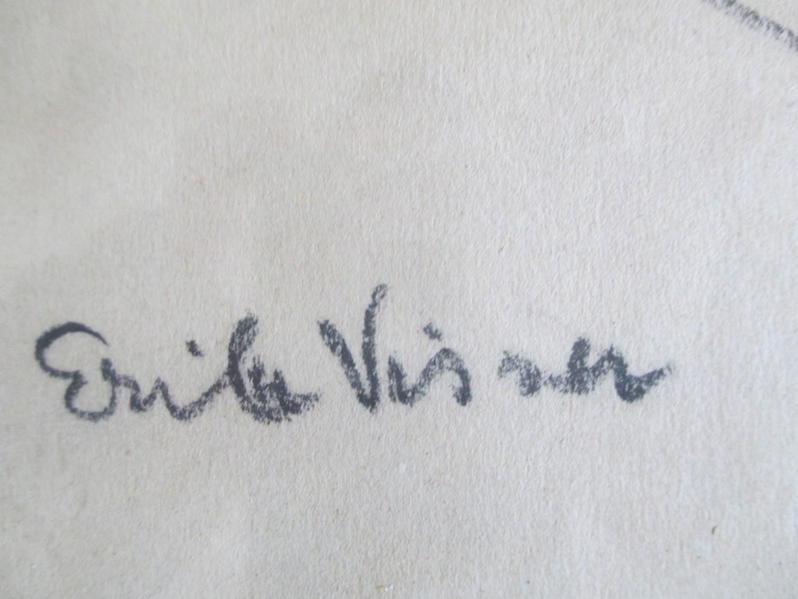 Tekening van Erika Visser, gesigneerd l.o. Ingelijst achter glas, afm. lijst 16,5x41 cm.