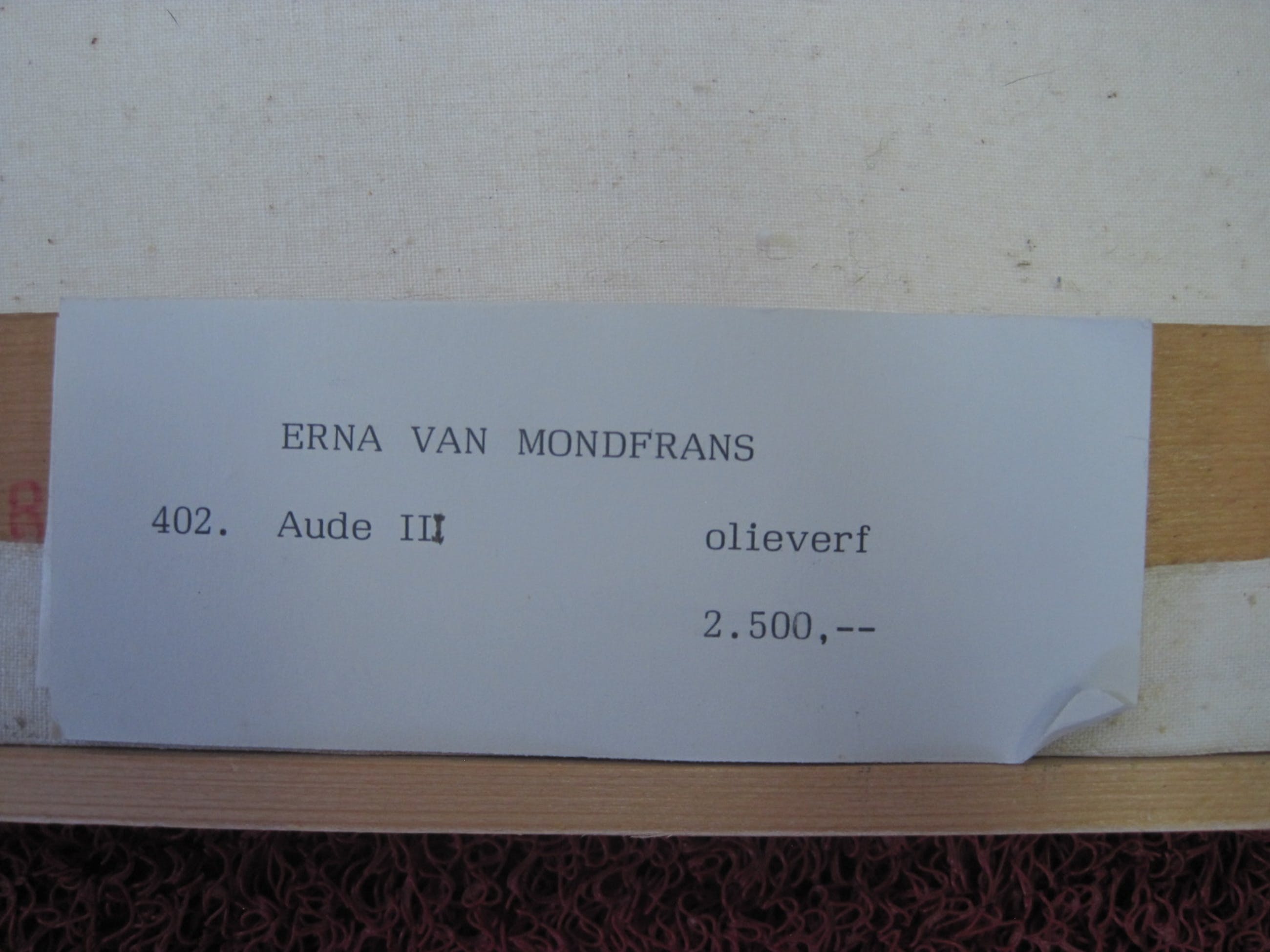 Erna van Mondfrans (1931) woont en werkt in Kolhorn. Ze volgde de opleiding grafiek aan de kunstnijverheidsschool en leerde zichzelf schilderen. Ze doet veel inspiratie op in Frankrijk. We zien van haar pastels en schilderijen. Na een onderwerp gevonden te hebben in dat wat meestal een landschappelijke chaos is, zoekt ze de hoofdvorm en zet ze, indien nodig, deze werkelijkheid naar haar hand. Een tekening en kleurbeschrijving ontstaat en wordt later in eigen atelier omgezet tot zeefdruk of schilderij.