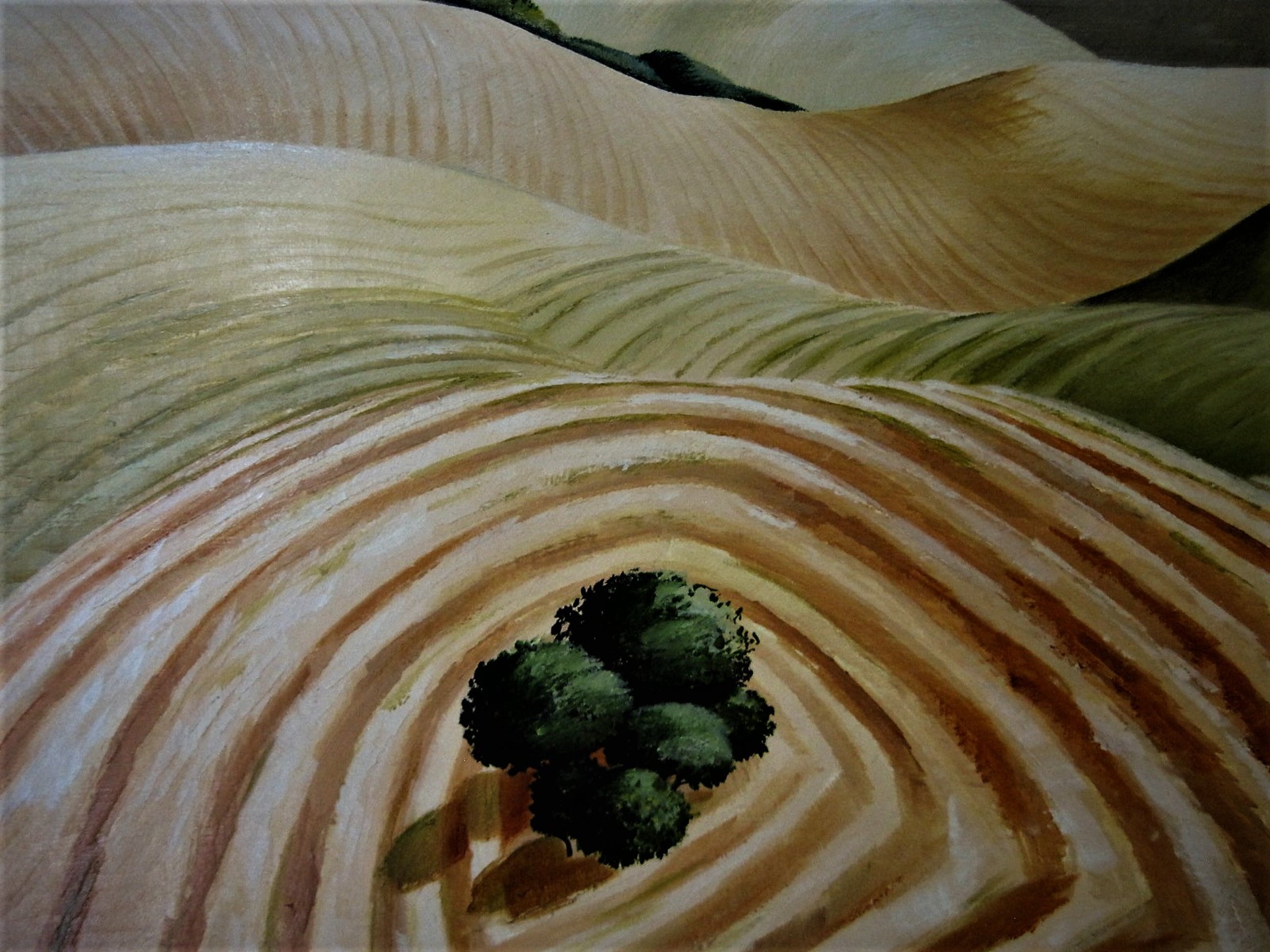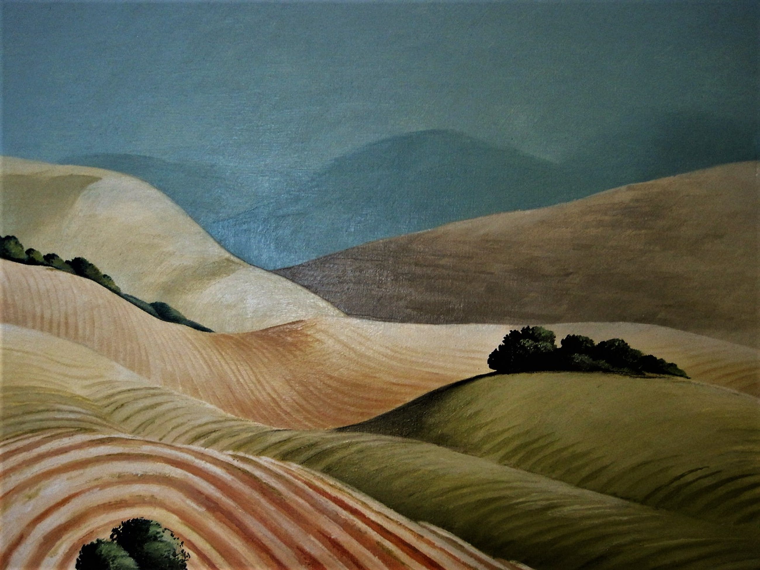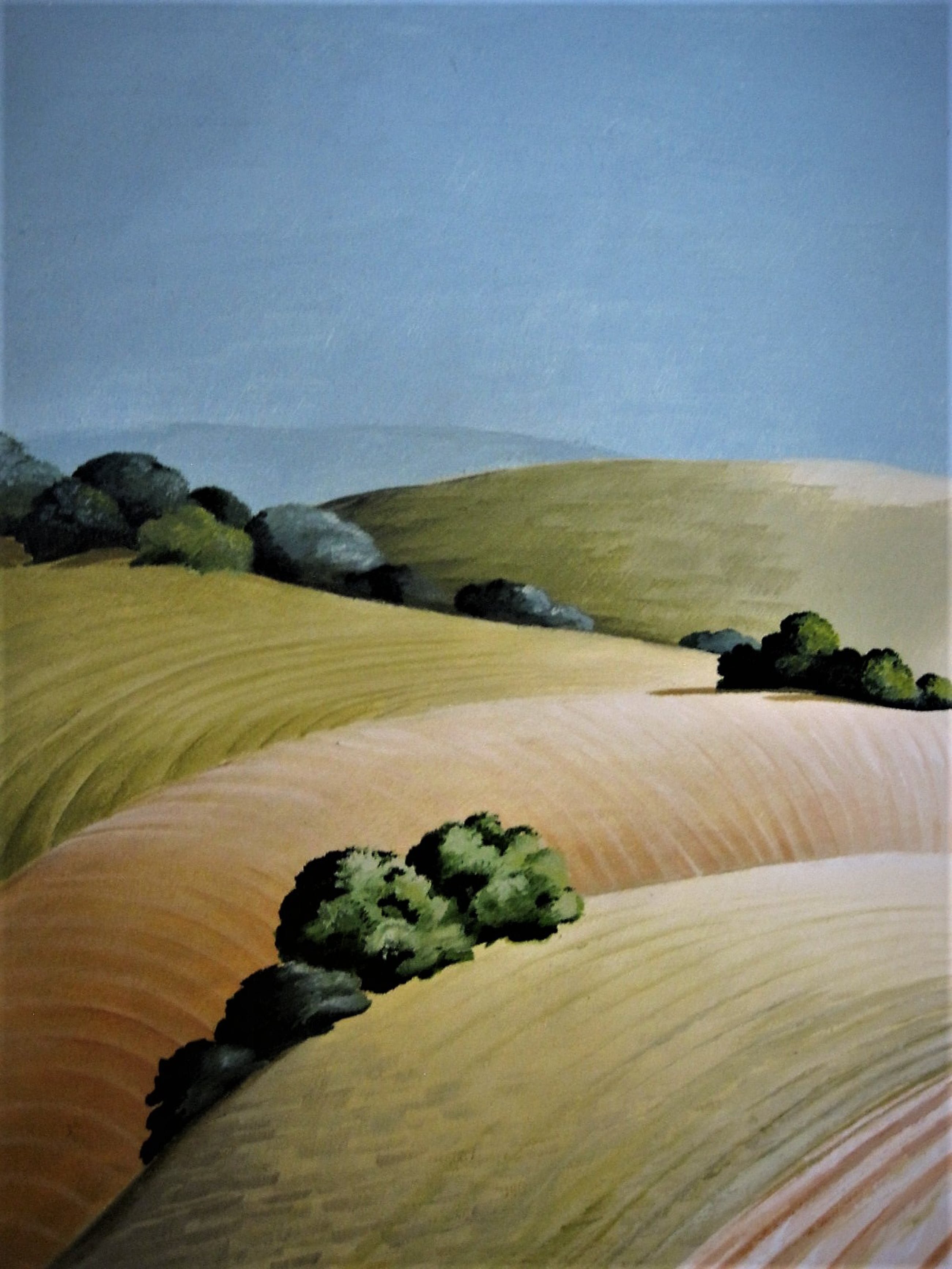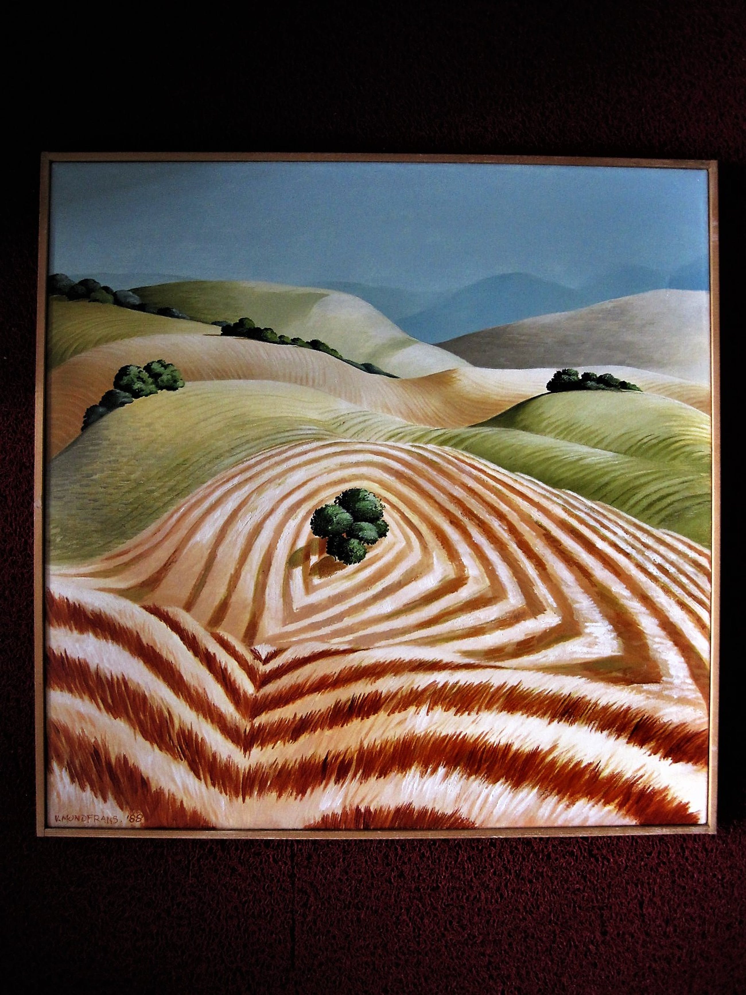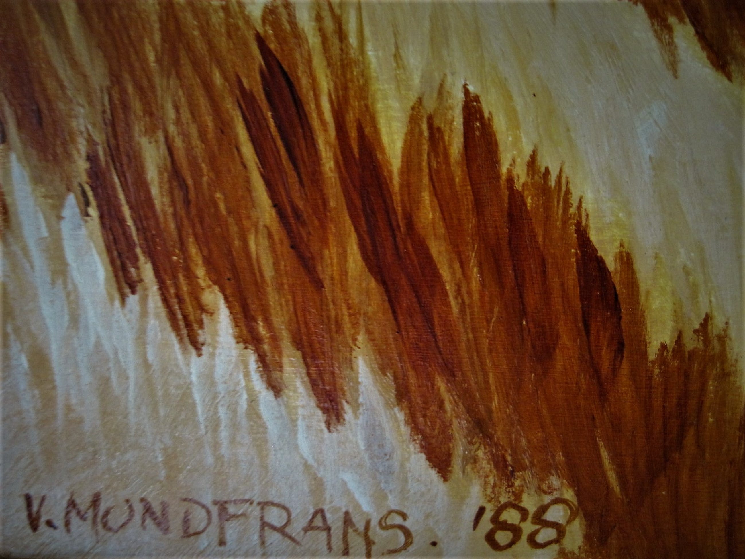 - Fascinerend olieverf op doek landschap met Zomerse voorstelling van een Frans landschap. Geschilderd door de bekende Noord Hollandse (Kolhorn) schilder Erna van Mondfrans (1931-). Haar stijl leunt erg tegen het Magisch Realisme aan. Hoe langer je naar het schilderij kijkt hoe meer het gaat leven.