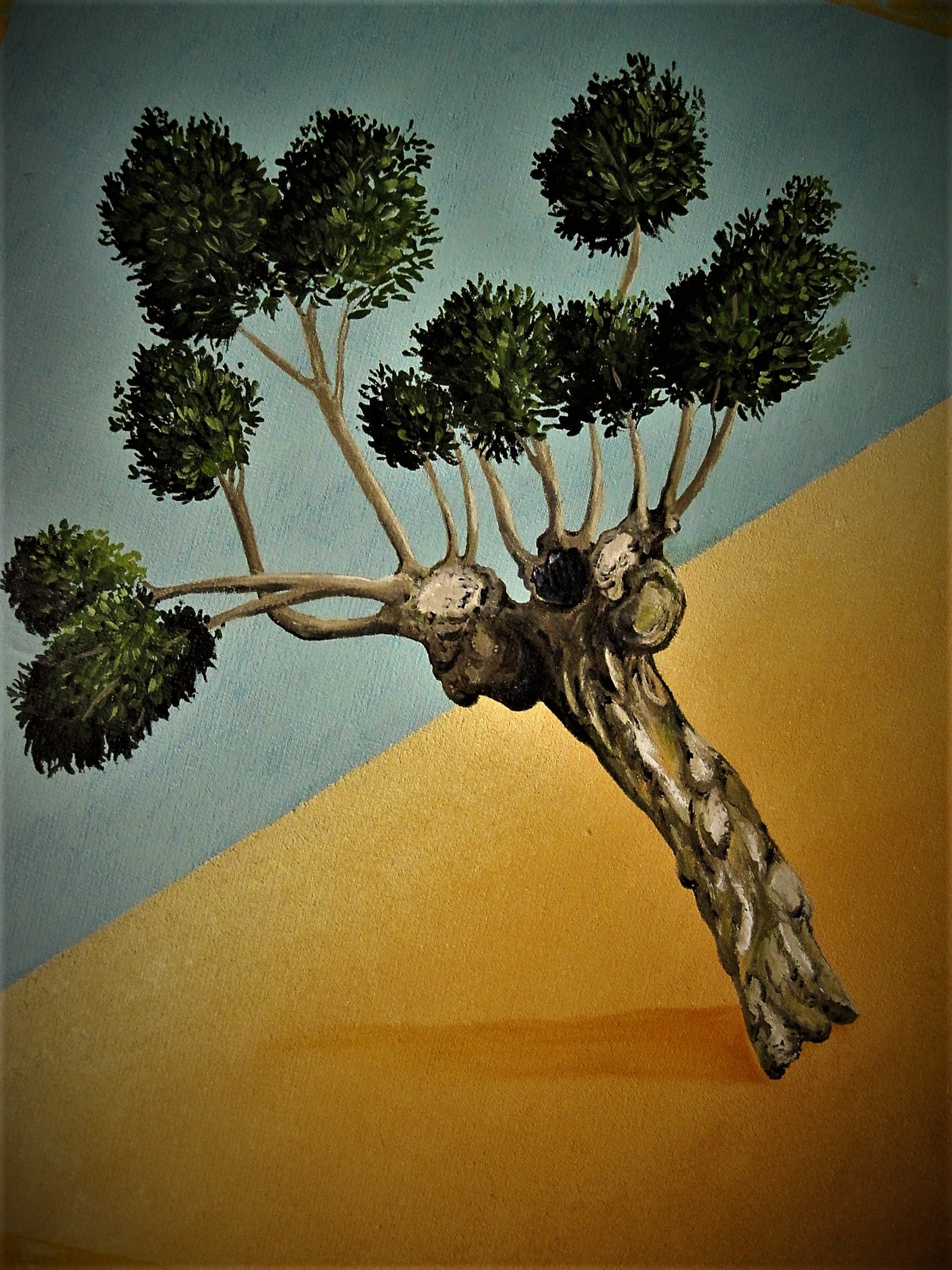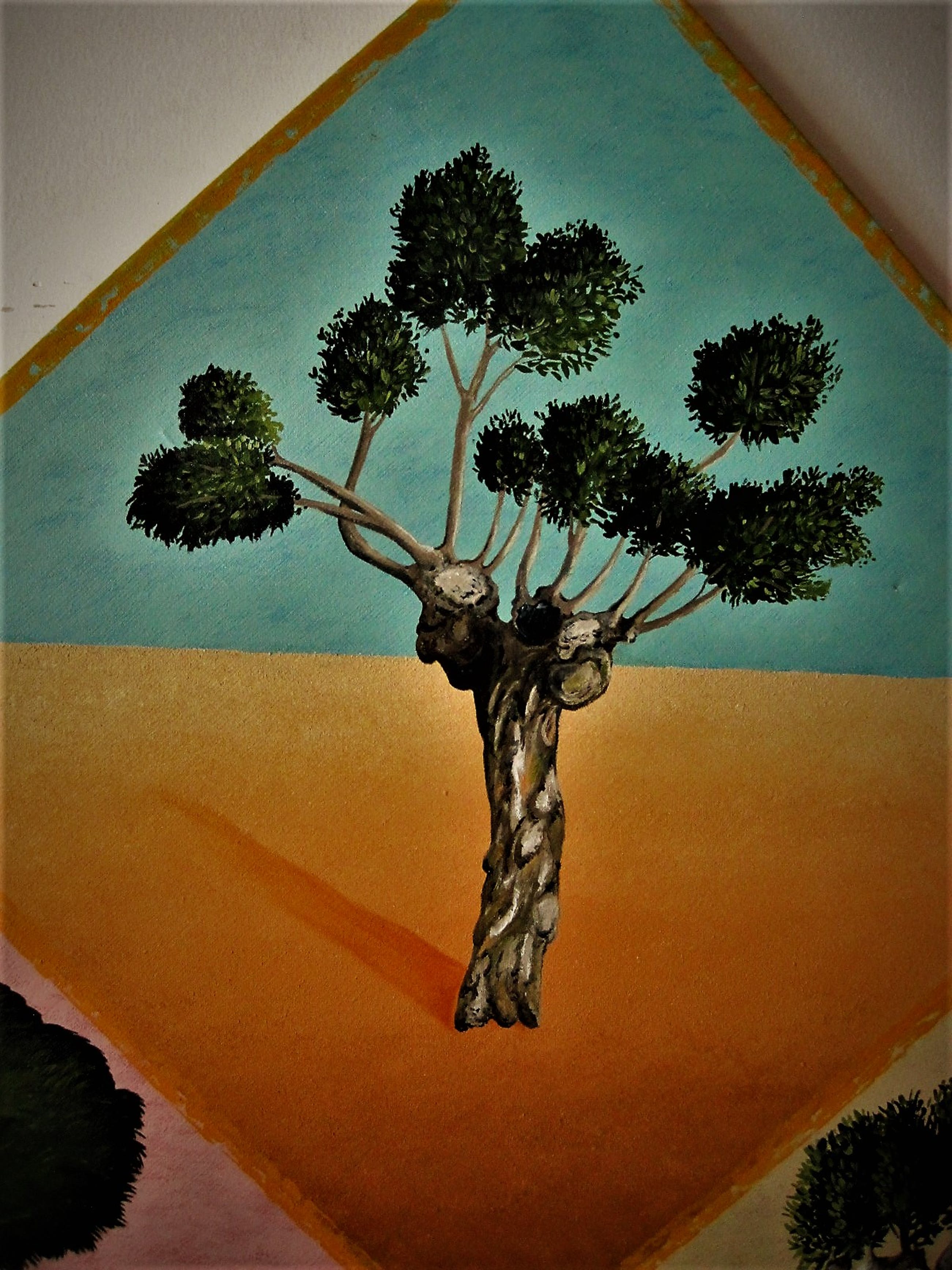 - GROOT (100 x 100 cm) verstild olieverf op doek. Geschilderd door de bekende Noord Hollandse (Kolhorn) schilder Erna van Mondfrans (1931-2019). Haar stijl leunt erg tegen het Magisch Realisme aan. Hoe langer je naar het schilderij kijkt hoe meer het gaat leven.