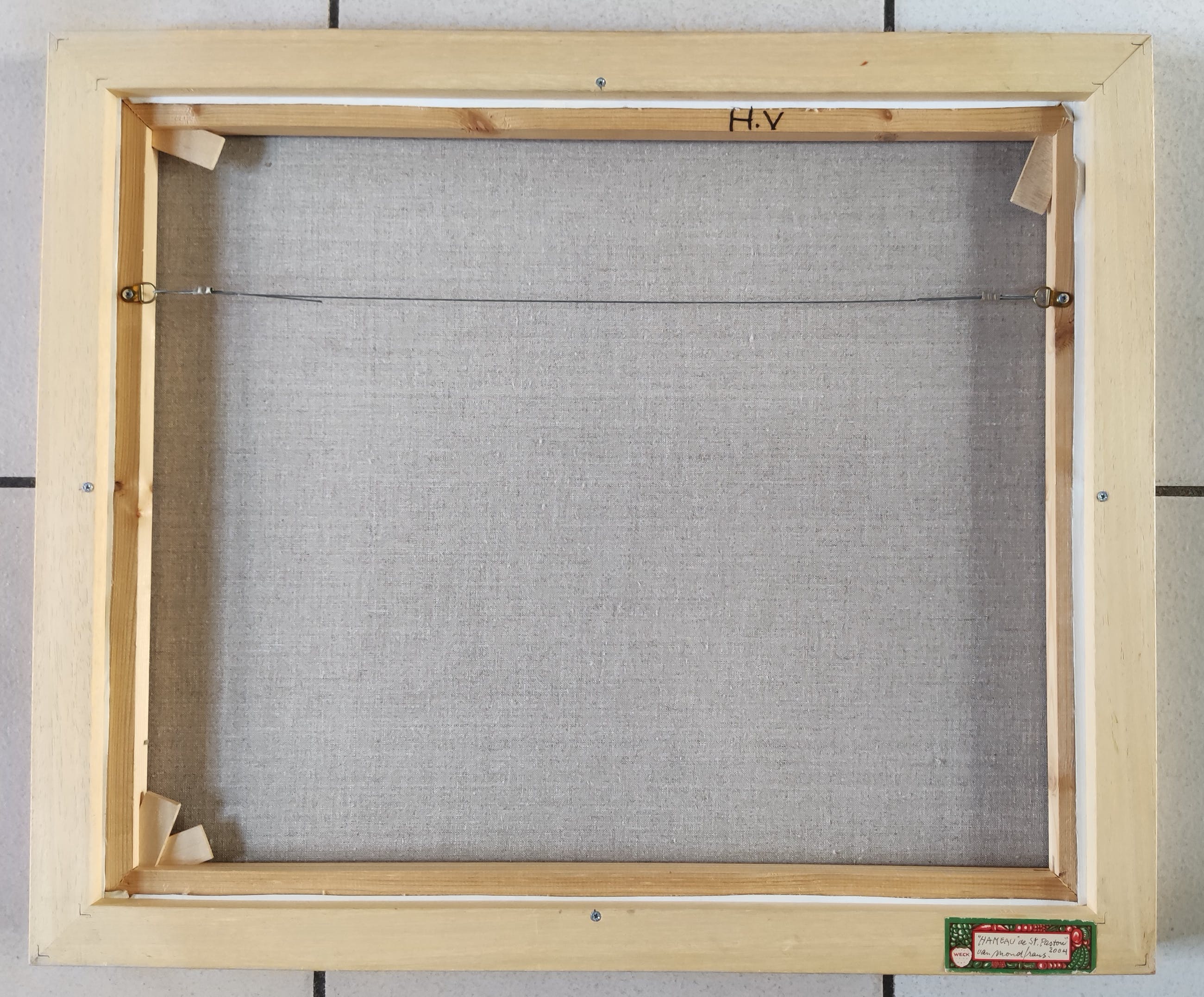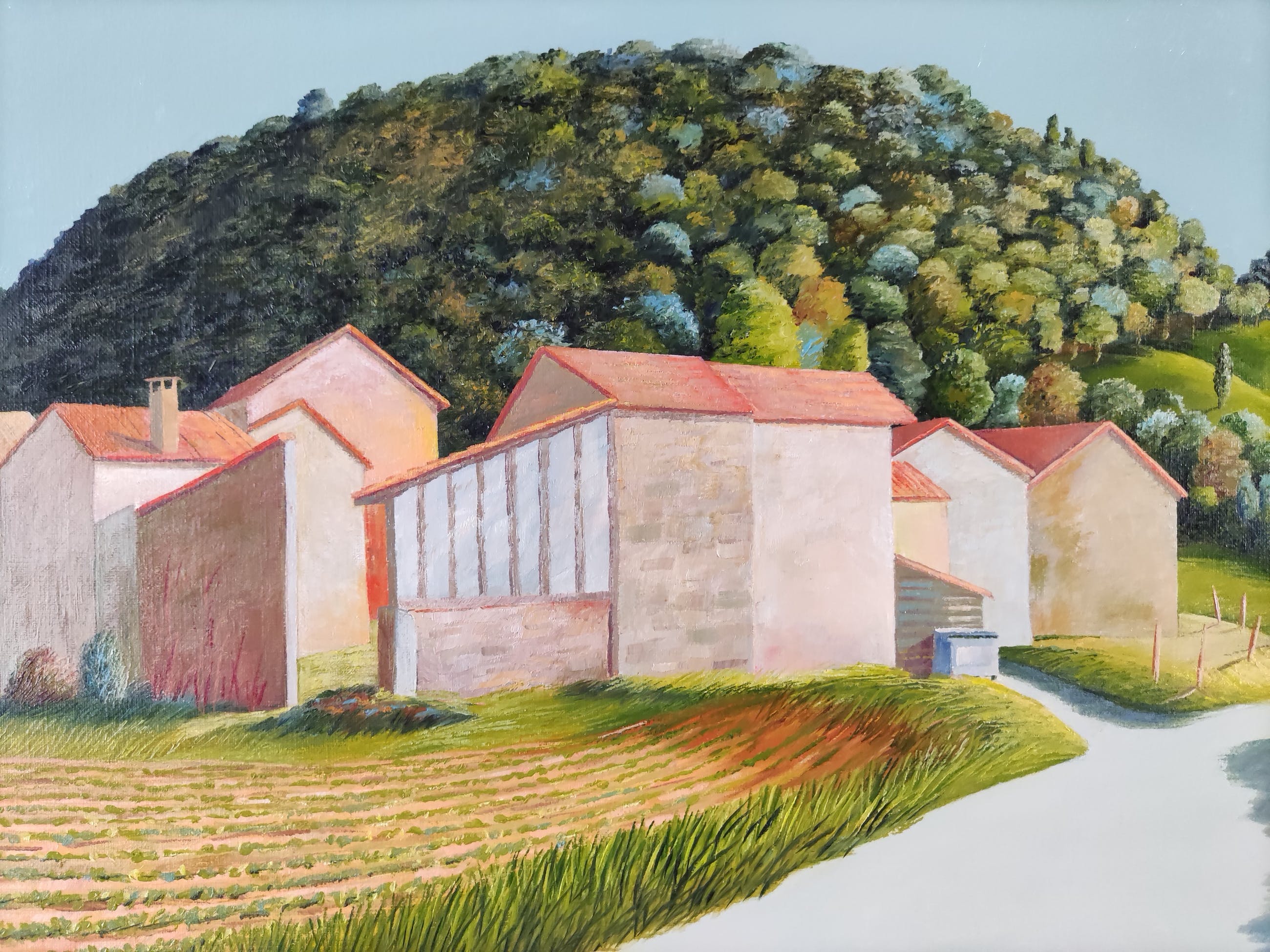 Olieverf op doek voorstellende een hameau (buurtschap) genaamd St. Pastou in het departement Lot-et-Garonne in Frankrijk. Gesigneerd rechtsonder. Gedateerd 2004 linksonder. Doekmaat 50x60 cm. Maat van de baklijst 53,5x63,5 cm. Erna van Mondfrans-van Os werd geboren te Hilversum op 24 mei 1931 en overleed te Kolhorn op 9 oktober 2019. Opleiding aan de Gerrit Rietveld Academie te Amsterdam voor illustreren en grafiek. Als schilder autodidact.