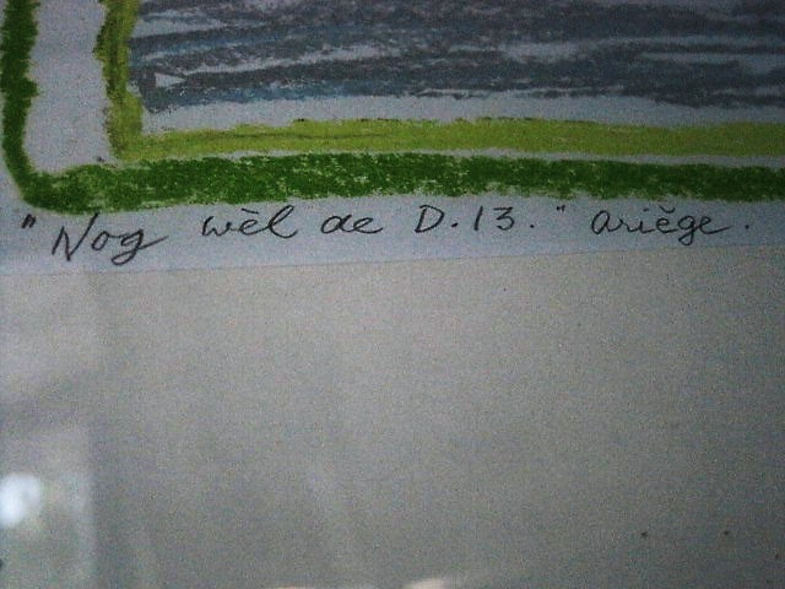 - Gesigneerde Gouache (dekkende waterverf) met voorstelling van een Frans landschap bij Ariege. Geschilderd door de bekende Noord Hollandse (Kolhorn) schilder Erna van Mondfrans (1931-). Haar stijl leunt erg tegen het Magisch Realisme aan. Hoe langer je naar het schilderij kijkt hoe meer het gaat leven.