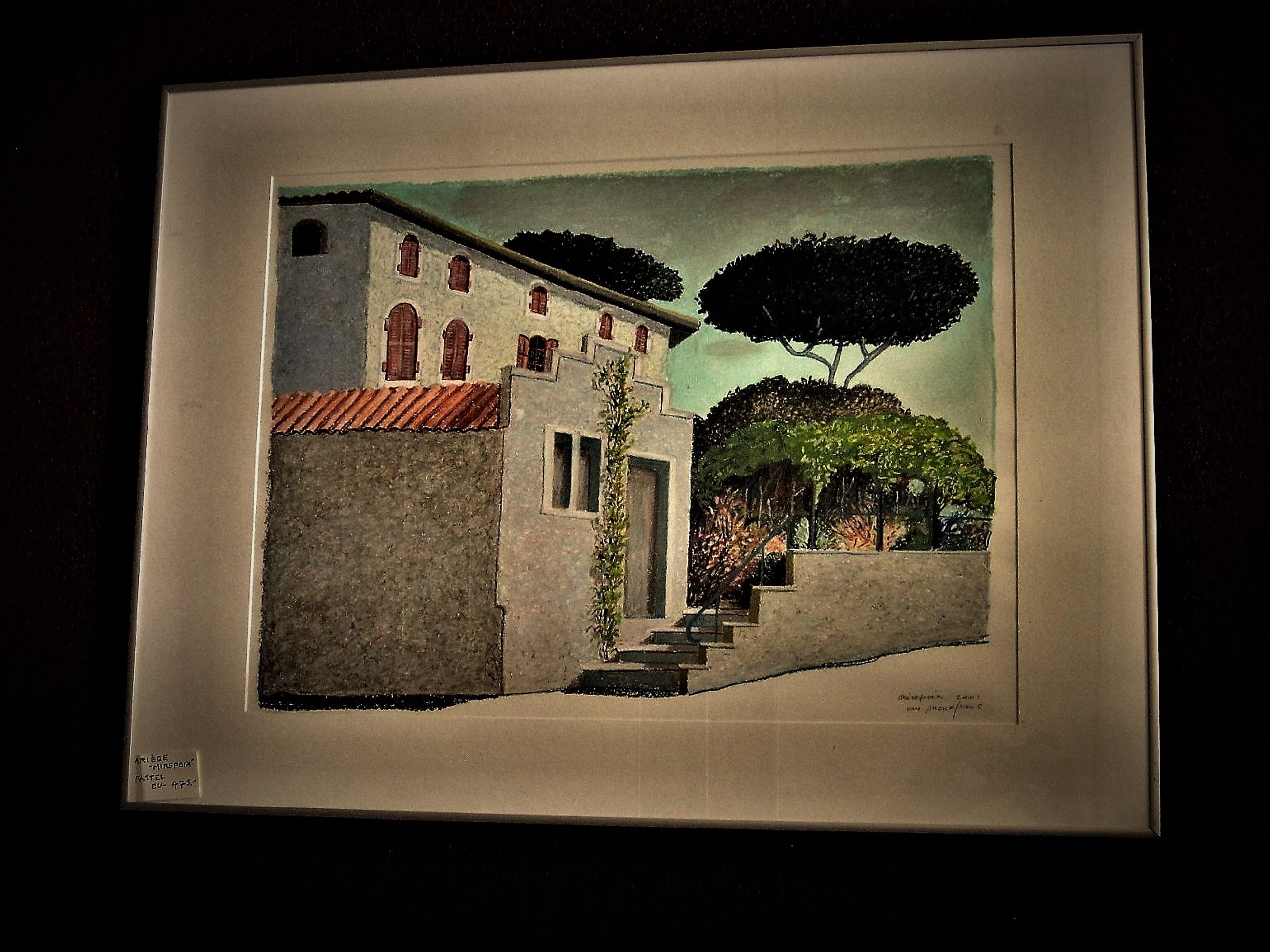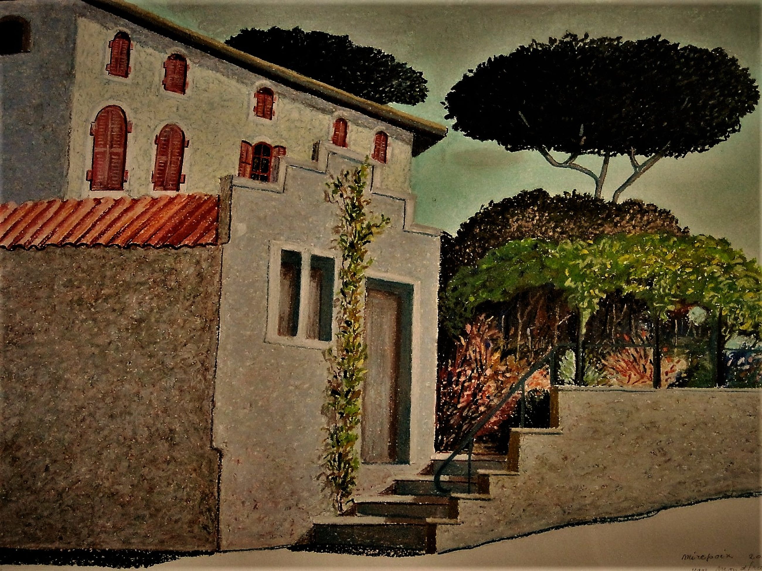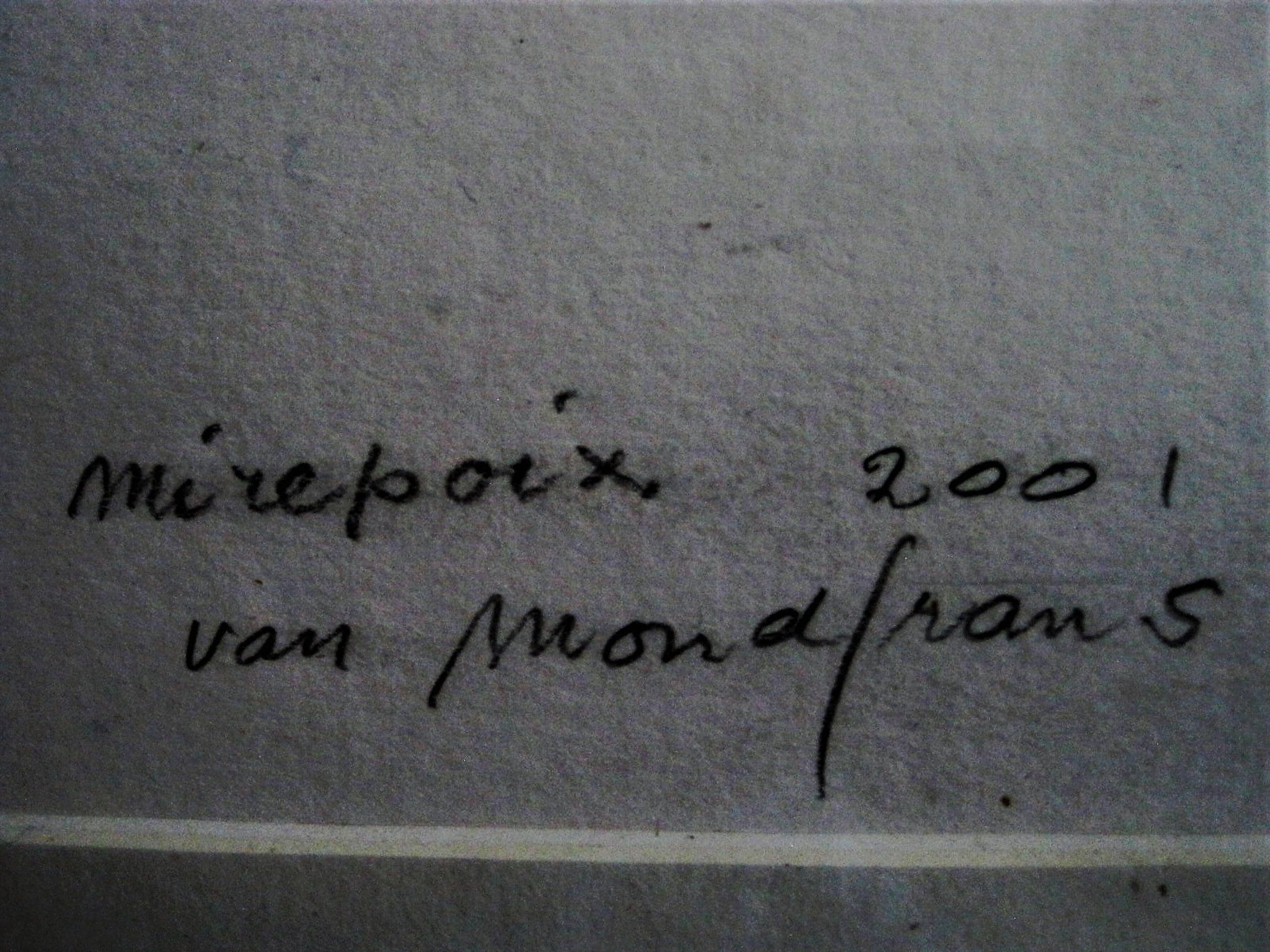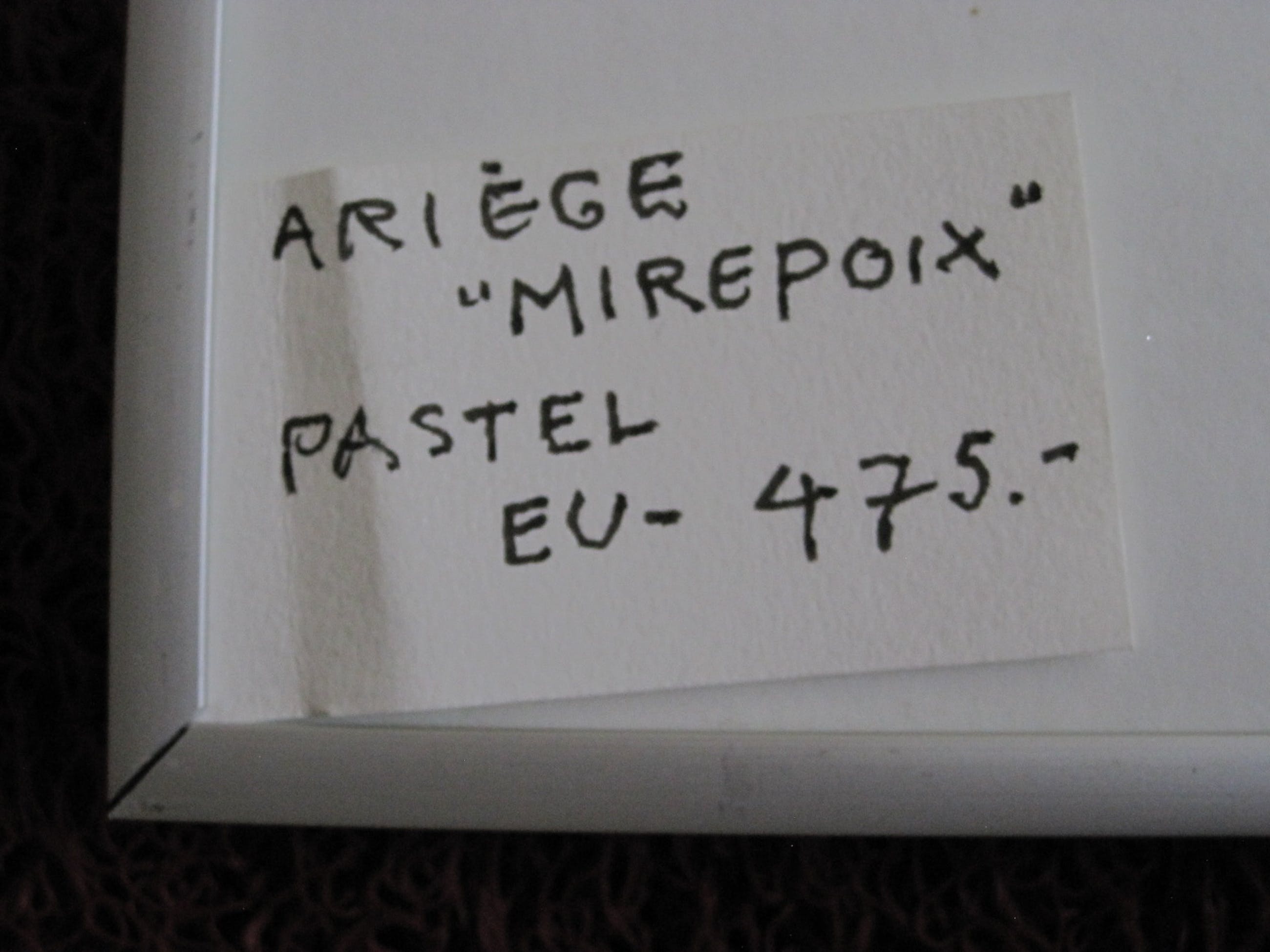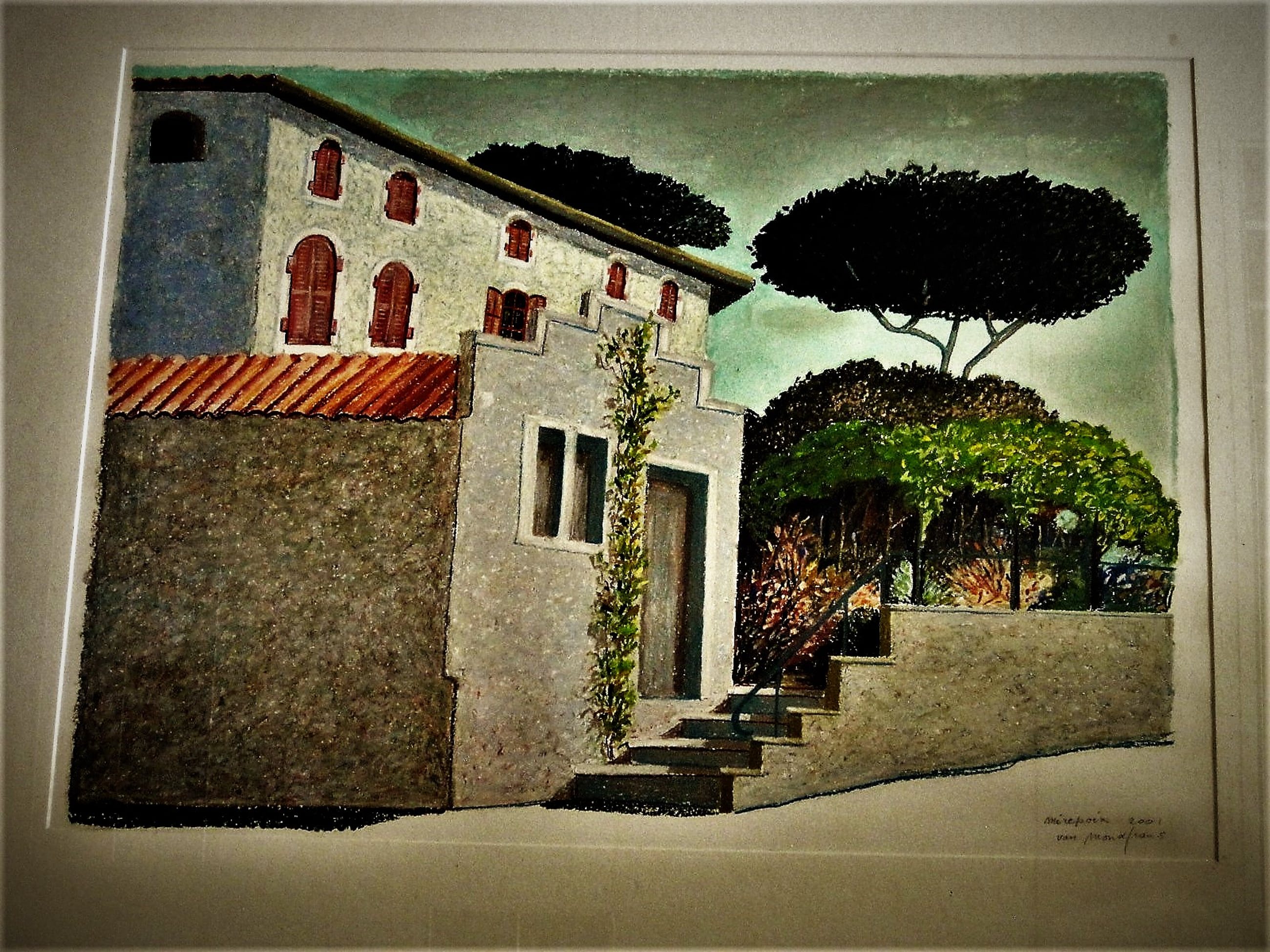 - Gesigneerde Gouache (dekkende waterverf) met voorstelling van een Frans landschap bij Ariege. Geschilderd door de bekende Noord Hollandse (Kolhorn) schilder Erna van Mondfrans (1931-). Haar stijl leunt erg tegen het Magisch Realisme aan. Hoe langer je naar het schilderij kijkt hoe meer het gaat leven.