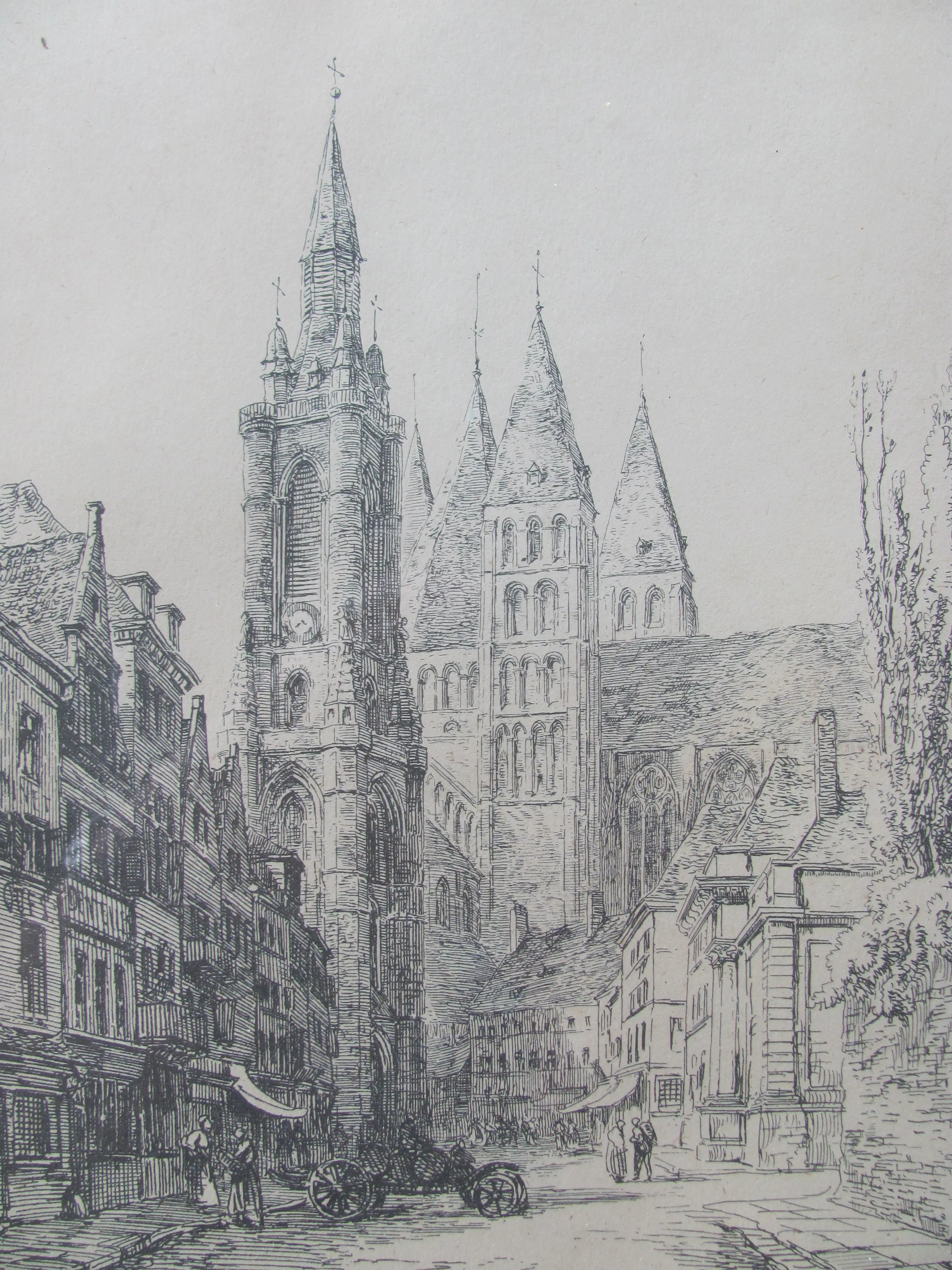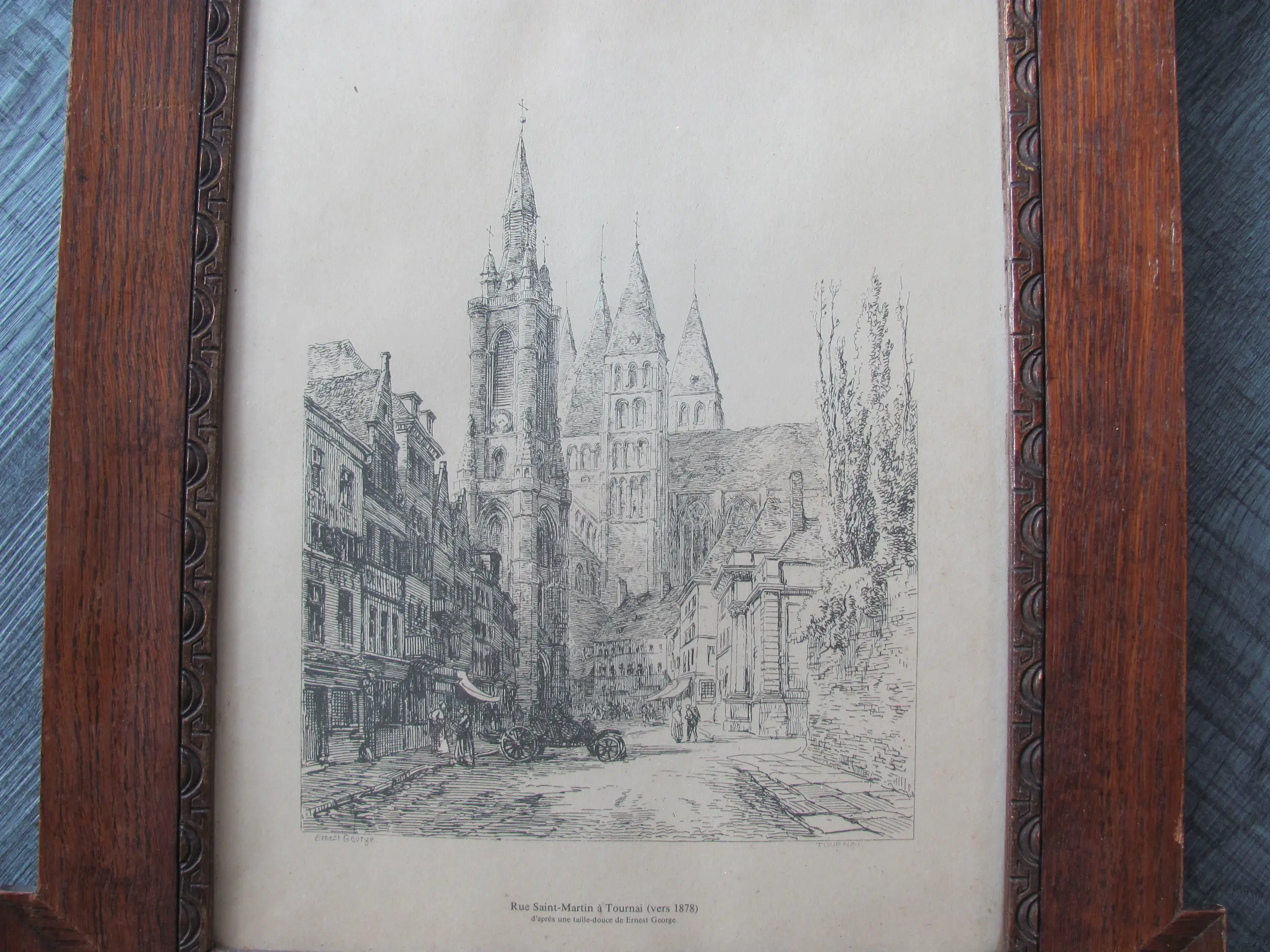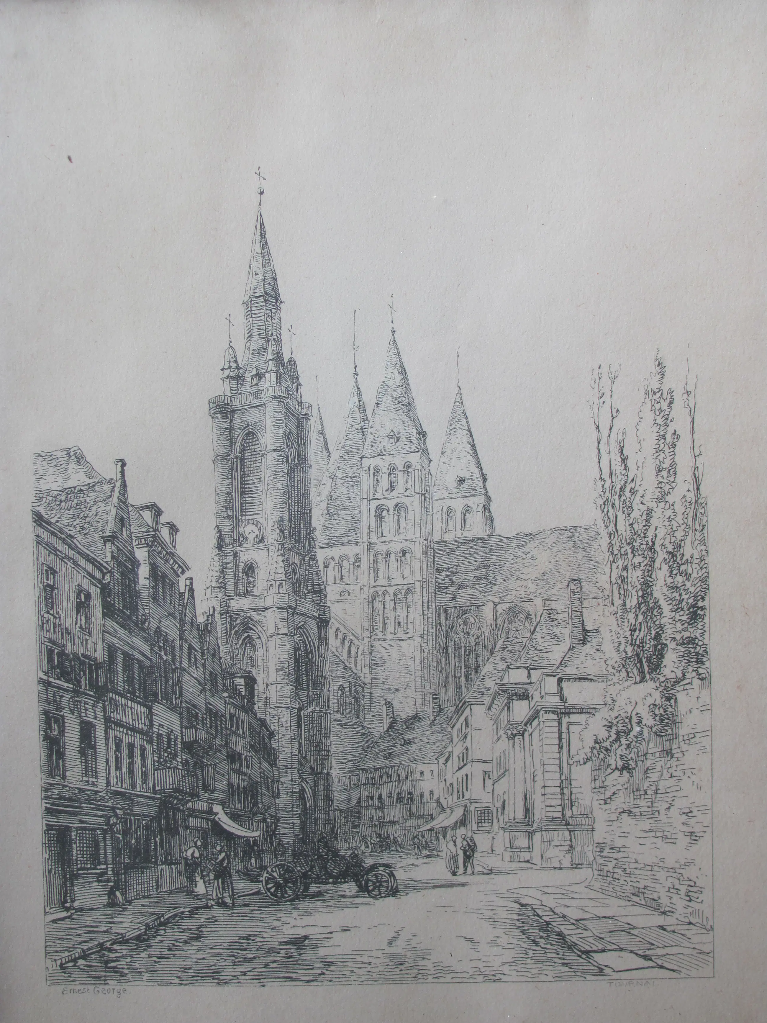 Mooi stadsgezicht van Tournai (Doornik) in 1878. Onder de gravure linksonder gesigneerd door Ernest George. In de oude lijst uit België.