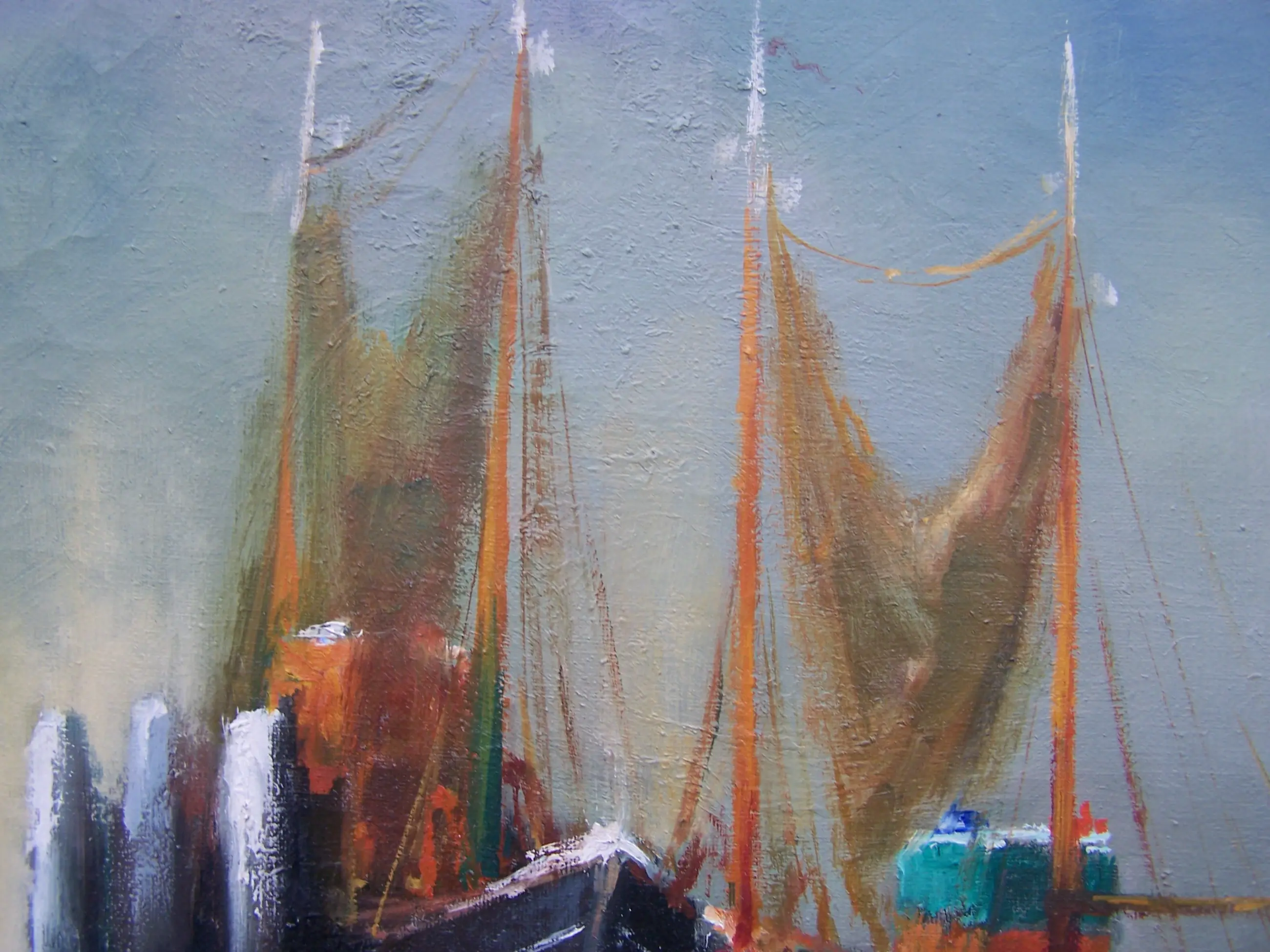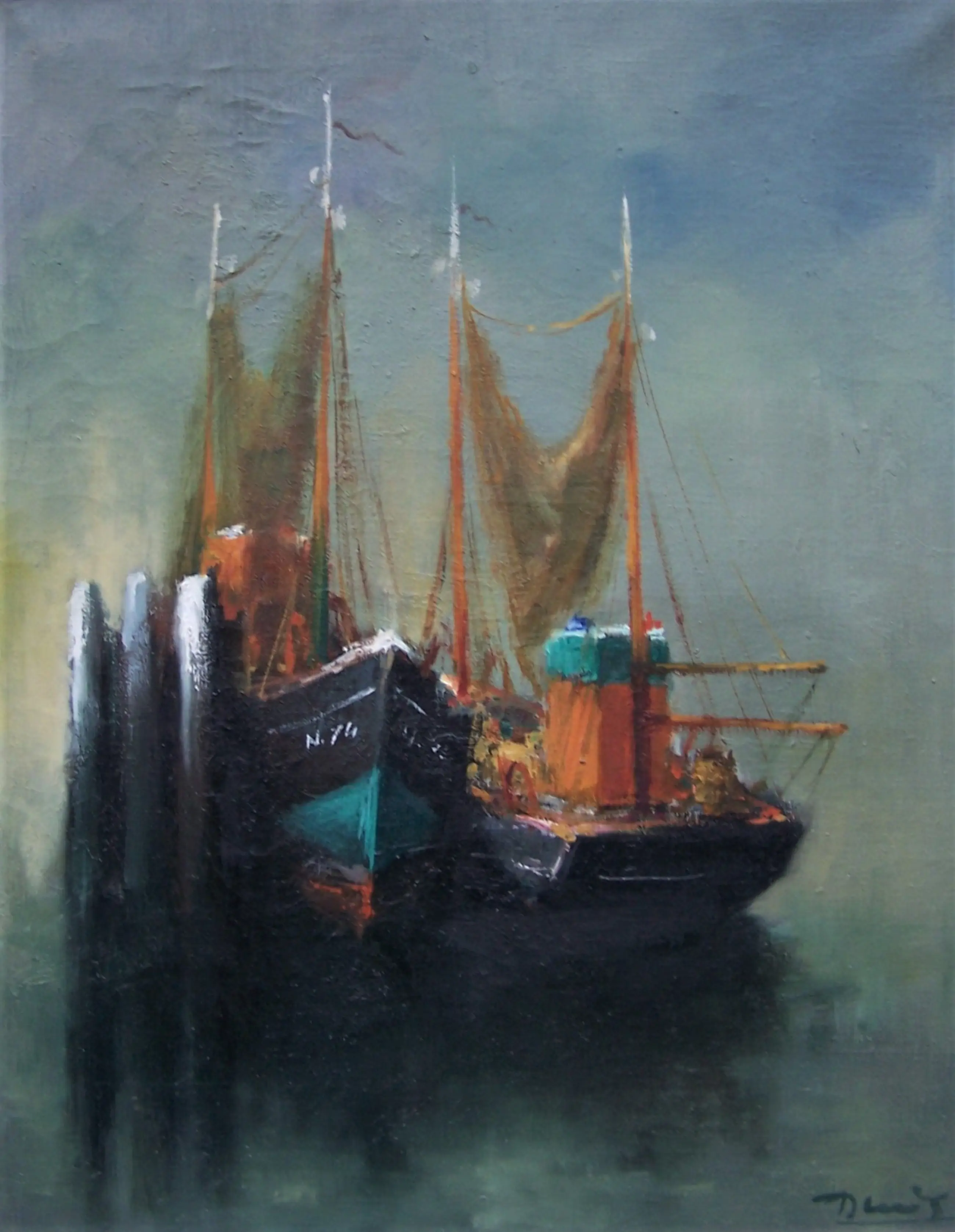 Prachtig verstild tafereel van twee vissersschepen voor anker.