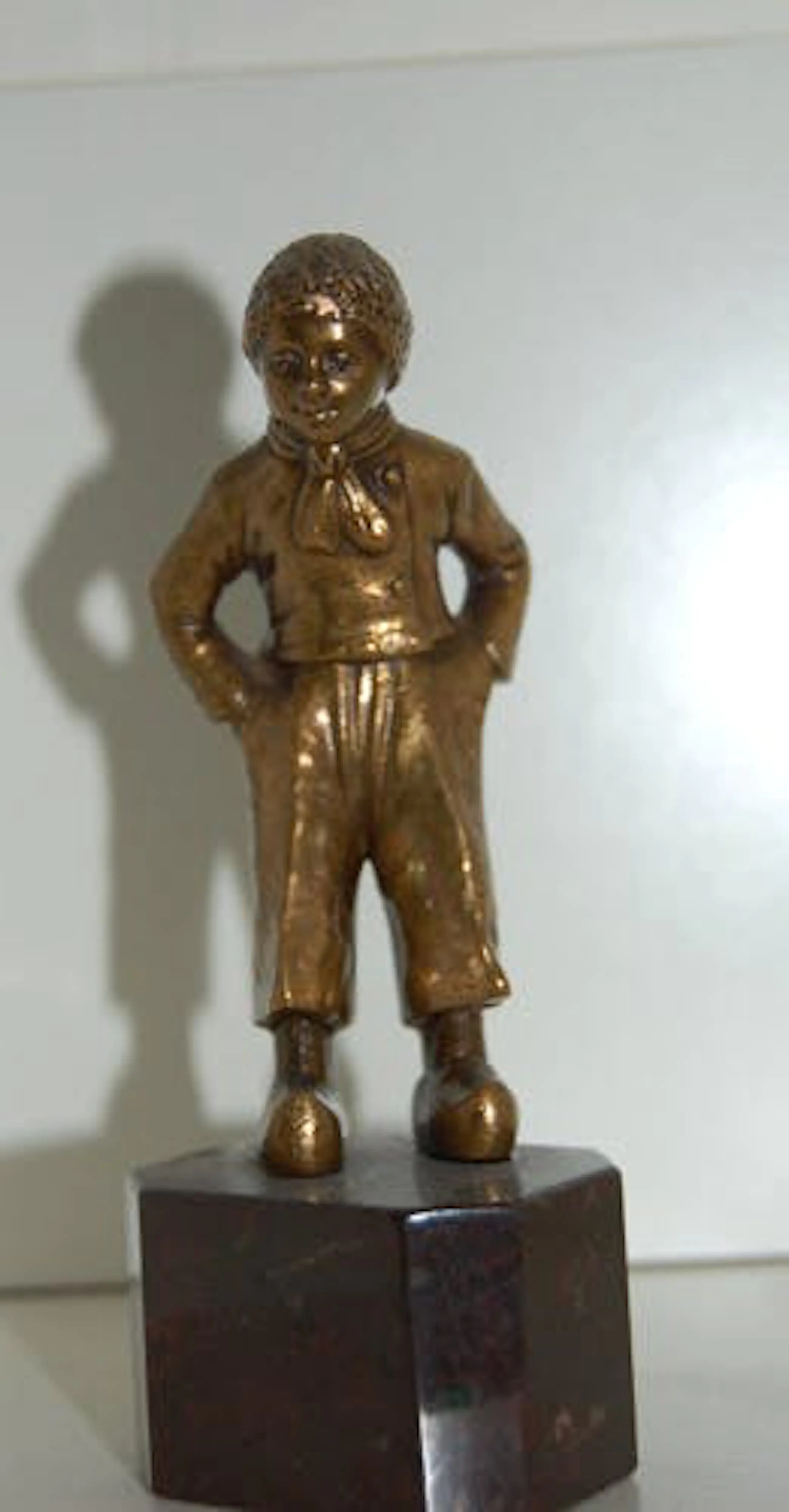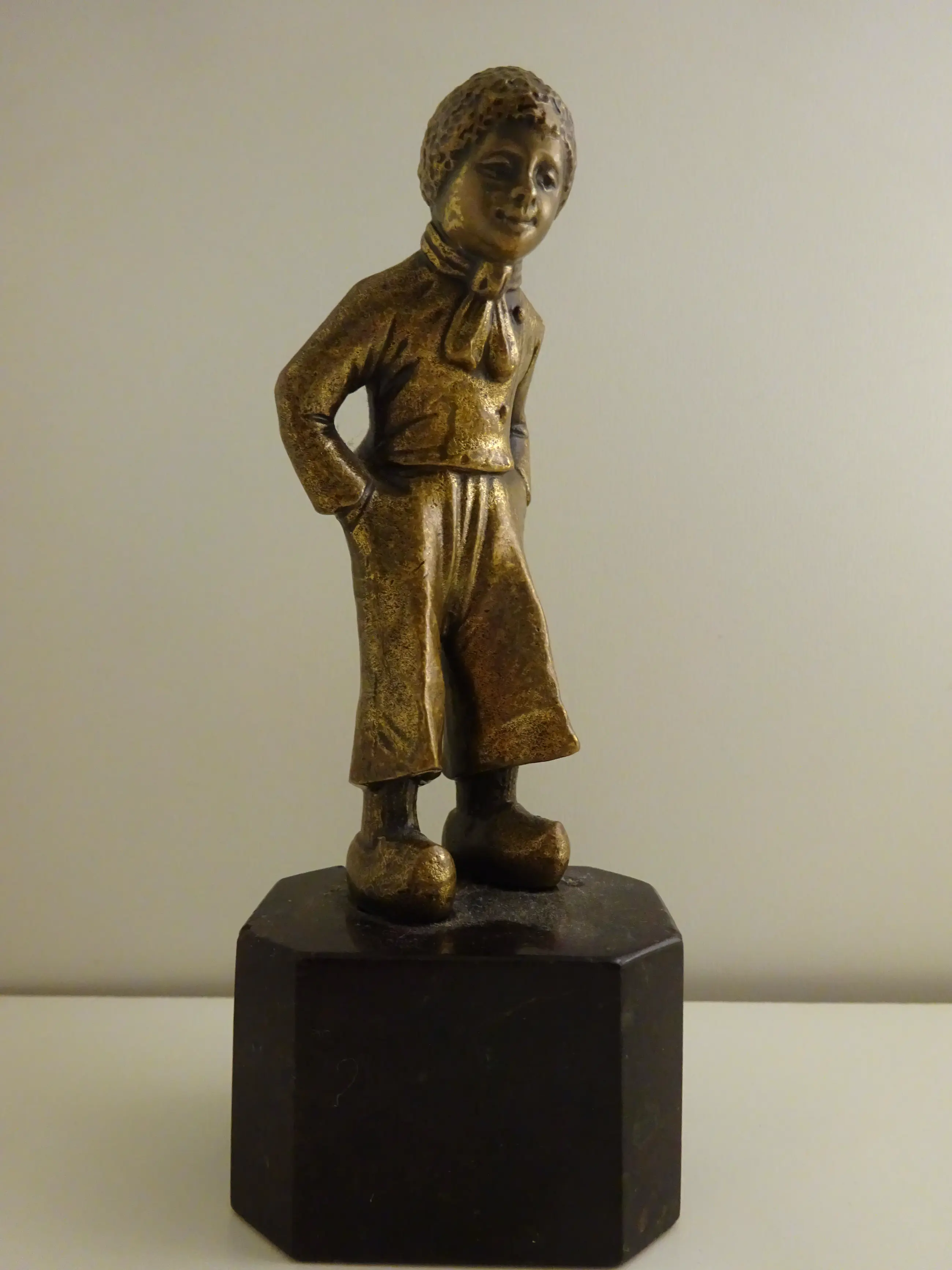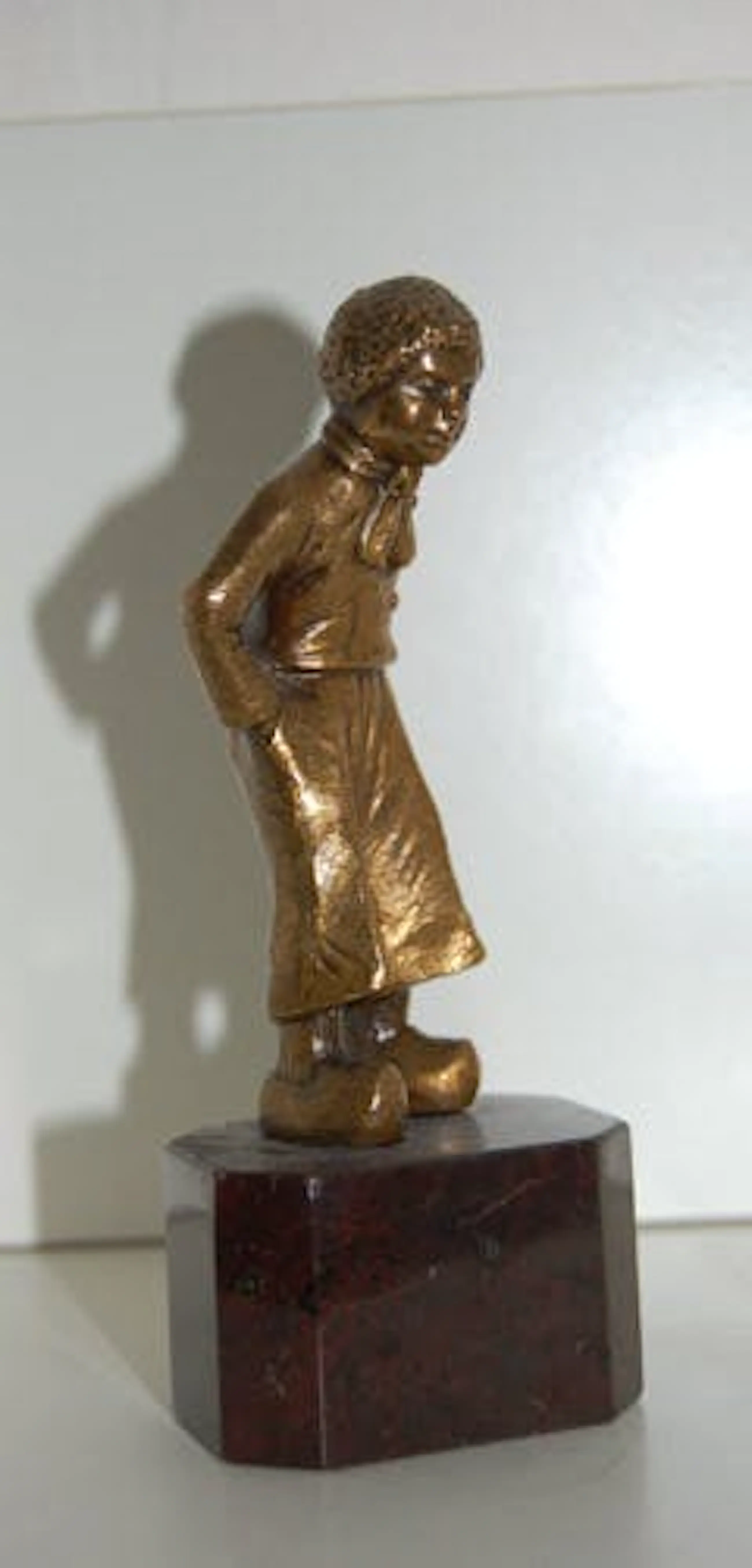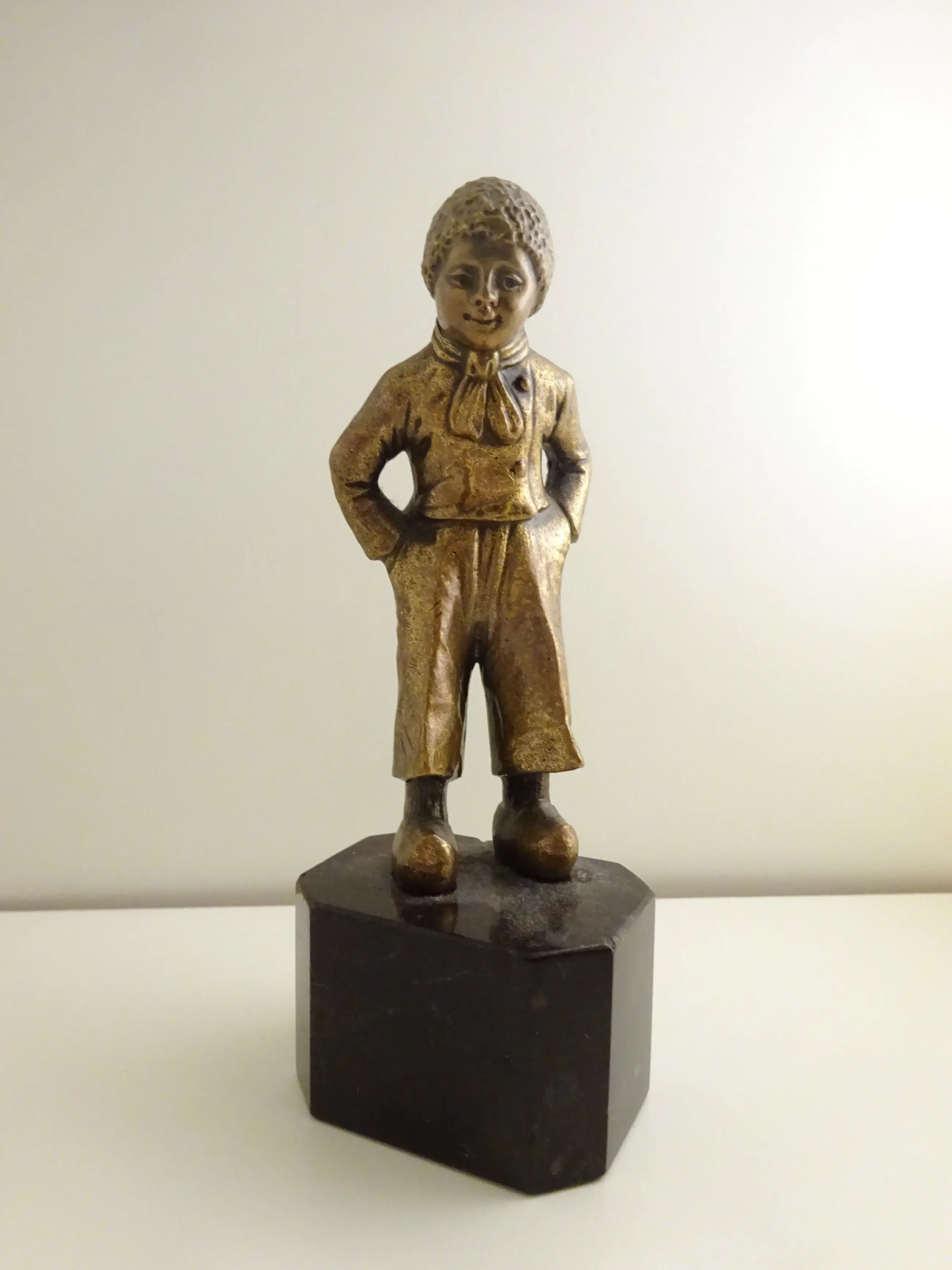 Bronzen jongen uit Volendam in klederdracht op natuurstenen sokkel Kunstenaar: Ernst Beck 1879-1941 Land: Oostenrijk Jaar: begin 1900 Hoogte: 9 cm zonder sokkel en totaal 12 cm Conditie: brons uitstekend, mooie goudkleurige patine, sokkel lichte gebruikssporen
