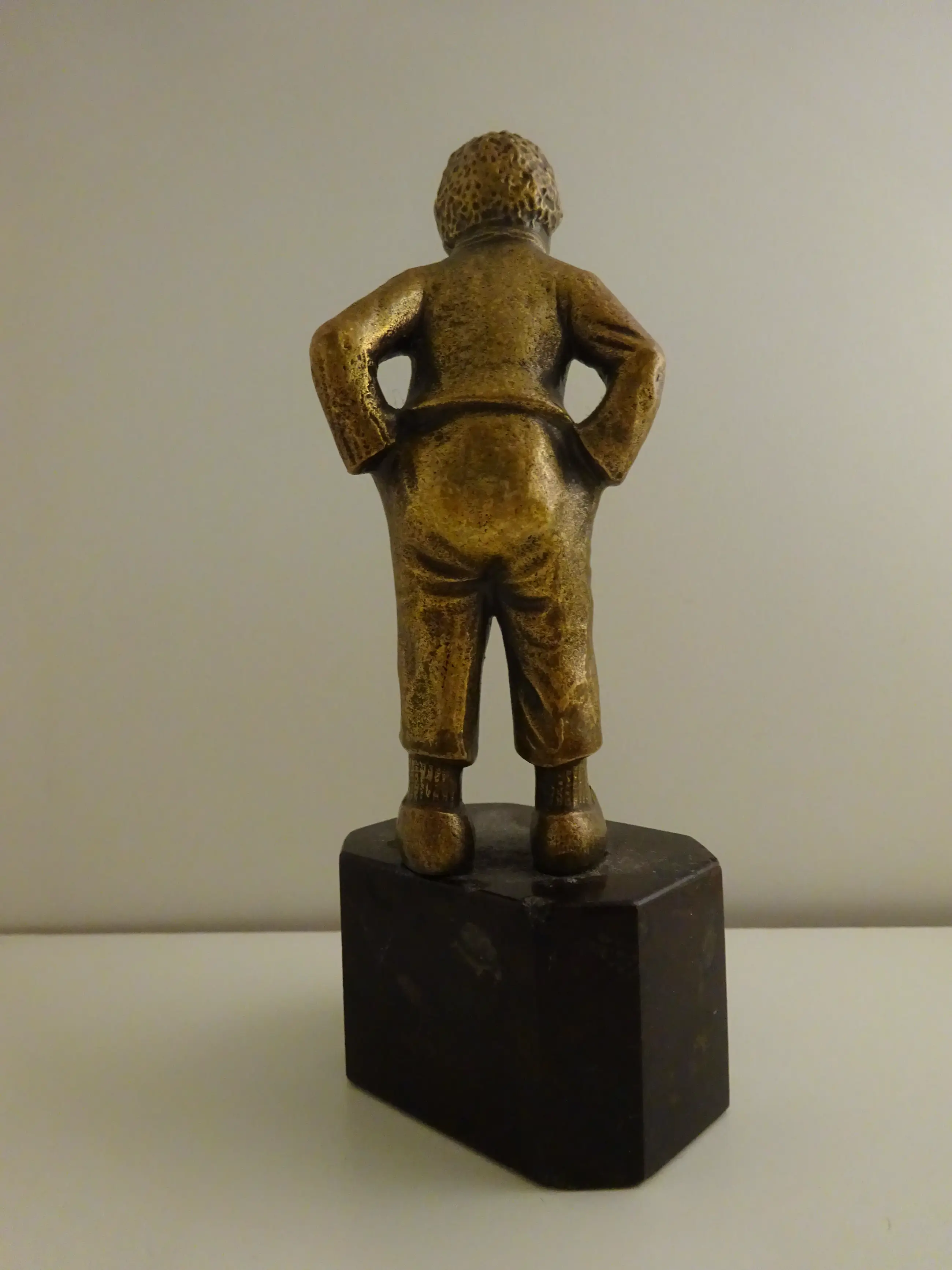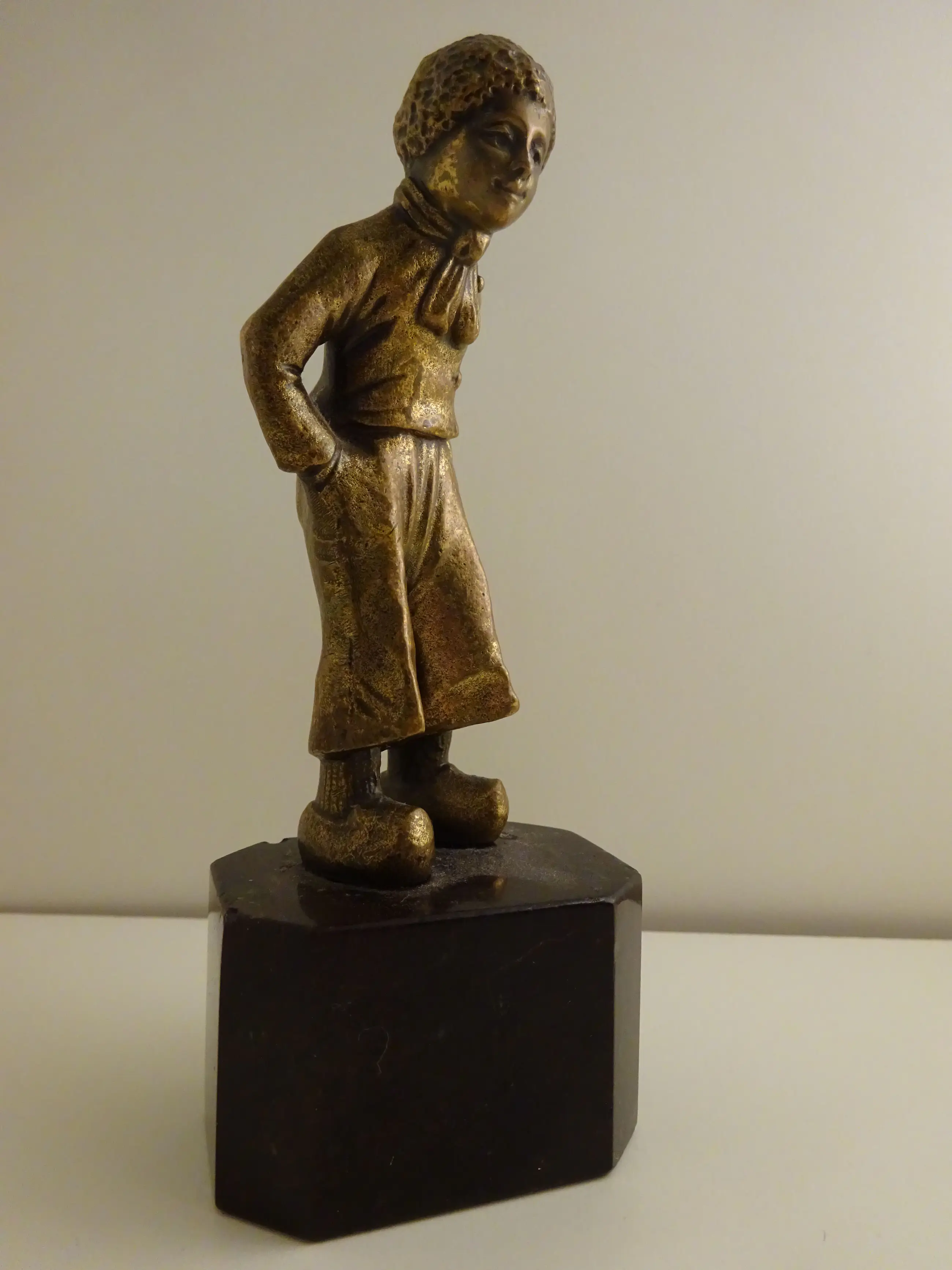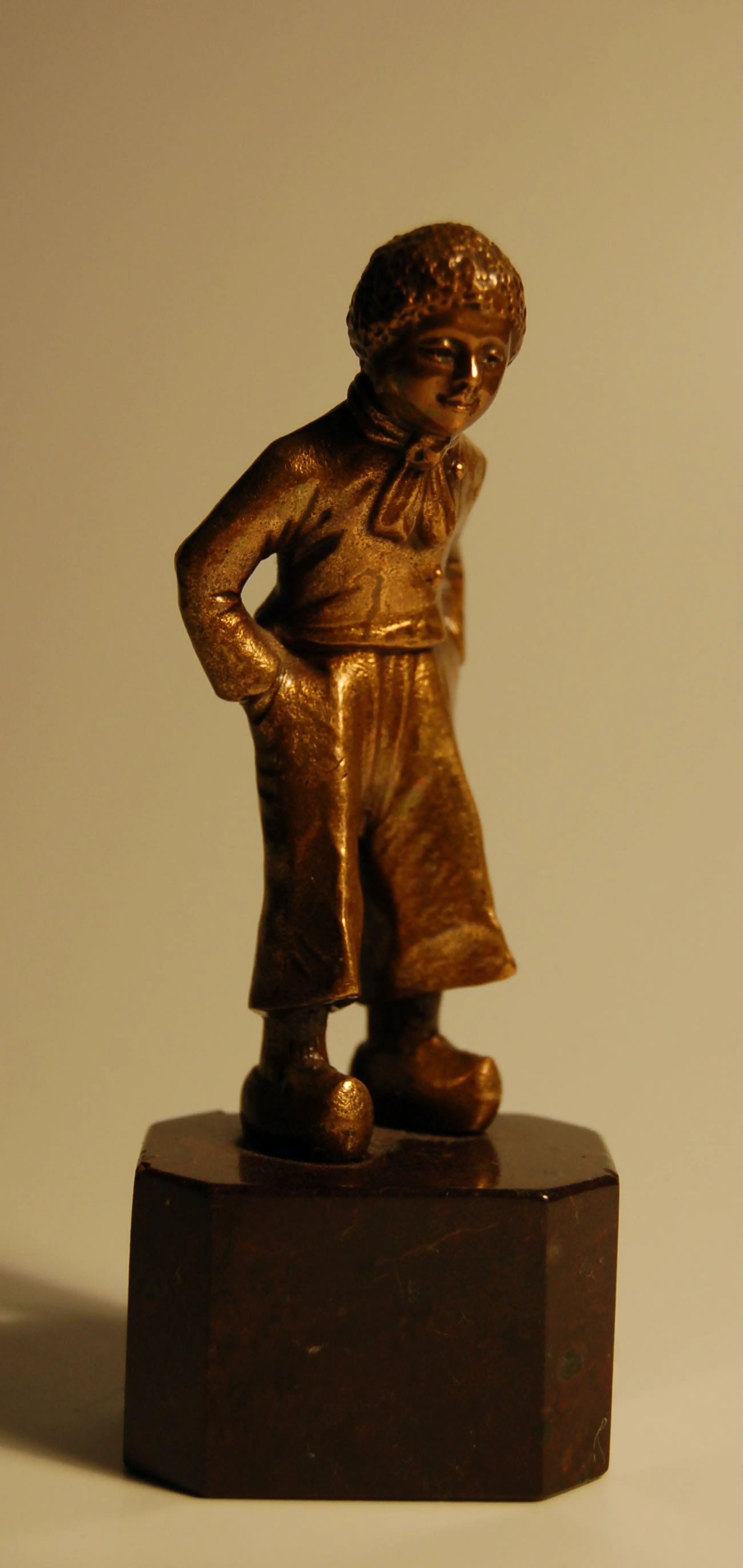 Bronzen jongen uit Volendam in klederdracht op natuurstenen sokkel Kunstenaar: Ernst Beck 1879-1941 Land: Oostenrijk Jaar: begin 1900 Hoogte: 9 cm zonder sokkel en totaal 12 cm Conditie: brons uitstekend, mooie goudkleurige patine, sokkel lichte gebruikssporen