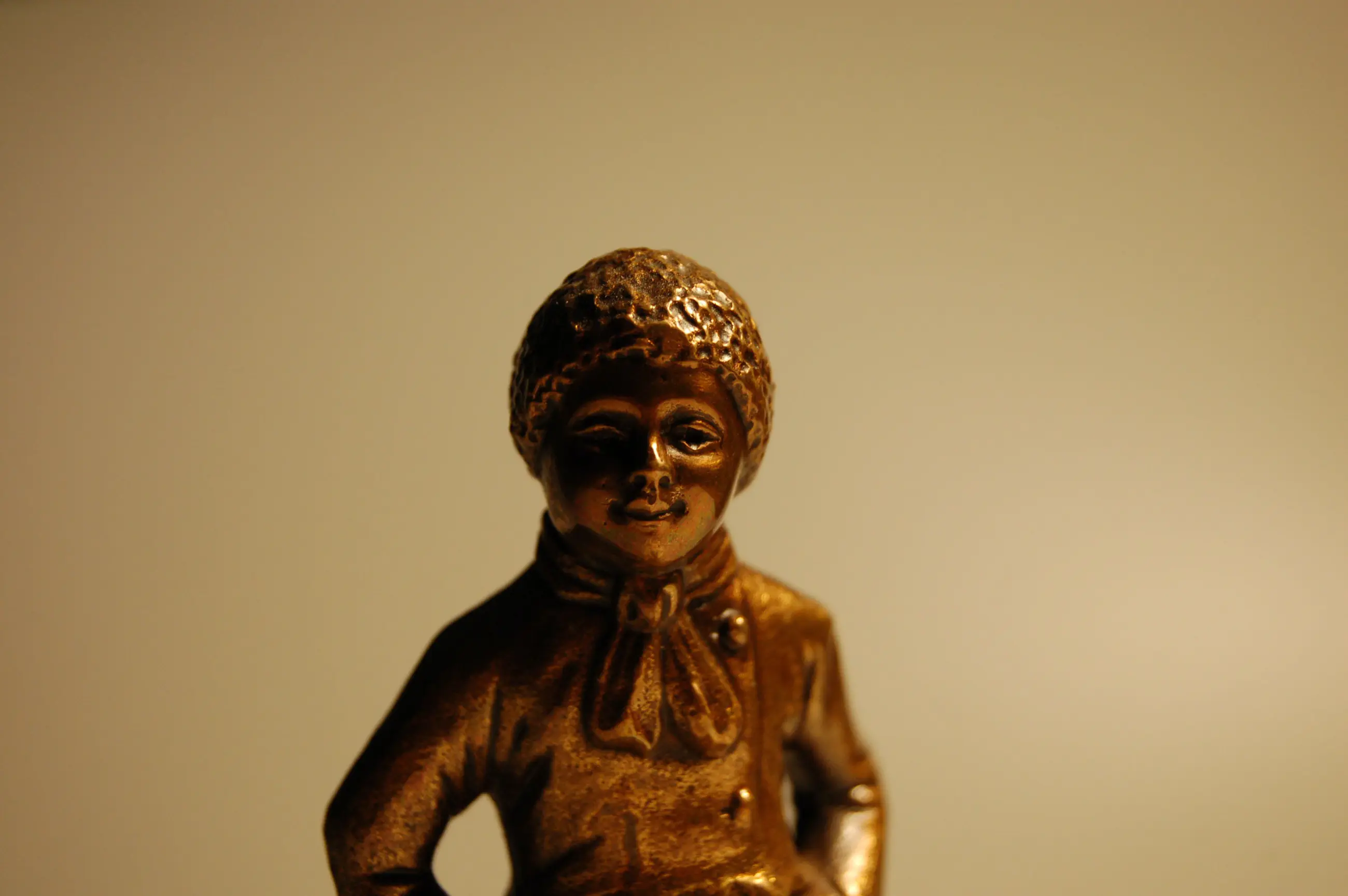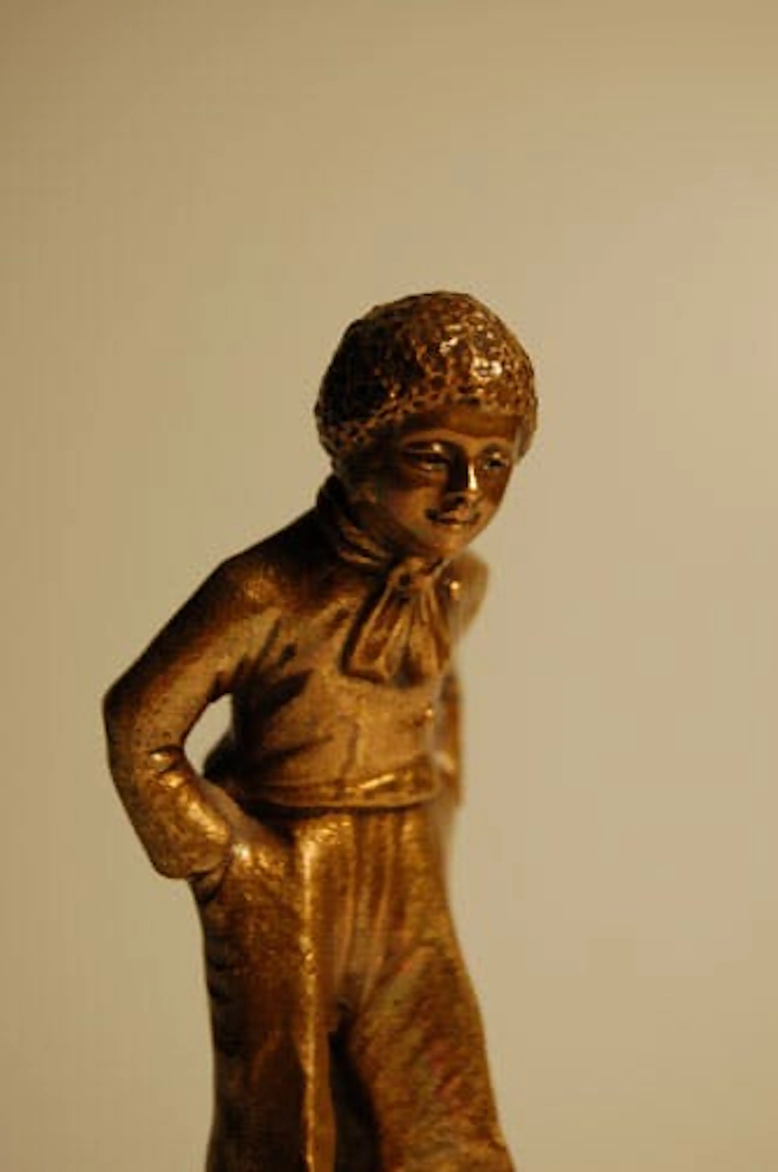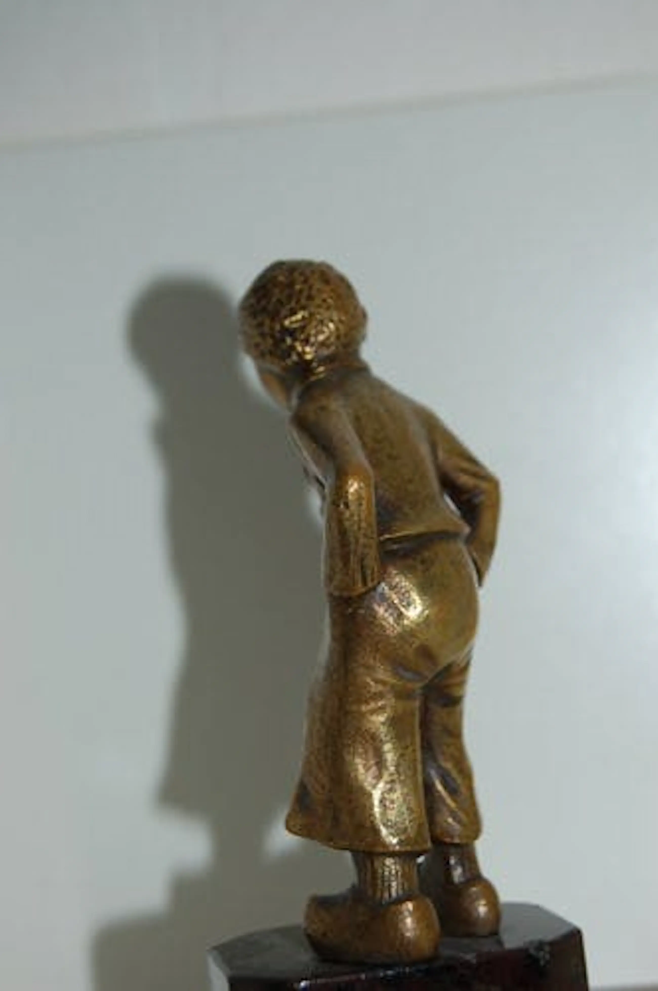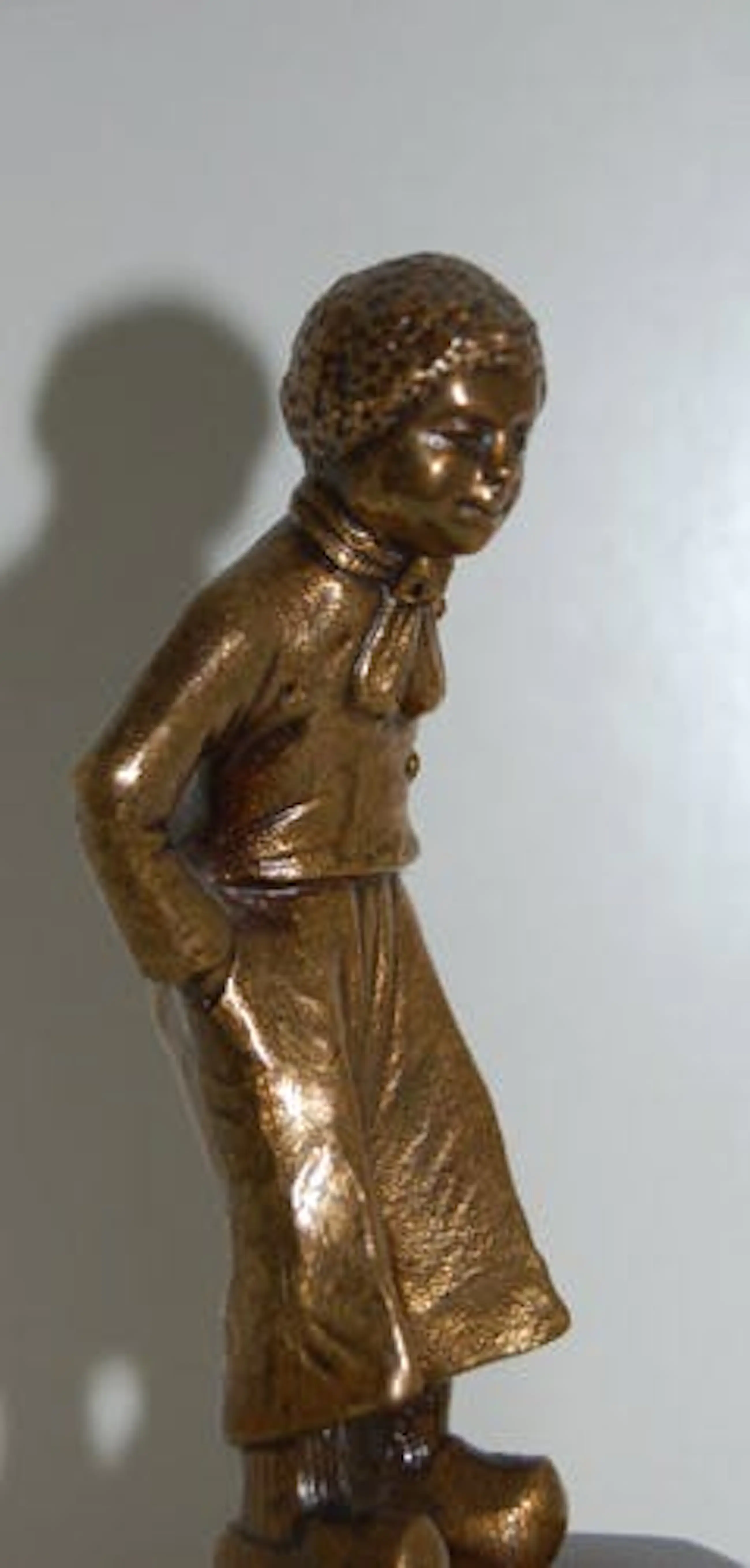 Bronzen jongen uit Volendam in klederdracht op natuurstenen sokkel Kunstenaar: Ernst Beck 1879-1941 Land: Oostenrijk Jaar: begin 1900 Hoogte: 9 cm zonder sokkel en totaal 12 cm Conditie: brons uitstekend, mooie goudkleurige patine, sokkel lichte gebruikssporen