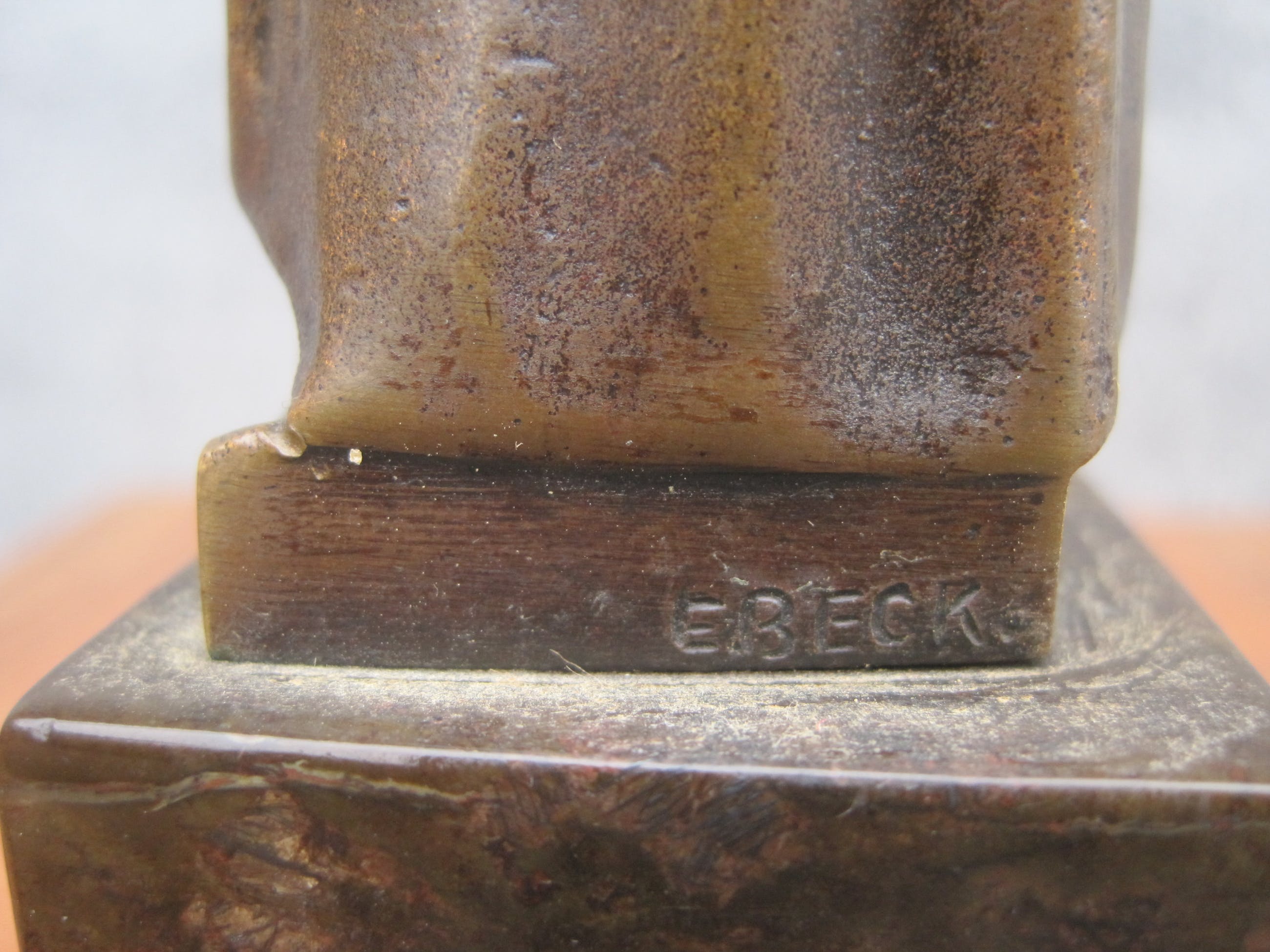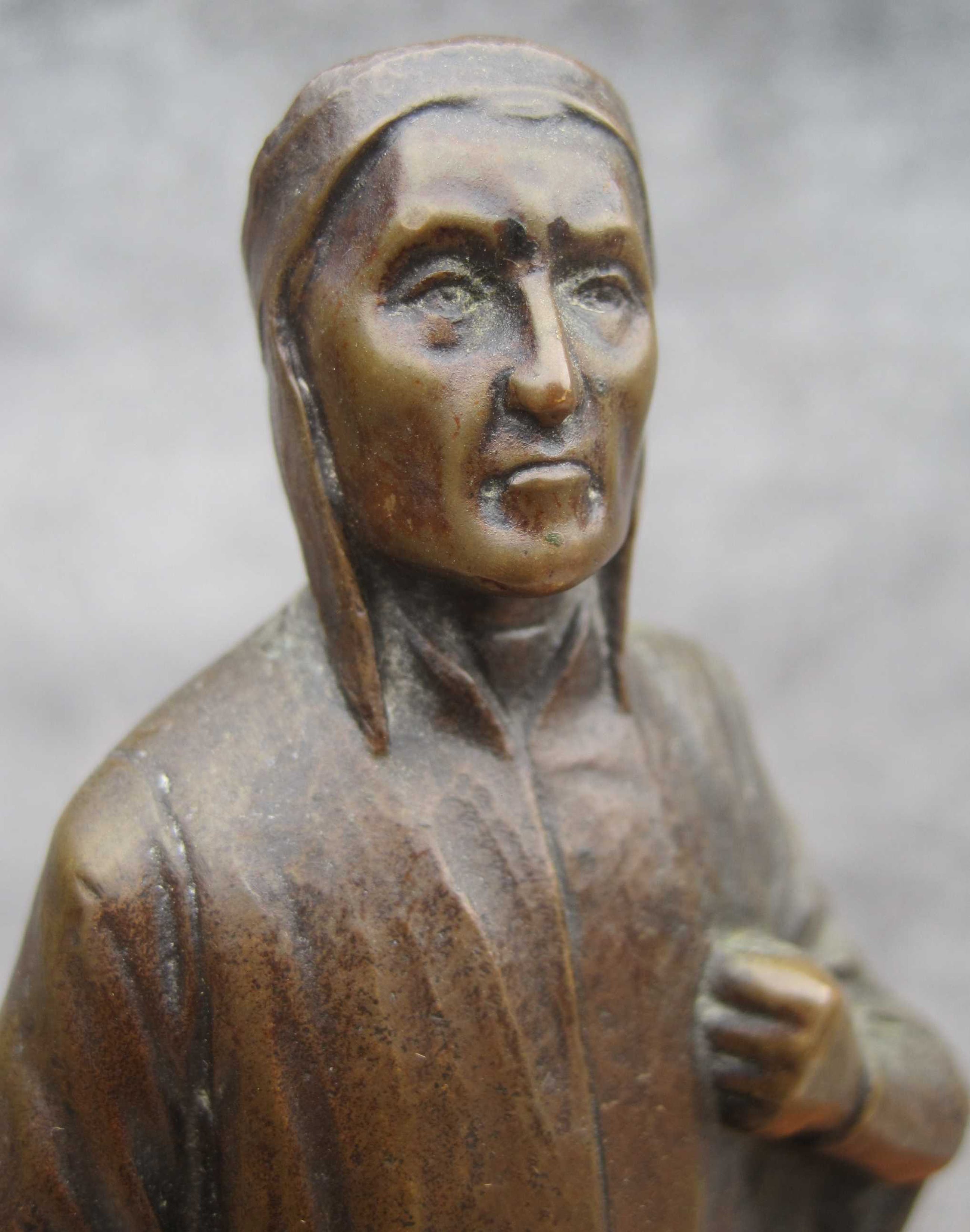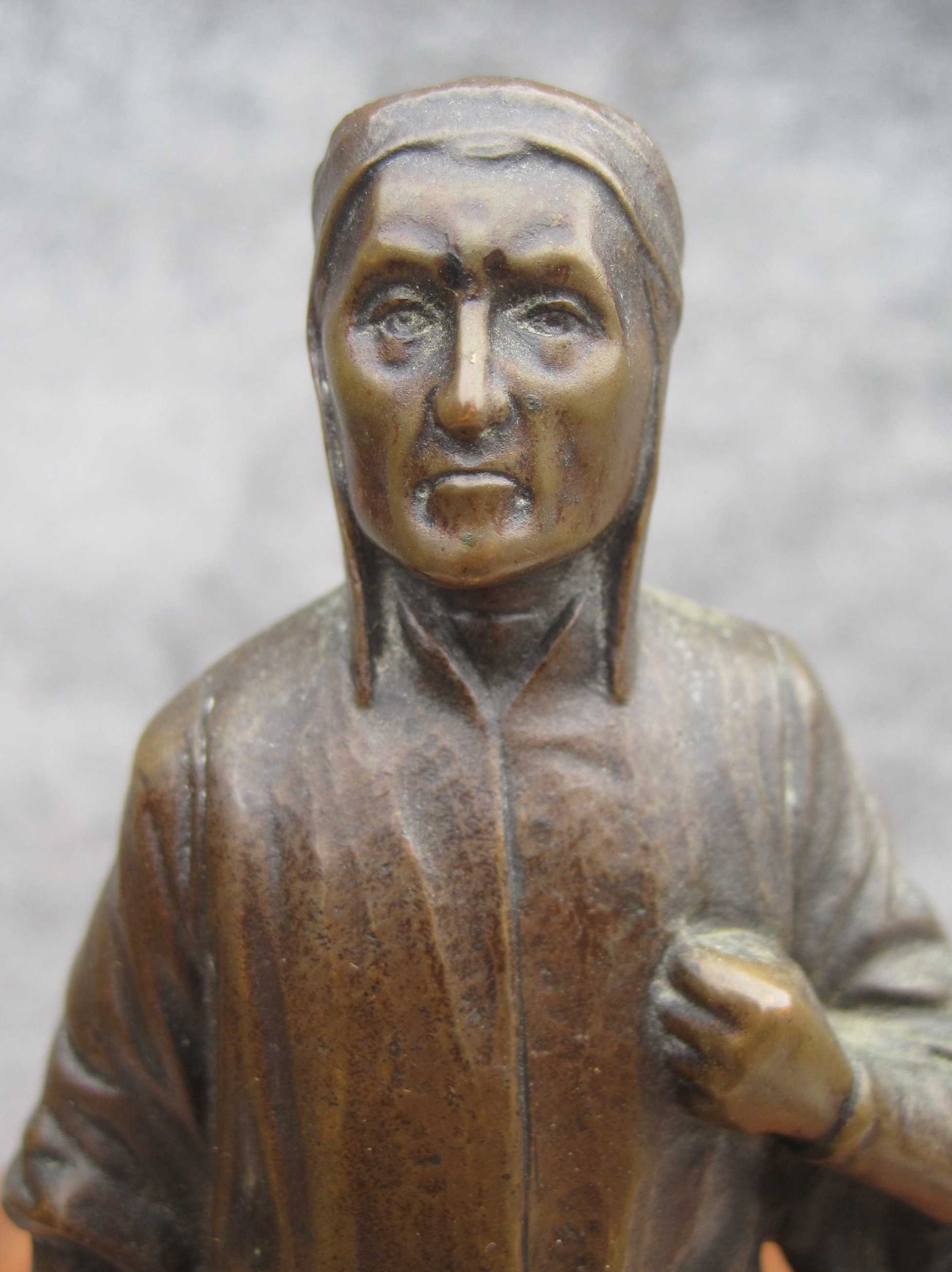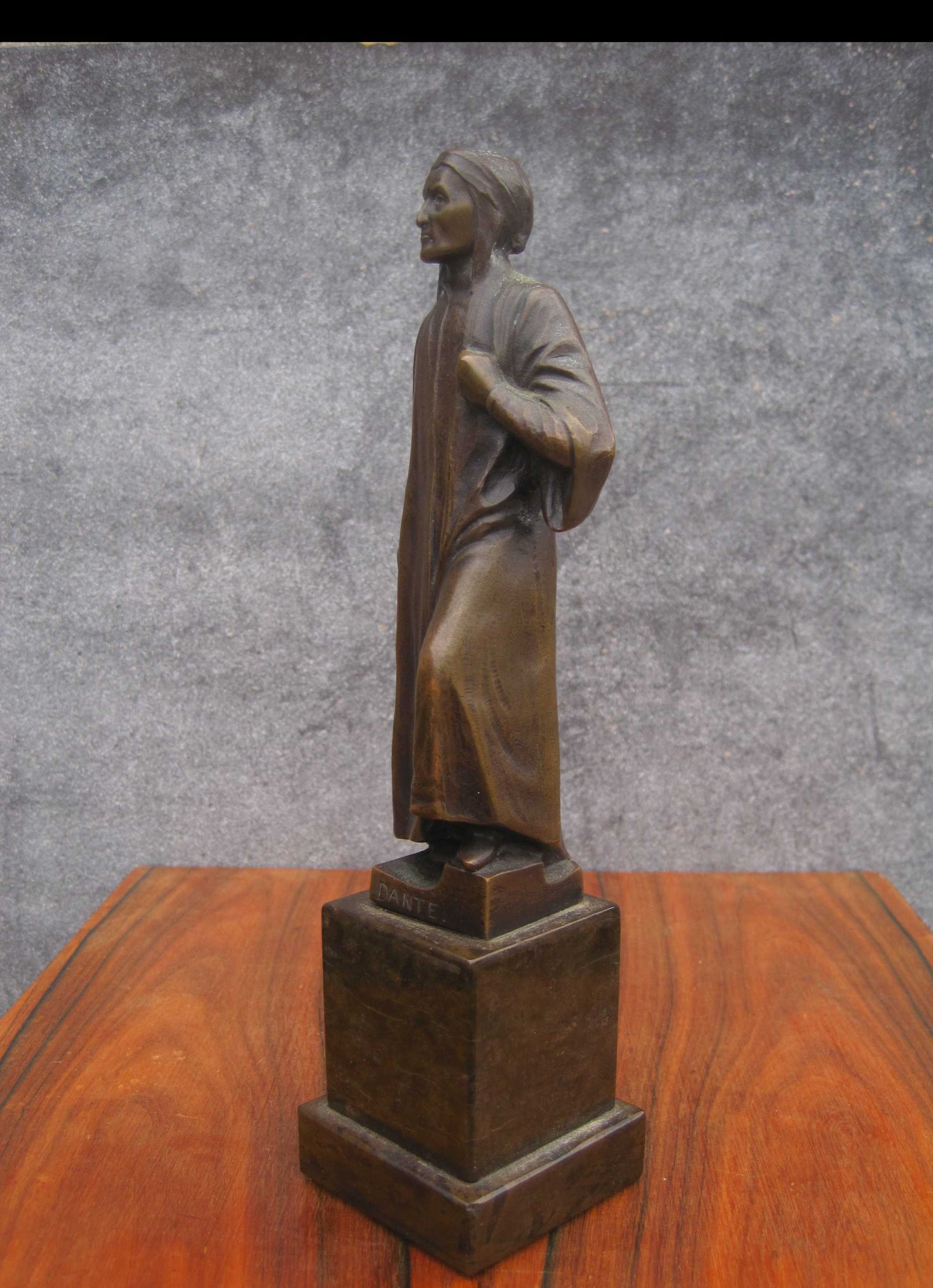 Een heel gaaf bronzen beeld van Dante Alighieri, de bekendste schrijver/dichter van Italië door de kunstenaar en beeldhouwer Ernst Beck ( 1879 - 1941 ). Sommige bronnen noemen hem Ernst Eck. Dante schreef onder andere "De goddelijke komedie". Ernst Beck was een Oostenrijkse schilder graficus en beeldhouwer. Hij werd geboren in de plaats Lengbach en stierf in Wenen. Hij studeerde aan de kunstacademie in Wenen en was lid van de Weense Secession en het Weense kunsthuis.