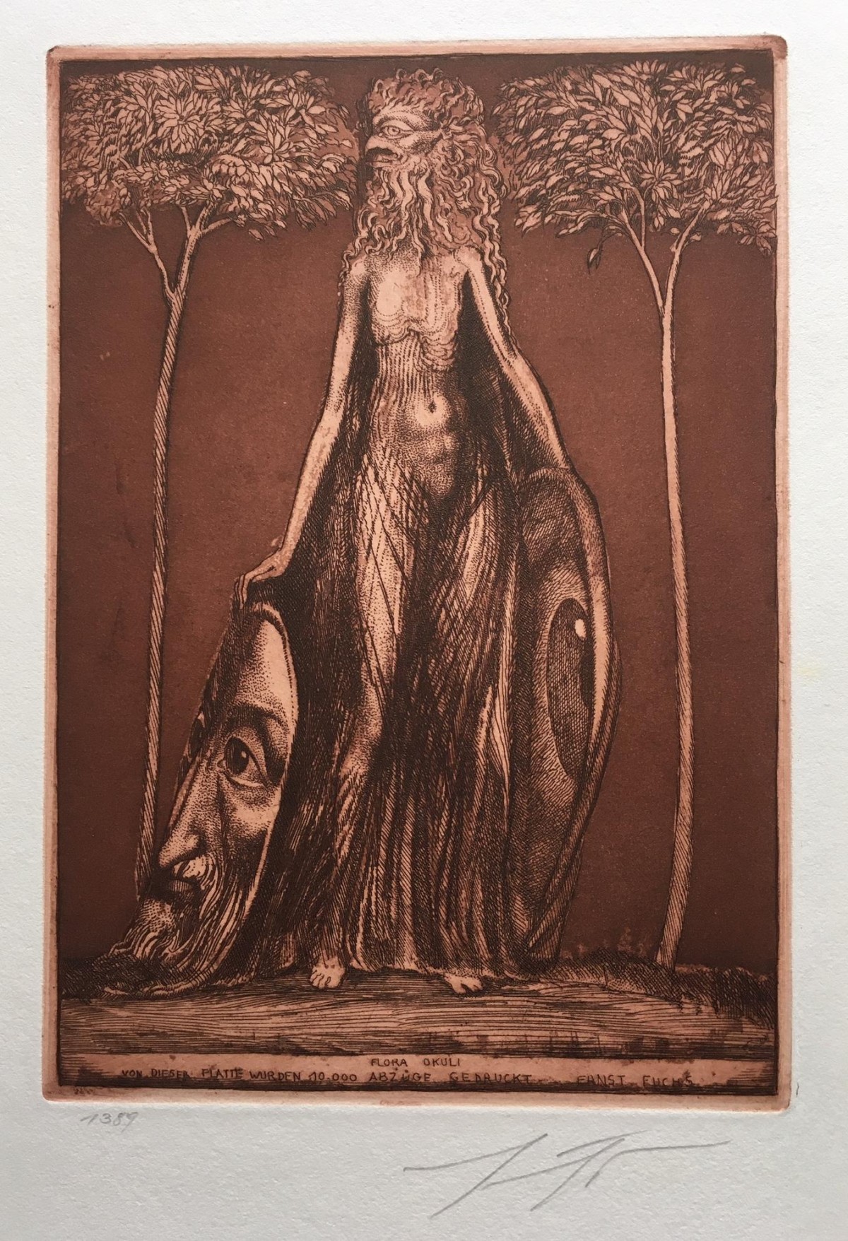 Fuchs, Ernst, Flora Okuli, Aquatinta-Radierung 1975, handsigniert und nummeriert 1389/10000, Druck Siegfried Reinert, Berlin, oder Max Dunkes, München. Bildformat 24x17cm, Blattformat 42x30cm. Von dieser Radierung wurden 2000 in Farbe gedruckt. Das angebotene Blatt ist eines davon.