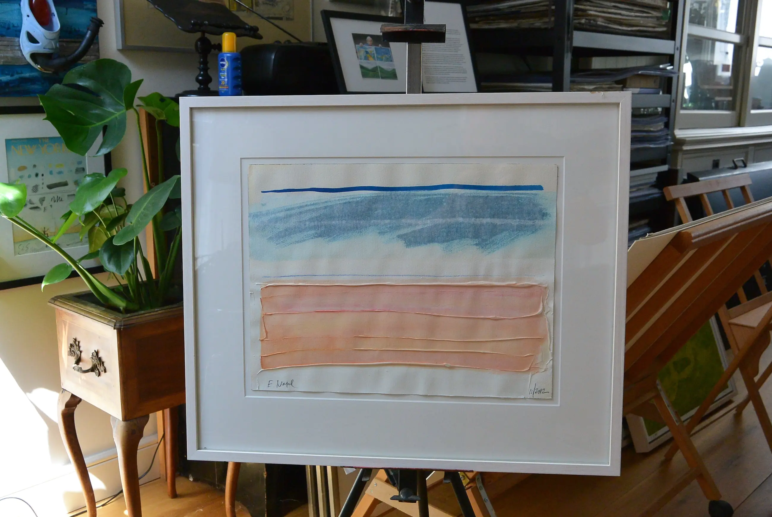 Met eenvoudige middelen en gemengde techniek trefzeker neergezet: de zee vanaf het strand... Abstract maar toch een plaatje: abstract expressionisme