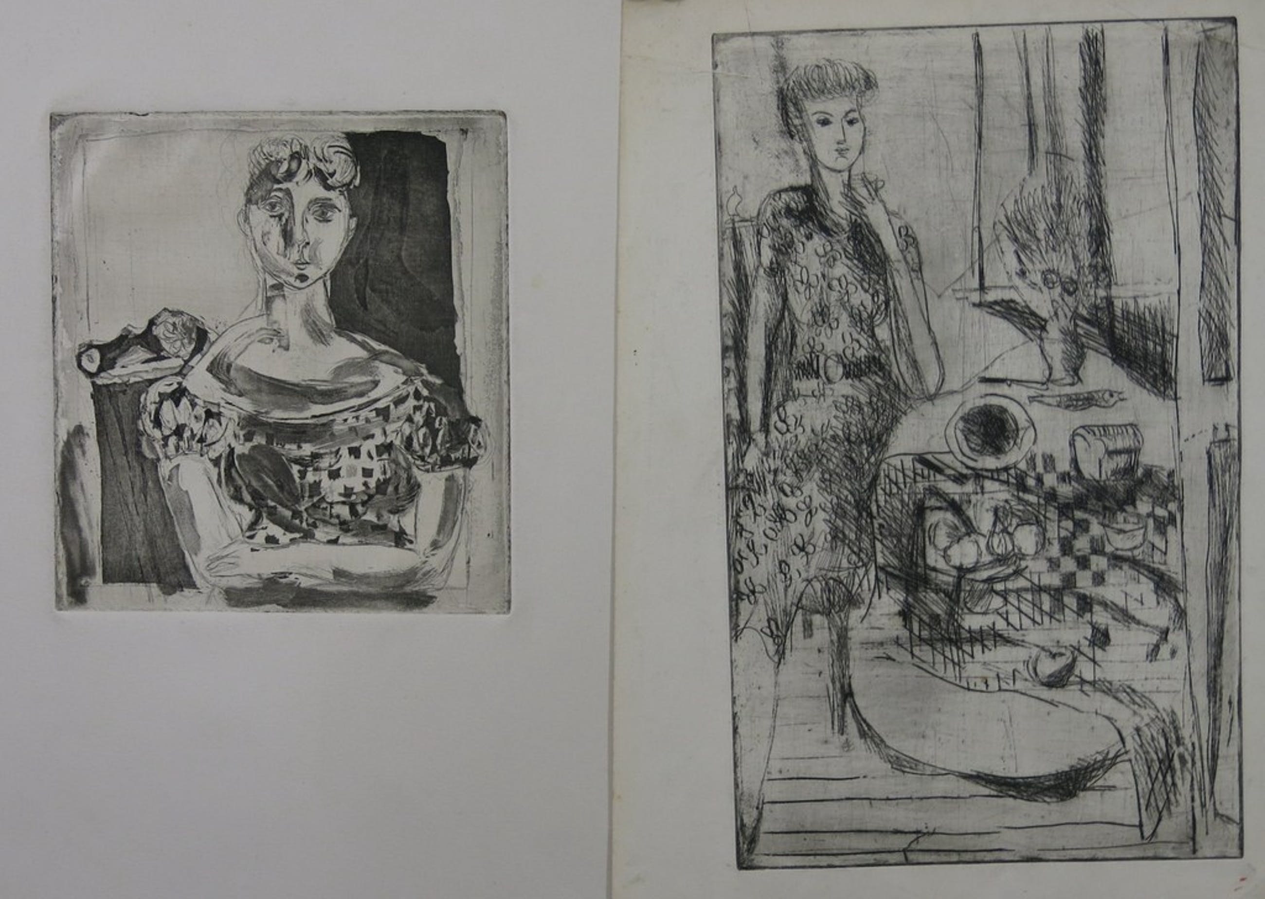 In goede staat, maar beide met wat lichte kreuk aan de randen van het blad. Voornamelijk de ets van de vrouw aan de keukentafel, heeft naast enkele kreuklijnen ook enkele vouwlijnen in het blad, wat vlekken in de buitenrand en de bovenrand is vergeeld. Ingelijst nauwelijks zichtbaar.