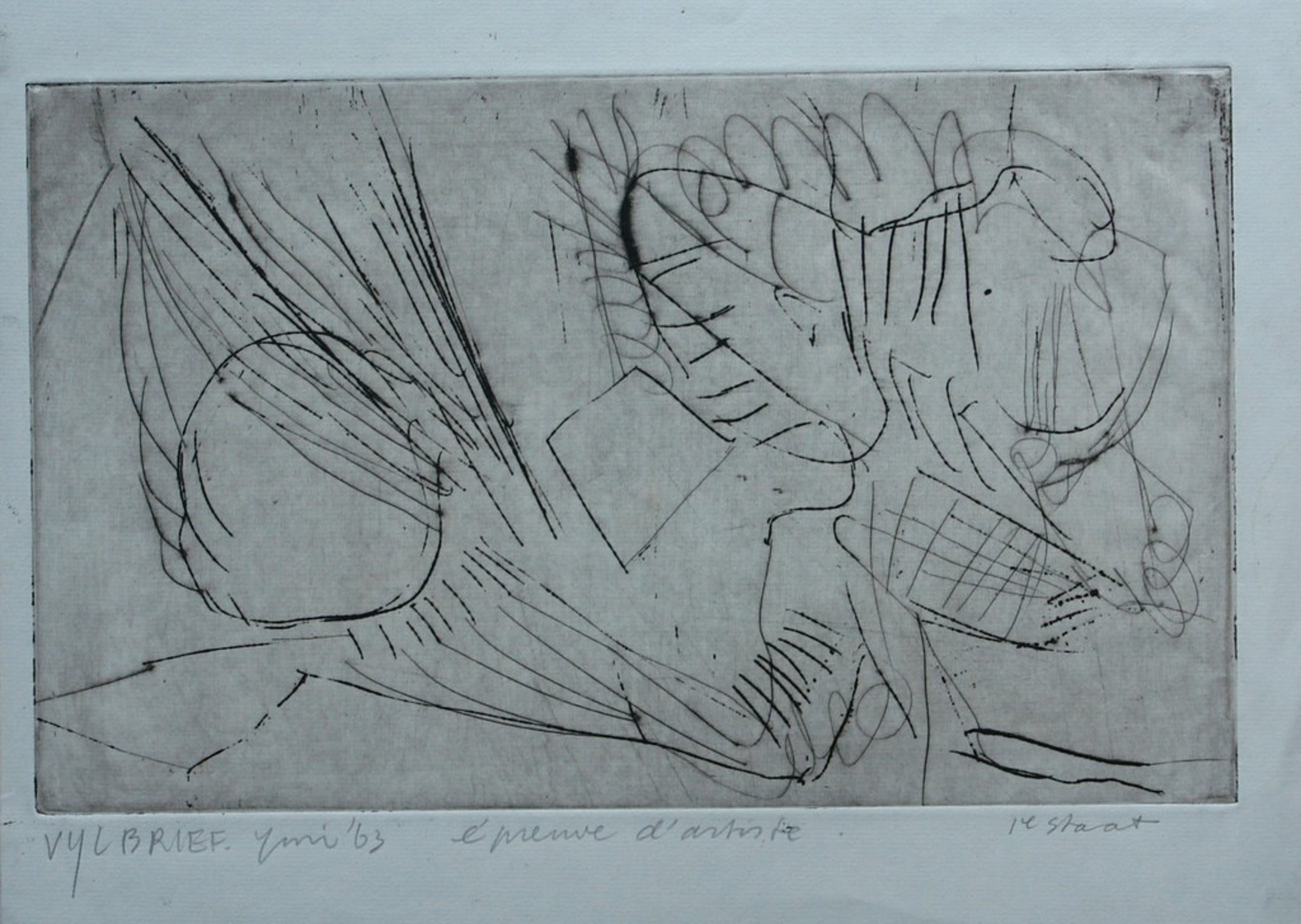 Een abstracte ets in prima conditie van Ernst Vijlbrief, in potlood gesigneerd en gedateerd Juni 1963. 1e staat Épreuve d'artiste.