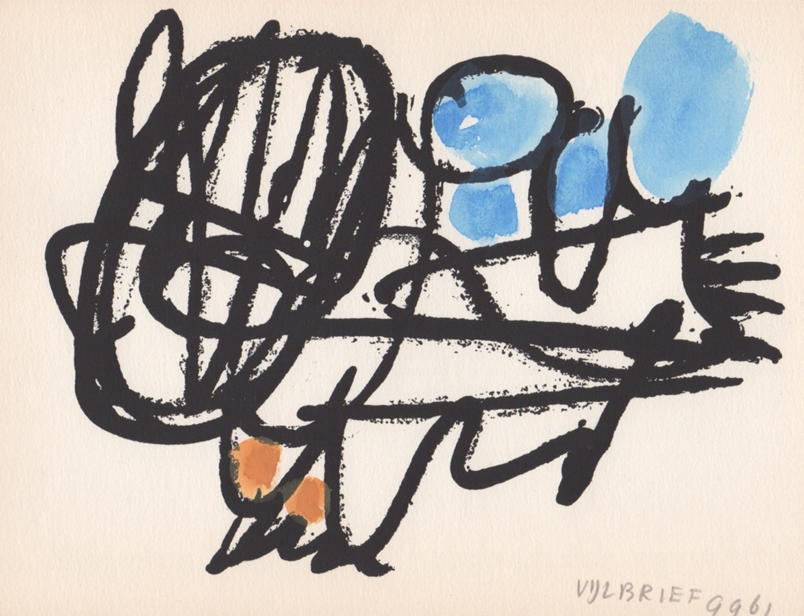 'Deze tekeningen van Ernst Vijlbrief met begeleidende tekst van Simon Vinkenoog, werden in 300 genummerde exemplaren gedrukt en met de hand gekleurd ter gelegenheid van de tentoonstelling van schilderijen en gouaches in galerie 'De Posthoorn', Lange Voorhout, Den Haag, in de maand September 1961.'