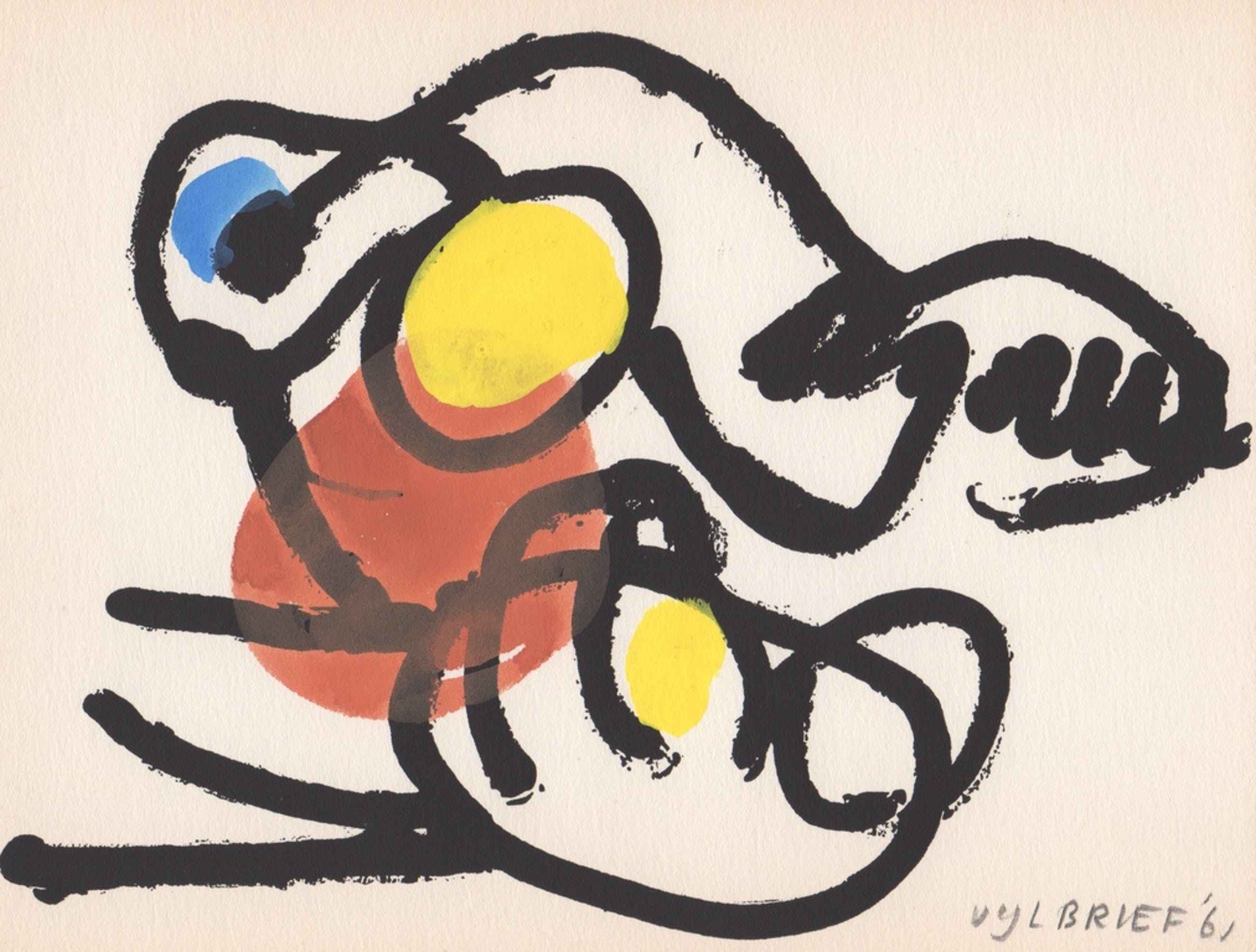 'Deze tekeningen van Ernst Vijlbrief met begeleidende tekst van Simon Vinkenoog, werden in 300 genummerde exemplaren gedrukt en met de hand gekleurd ter gelegenheid van de tentoonstelling van schilderijen en gouaches in galerie 'De Posthoorn', Lange Voorhout, Den Haag, in de maand September 1961.'