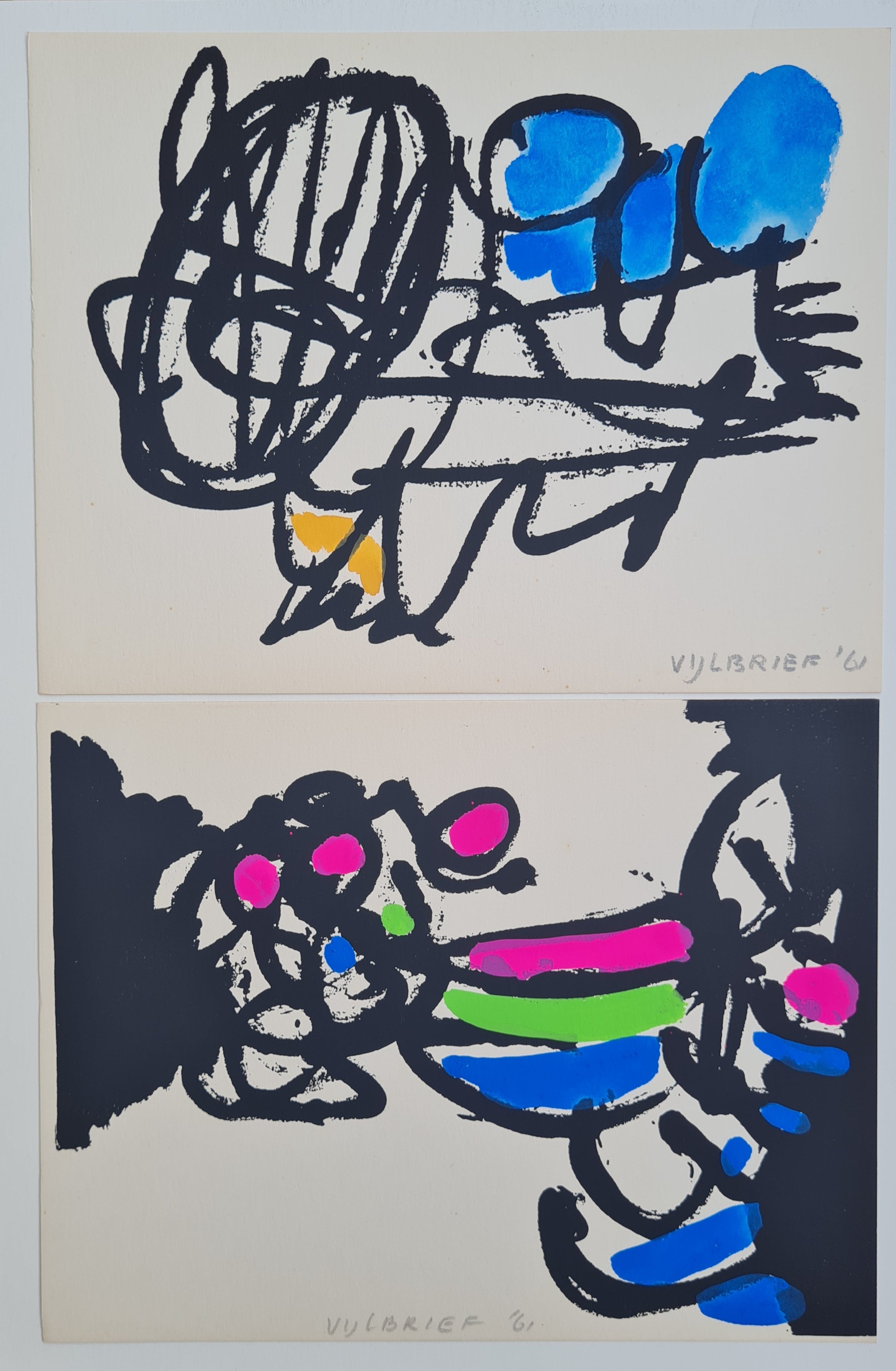 Portfolio met 4 gesigneerde en handgekleurde zeefdrukken van Ernst Vijlbrief en bijbehorend tekstblad van Simon Vinkenoog.