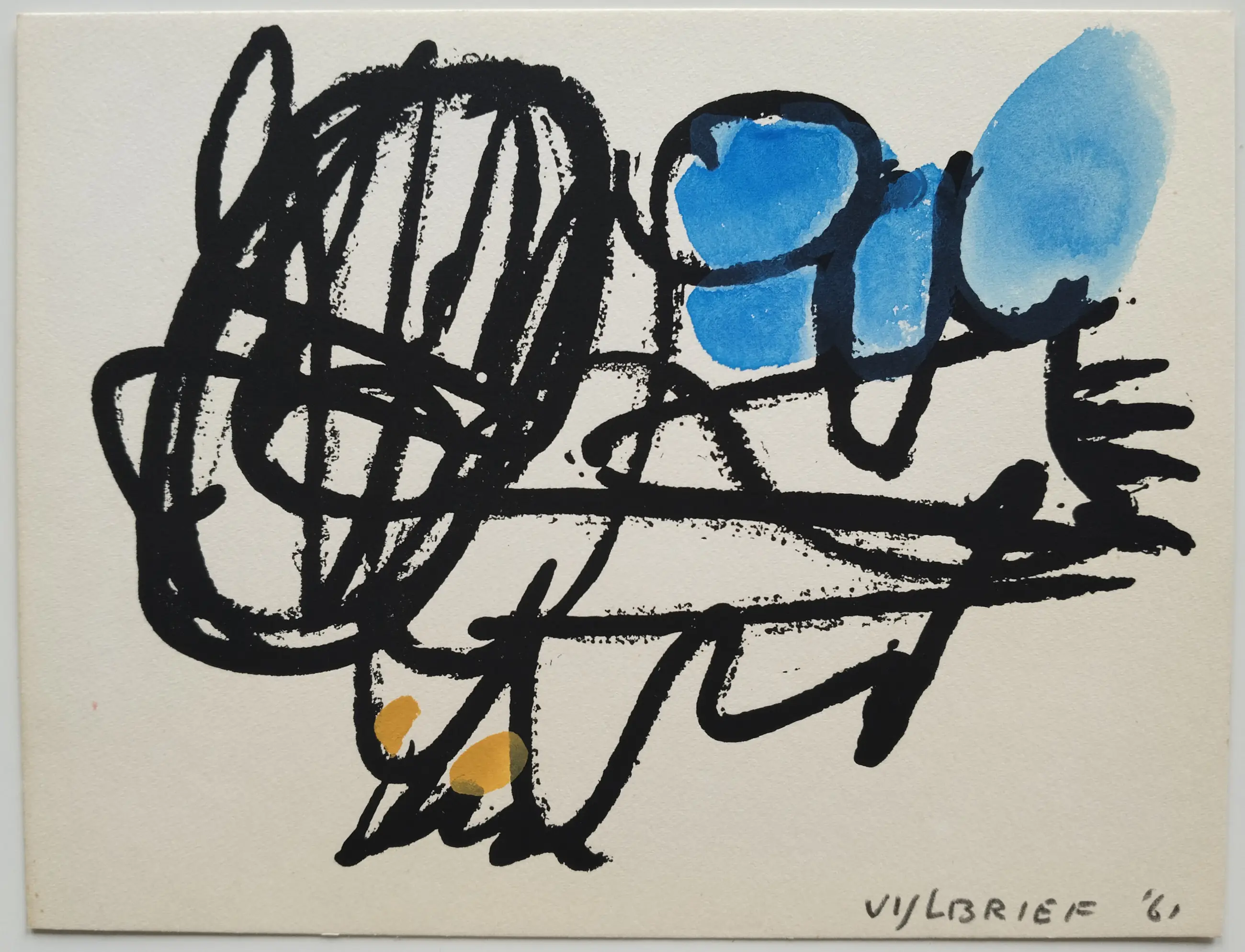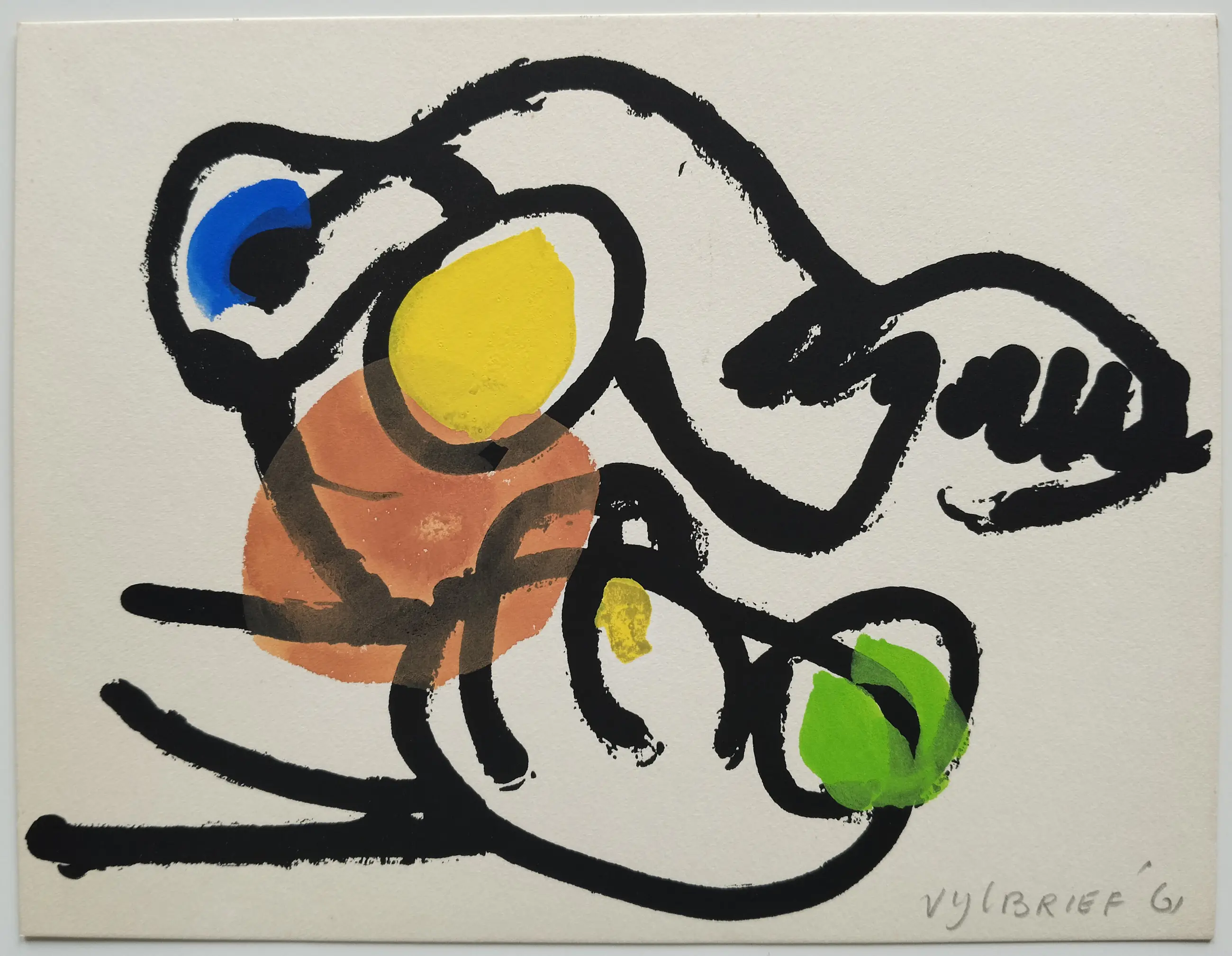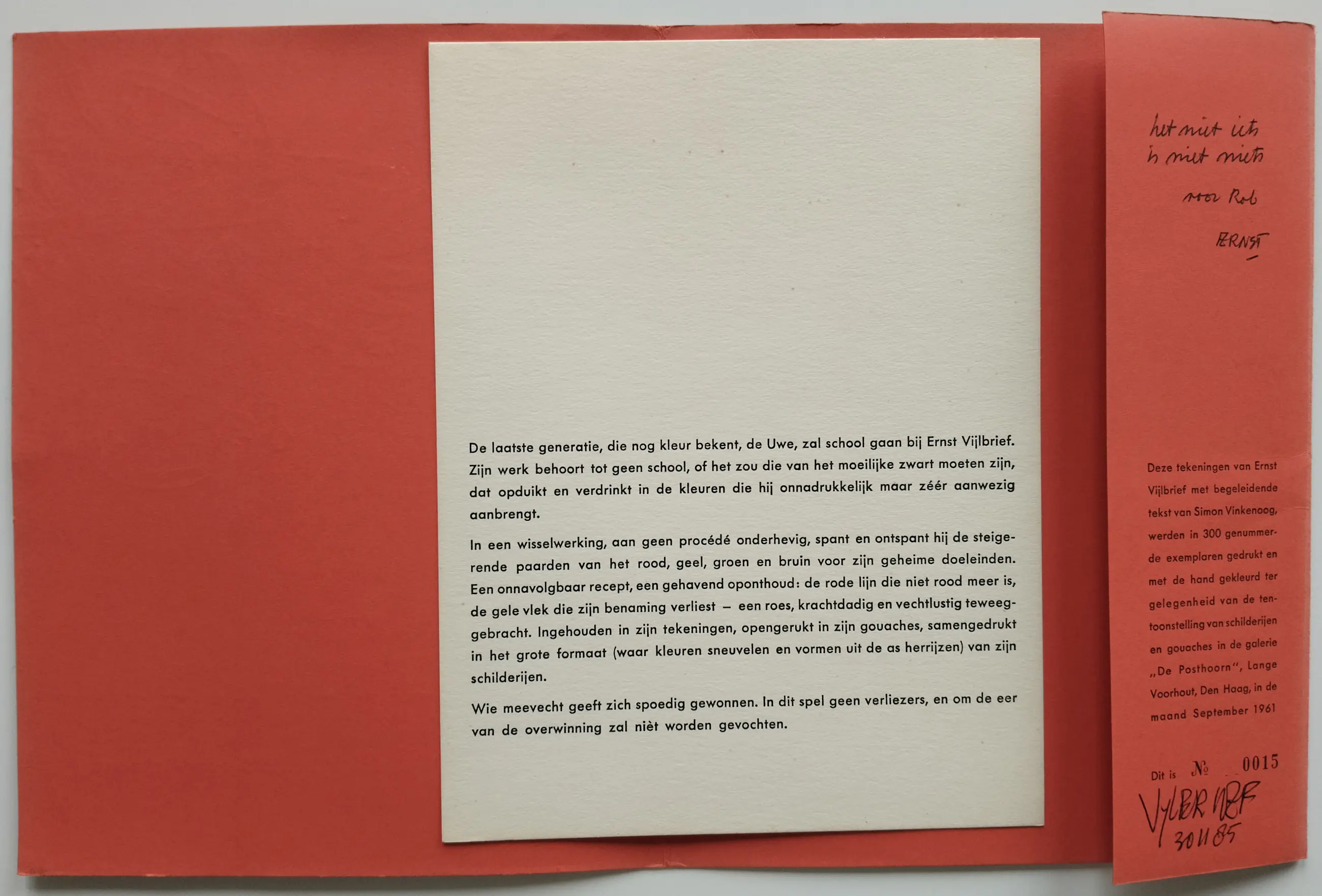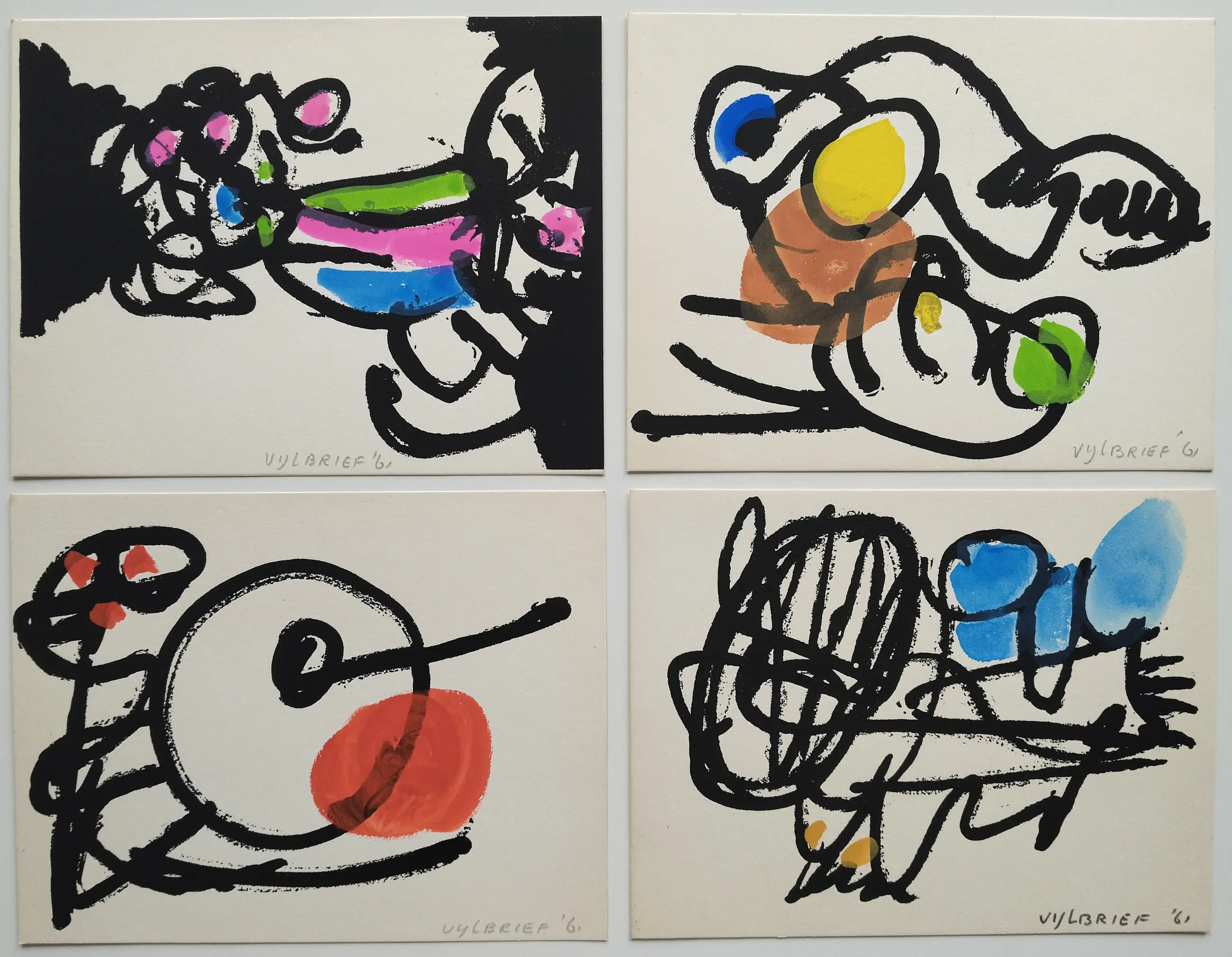 4 met de hand ingekleurde zeefdrukken van Ernst Vijlbrief (1934 - 2010) spel en nederlaag uit 1961. Rechtsonder zijn de werken gesigneerd met Vijlbrief 61. De werken zijn niet apart genummerd maar genummerd in het bijhorende mapje. Dit is nr 0015 van 300. Het mapje is ook gesigneerd in 30-11-85 Papiermaat 16.5 x 21.5 cm (h x b)