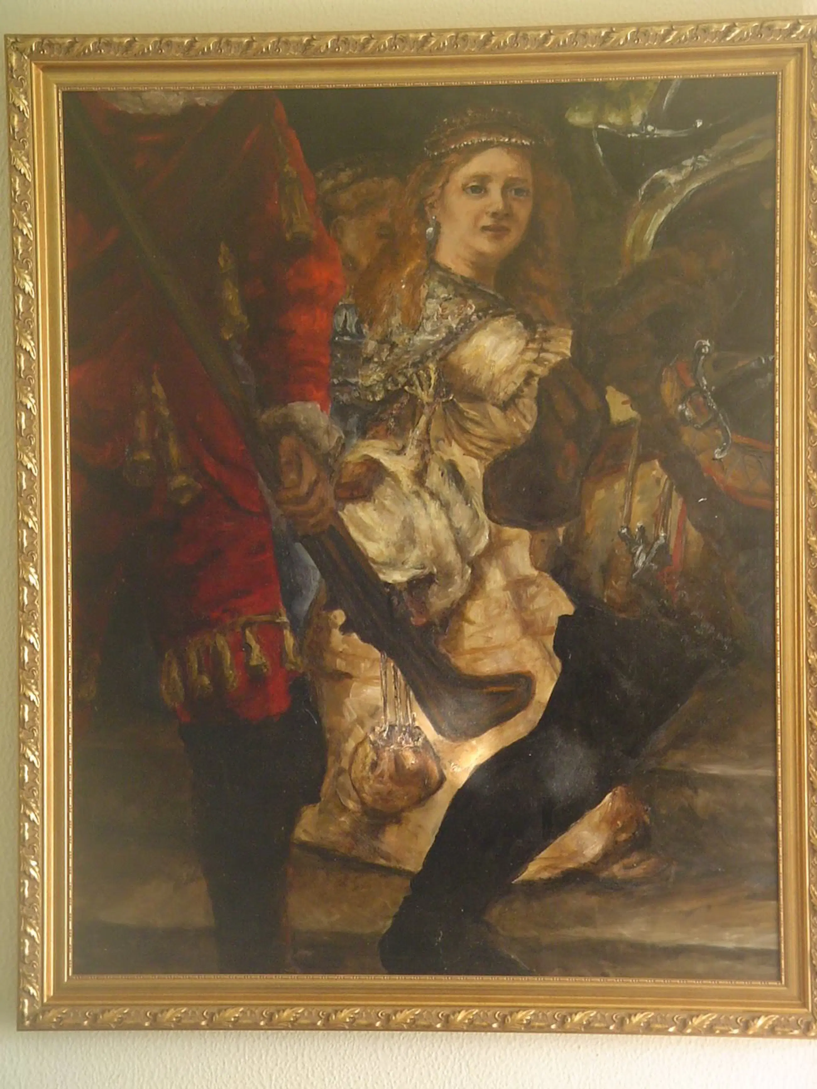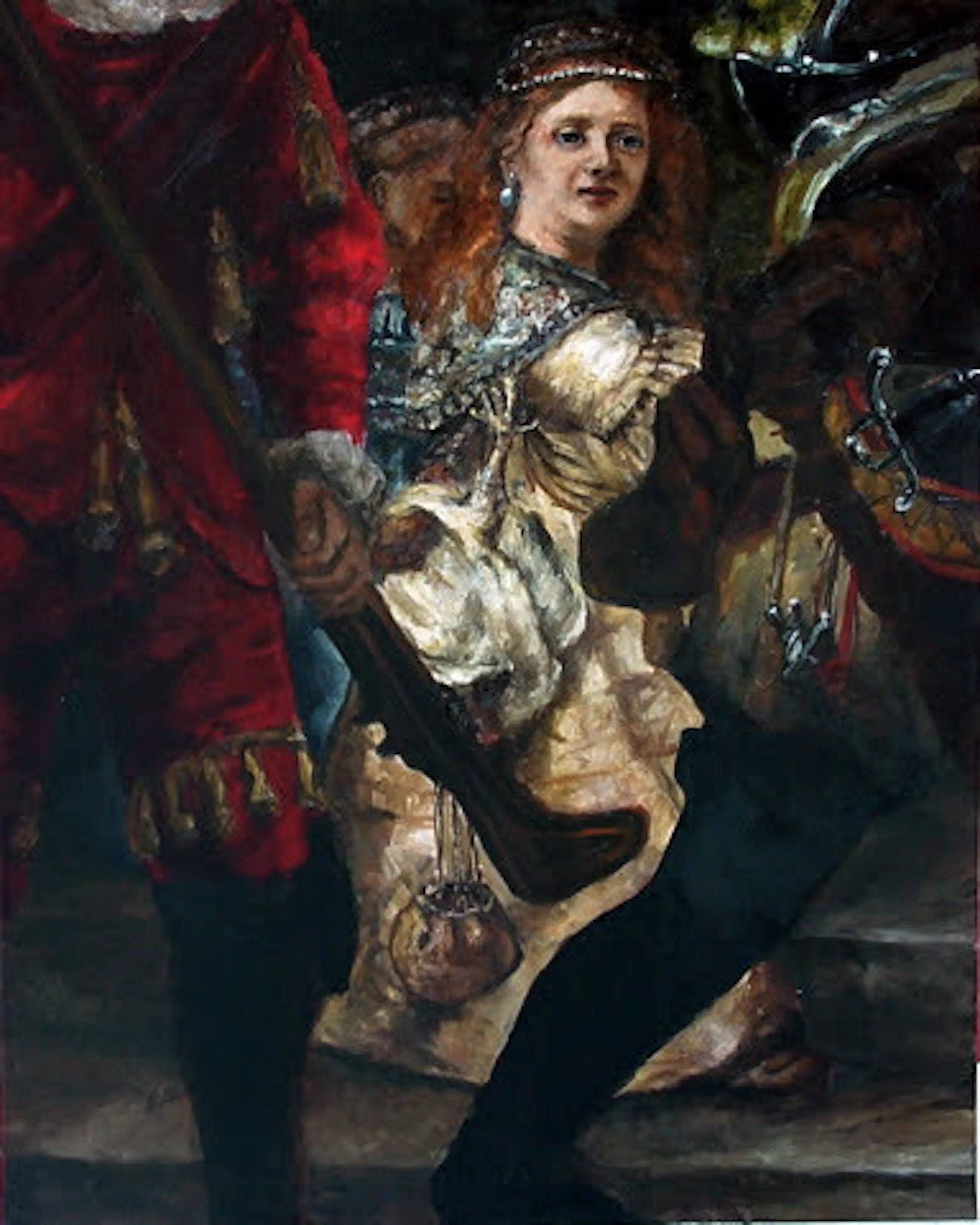 In 2005 heeft Ernst Voss zijn eigen interpretatie van Rembrandt’s Nachtwacht geschilderd en dat op hetzelfde formaat als het origineel. Het schilderij "Saskia" heeft daartoe gediend als studie-object. Dit unieke schilderij is samen met Ernsts interpretatie van de Nachtwacht geëxposeerd geweest in de vitrine van het Rijksmuseum in de aankomsthal van onze nationale luchthaven alsmede in Slot Zeist. Door het schilderij op verschillende wijzen te belichten zult u steeds weer nieuwe ontdekkingen doen!