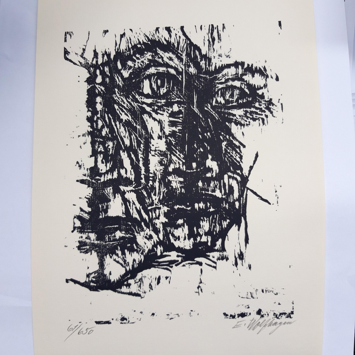 1-FARBEN-HOLZSCHNITT (SCHWARZ) VON ERNST WOLFHAGEN IM FORMAT 23 x 31 CM. GEDRUCKT AUF CHAMOIS HADERN, OHNE DATUM. NUMMERIERT (61/650) UND SIGNIERT MIT BLEISTIFT 'E. Wolfhagen'. ENTSTEHUNG CA. 1978. BLATTZUSTAND: EXCELLENT