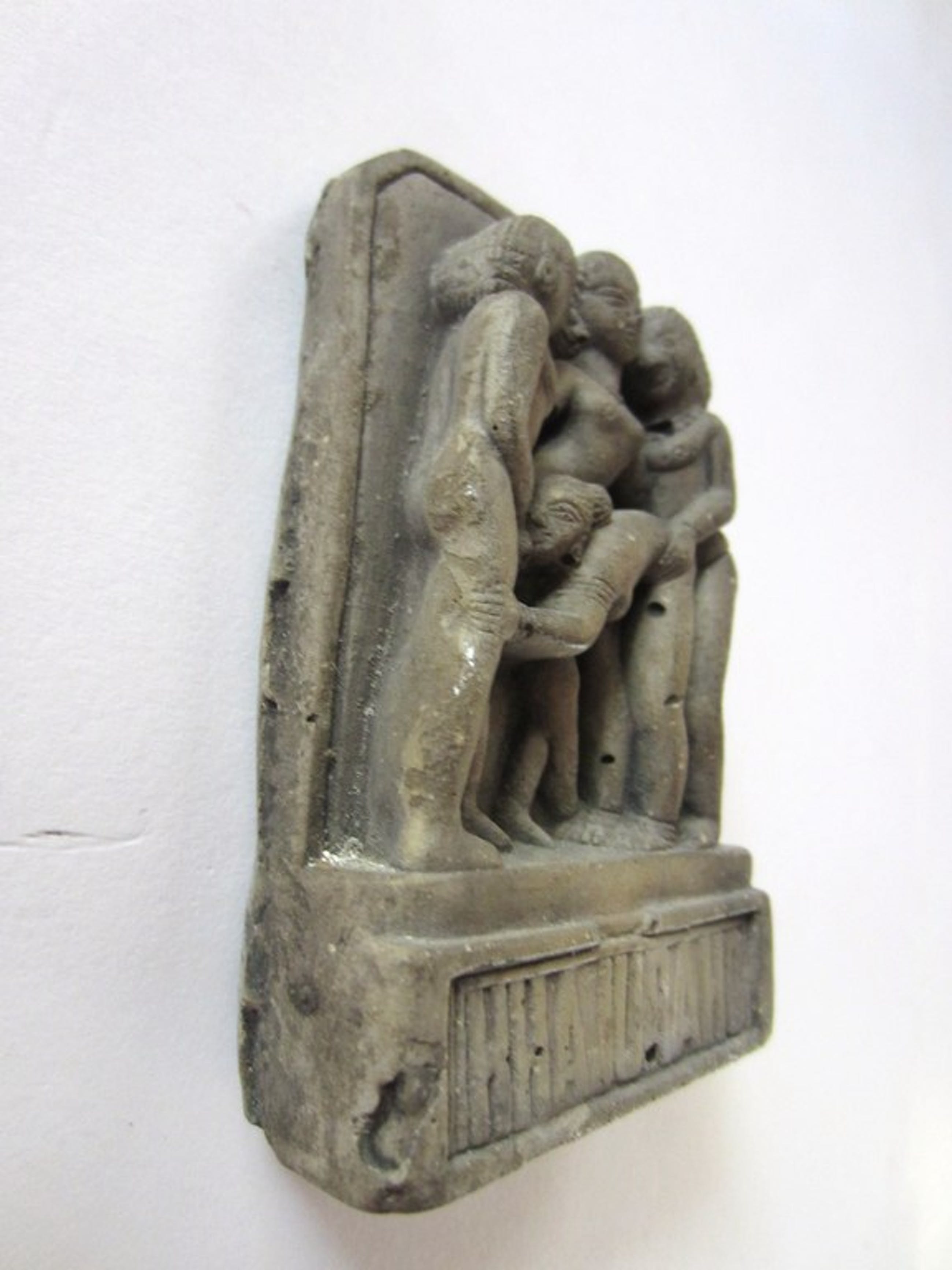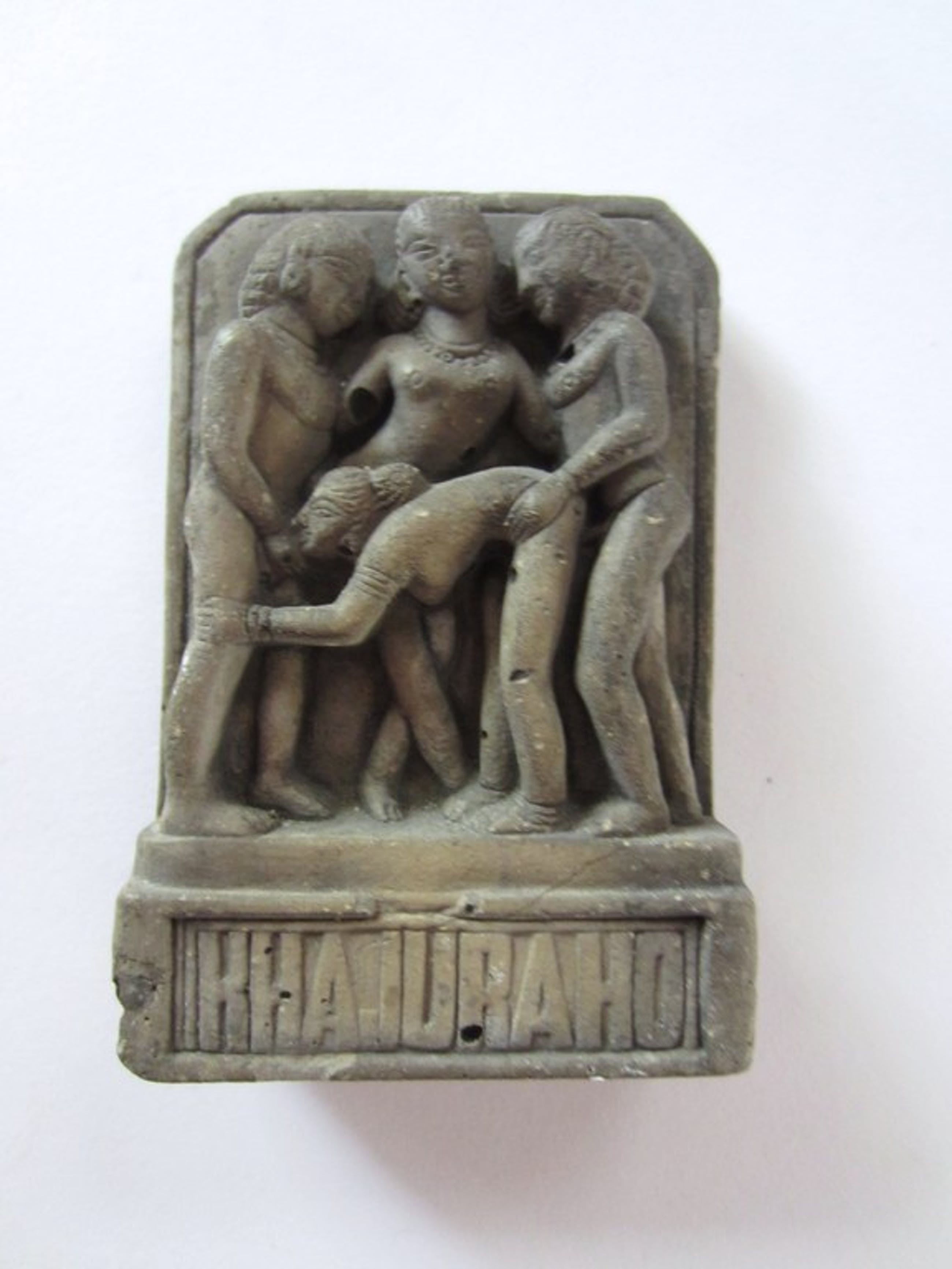Erotisch reliëf met een voorstelling van een beeldengroep van het één van de tempels van Khajuraho.
