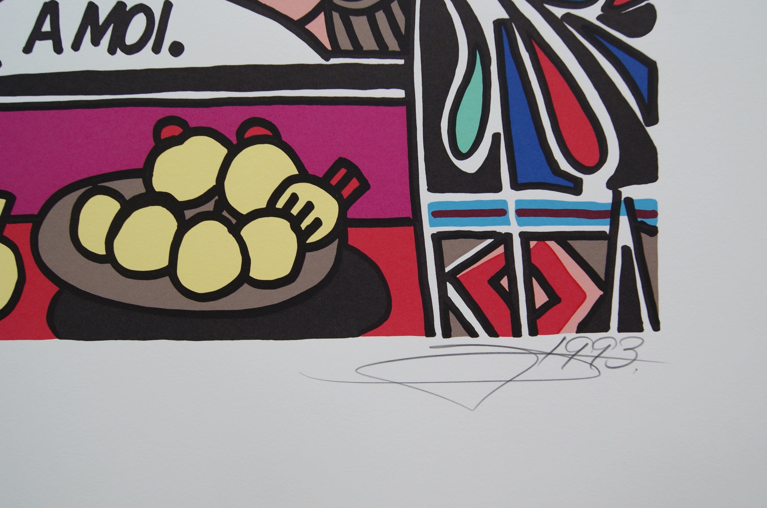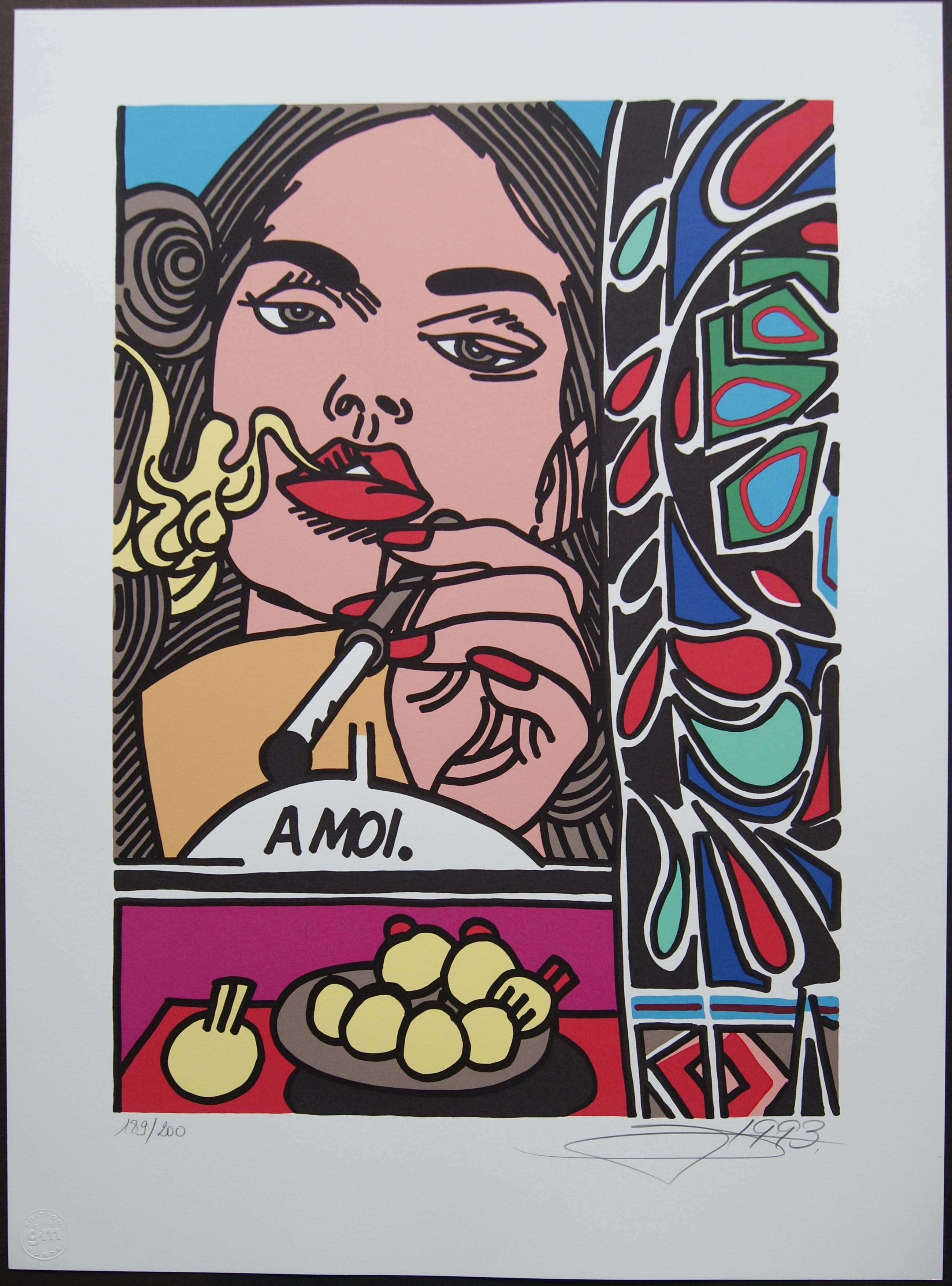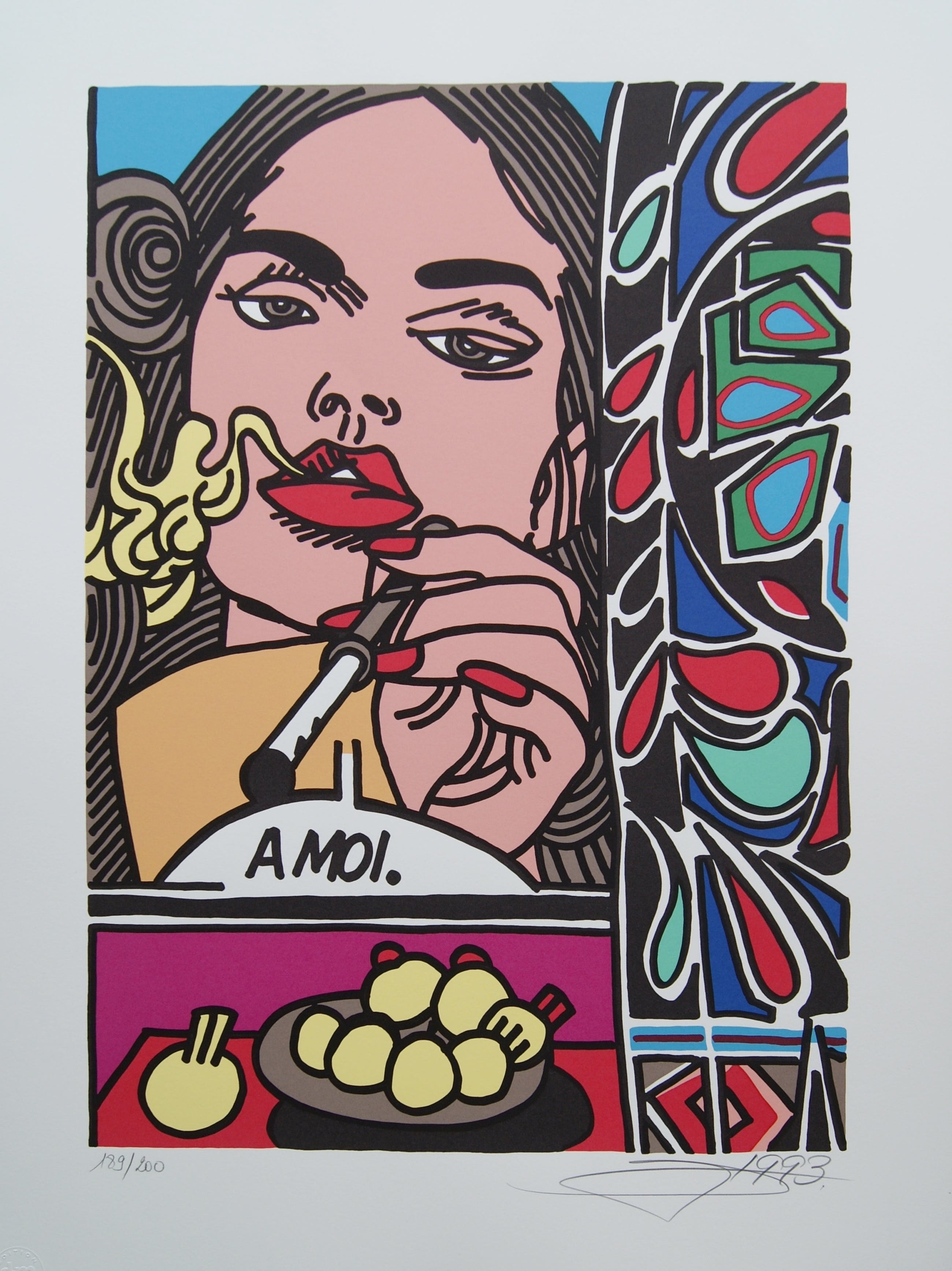 Een zeer fraaie zeefdruk van Erro uit 1993. Het werk is gesigneerd en genummerd en in zeer goede conditie.Afmetingen 71 x 52 cm.