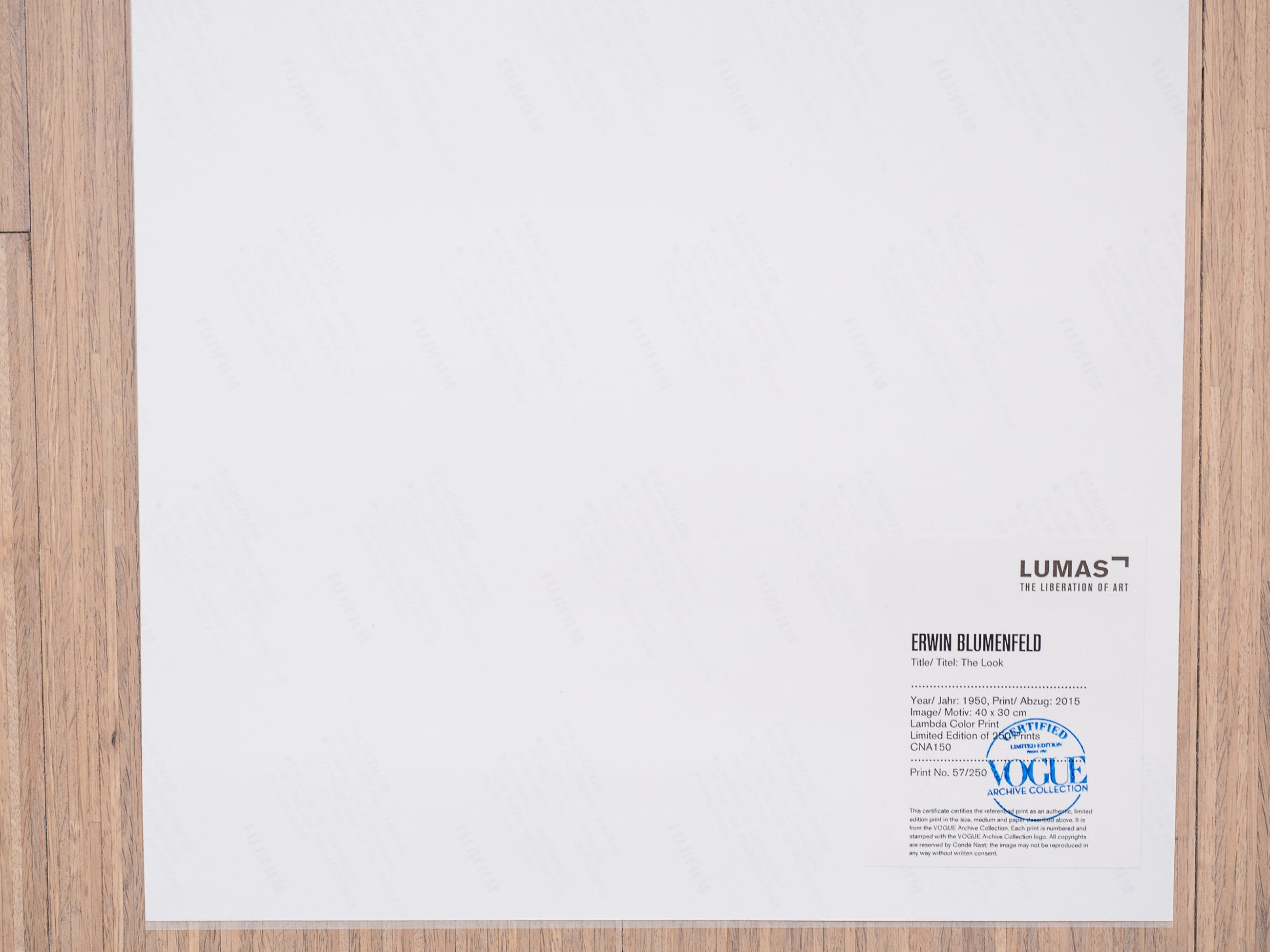 Prachtige afdruk van de iconische foto door Erwin Blumenfeld: "The Look", gemaakt in 1945. Het betreft een genummerde oplage uit 2014, dit lot bevat nummer 57 van 250. De oplage is voorzien van een CoA (certificate of authenticity), aangebracht aan de achterzijde van de print. De CoA bevat de Vogue/Condé Nast stempel.Â