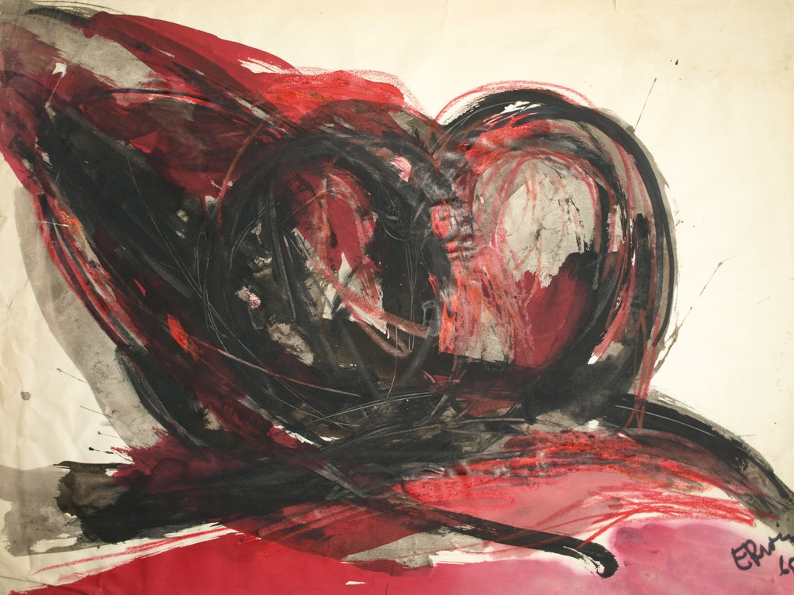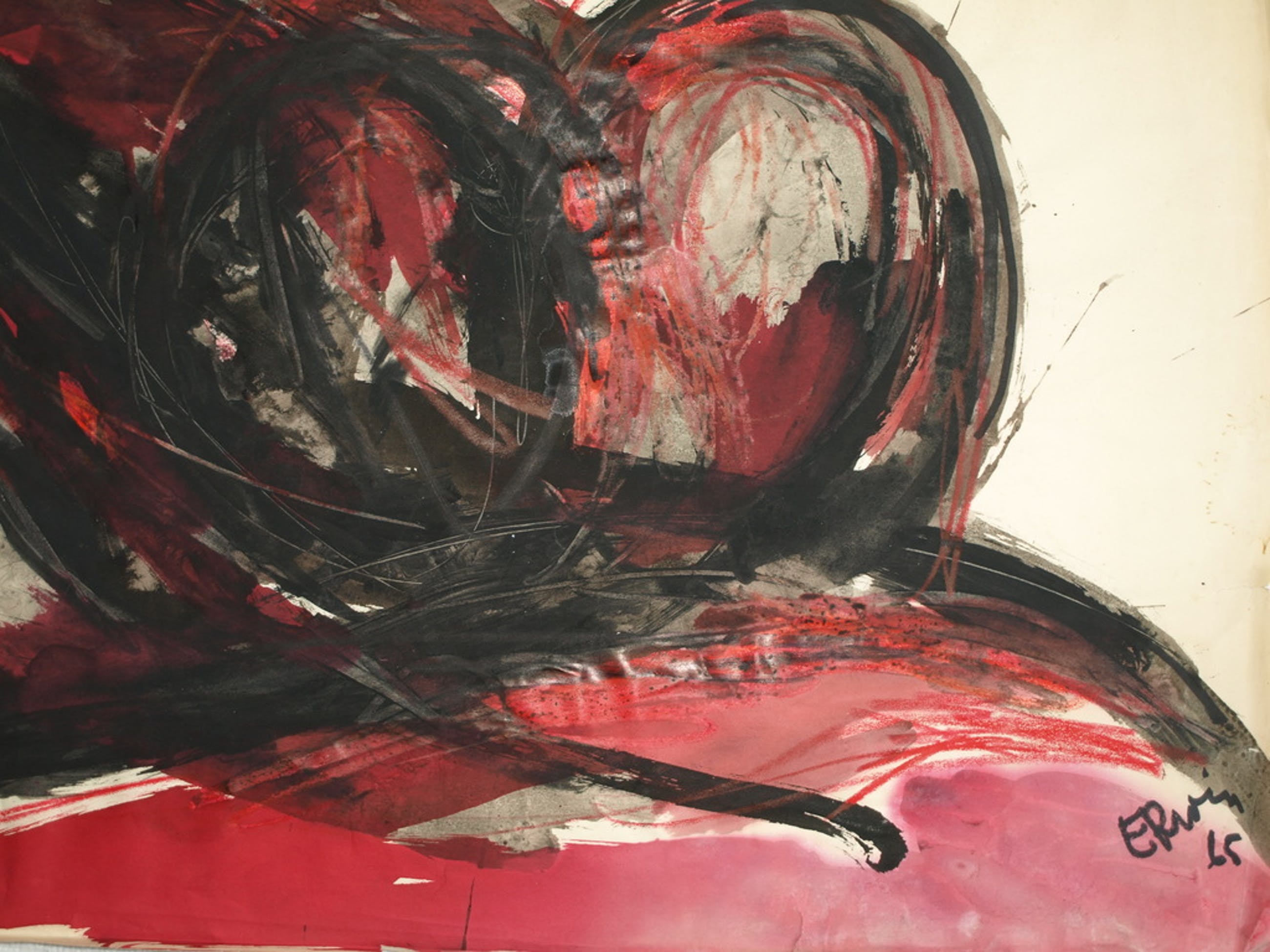 Een groot werk van de Surinaamse kunstenaar Erwin de Vries uit 1965 met een COBRA-achtige voorstelling van een vrouwenfiguur (“Billen”).