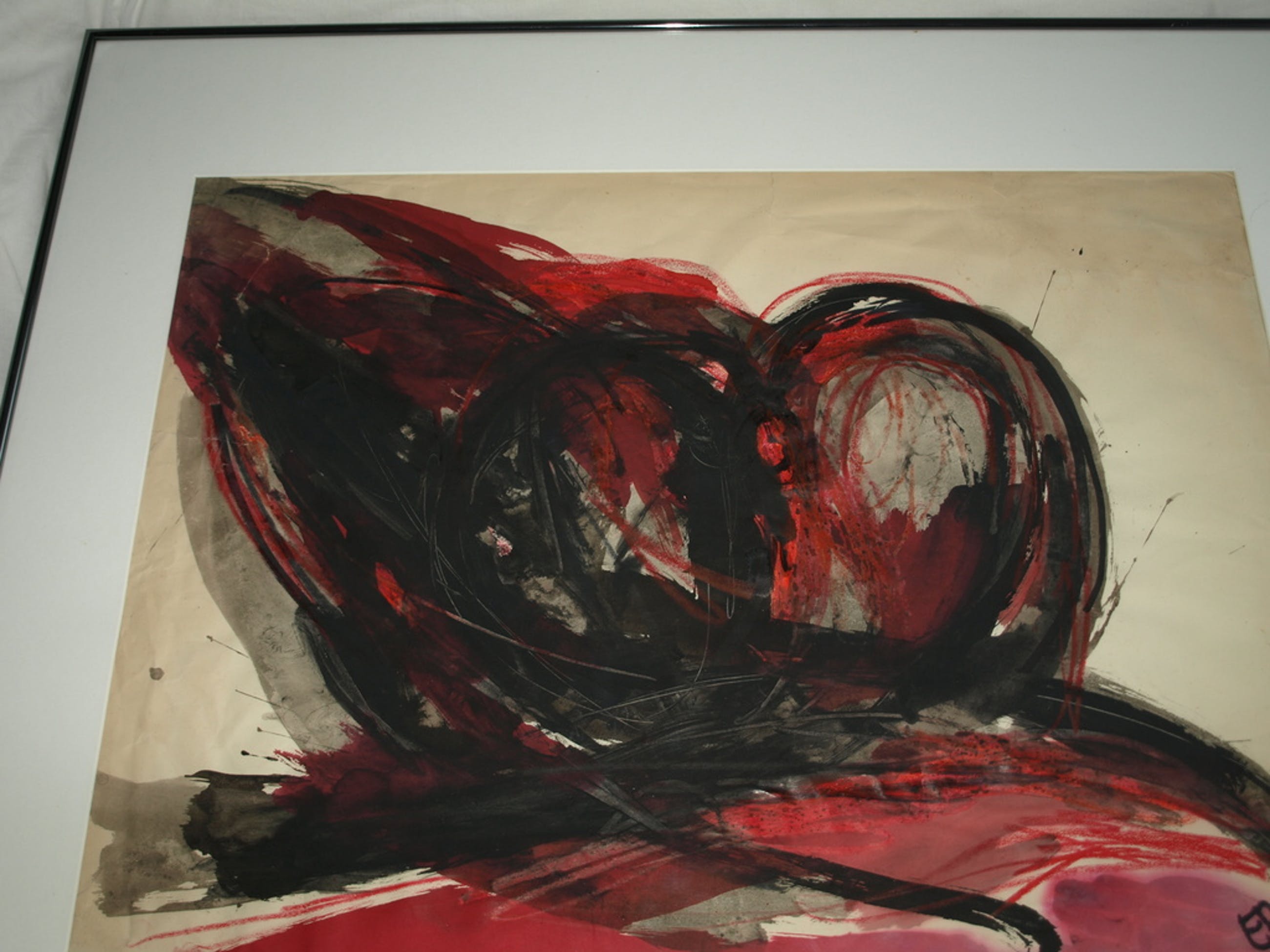 Conditie: Het papier heeft veel kreuk en veel scheurtjes langs de randen. Nu het werk is ingelijst, zijn deze beschadigingen grotendeels ‘verstopt’ achter het passe-partout. Zie de 7e foto om een indruk te krijgen van het werk als het uit de lijst is.