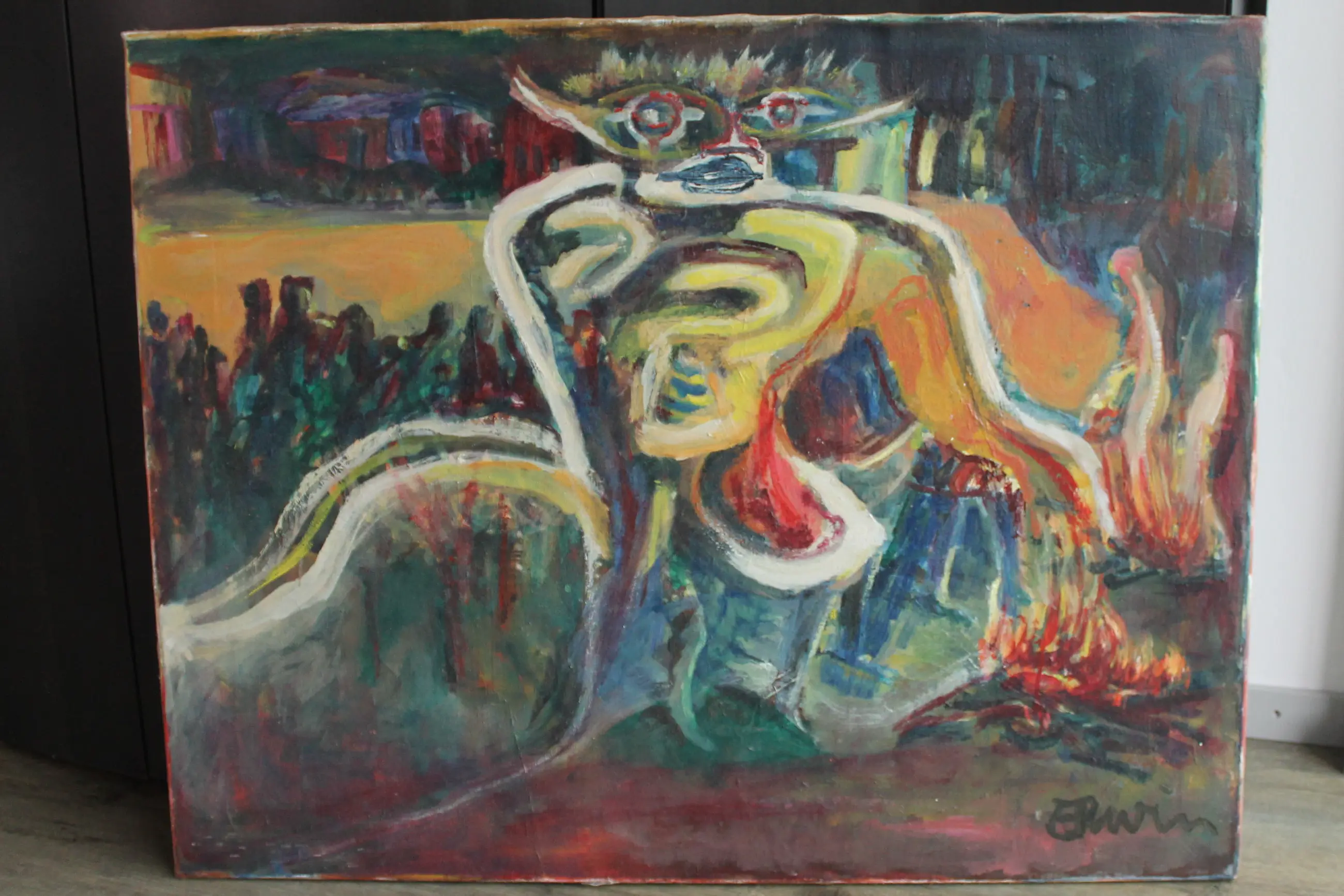 Winti is een natuur godsdienst . Aanhangers waren/zijn hoofdzakelijk in Suriname te vinden. Met dit schilderij is de atelierhuur betaald.
