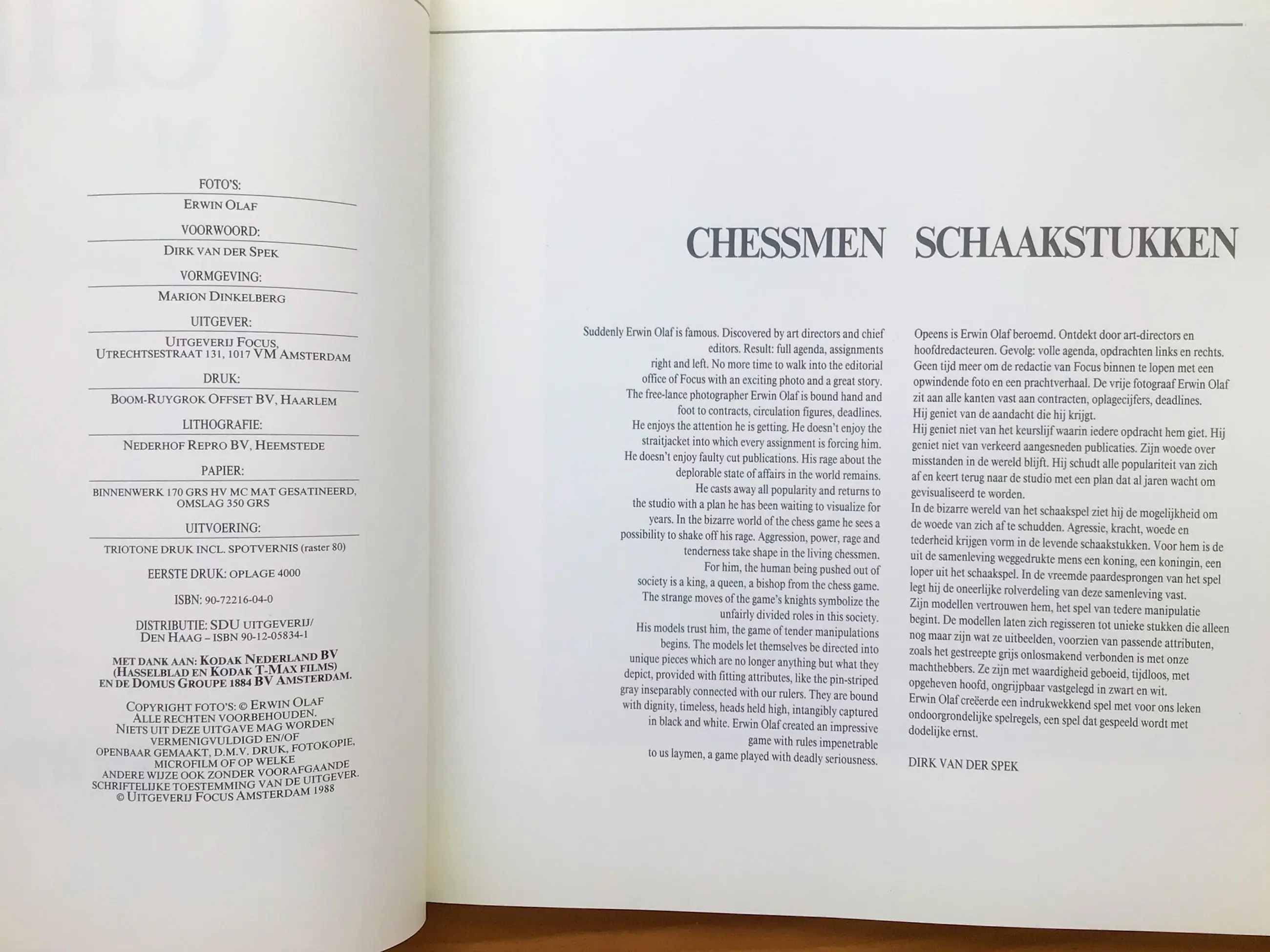 "CHESS Men - An attempt to play the game" Fotoboek, Amsterdam, 1988 1e Druk, Paperback 30 x 30 cm 72 pagina's Zeer goed exemplaar! Slechts weinig verkleuring in de omslag, verder als nieuw. ZELDZAAM