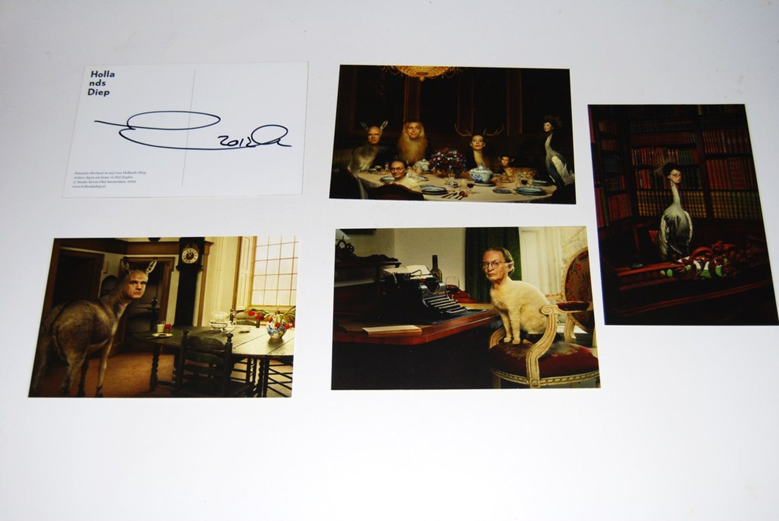 5 afdrukken van Nederlandse schrijvers met dierenlichamen. In een rode omslag met daarop Erwin Olaf zelf met een leeuw.