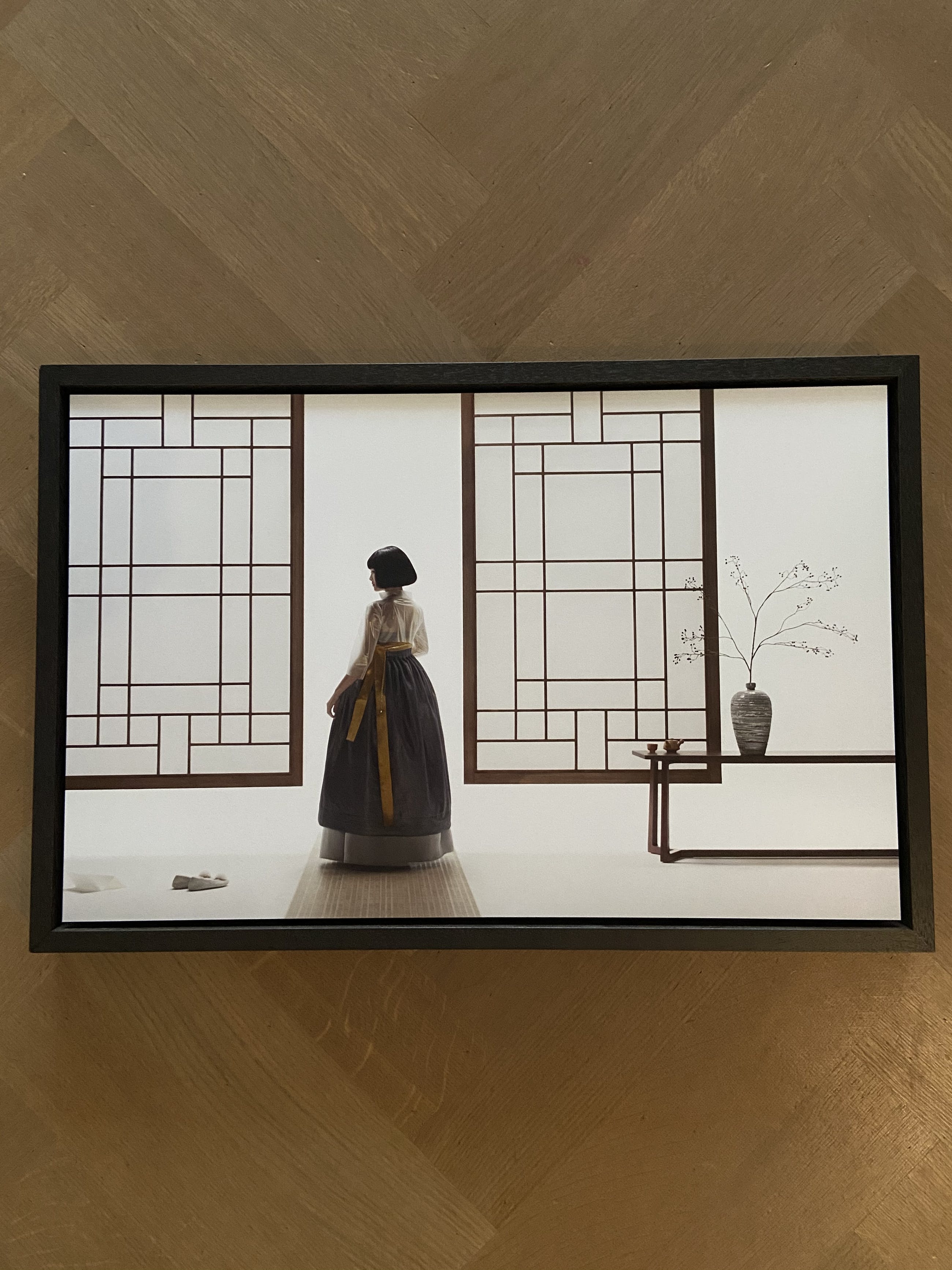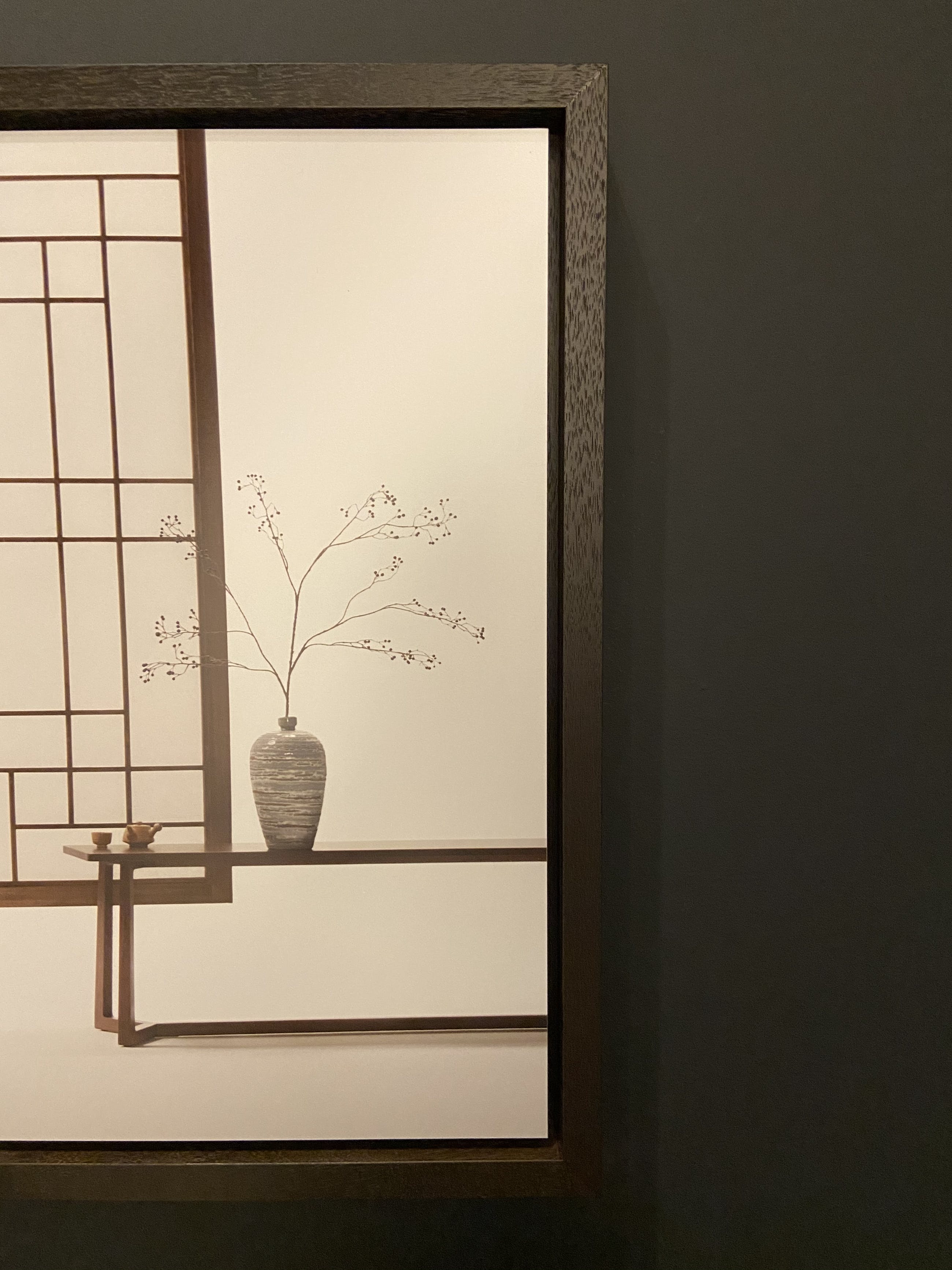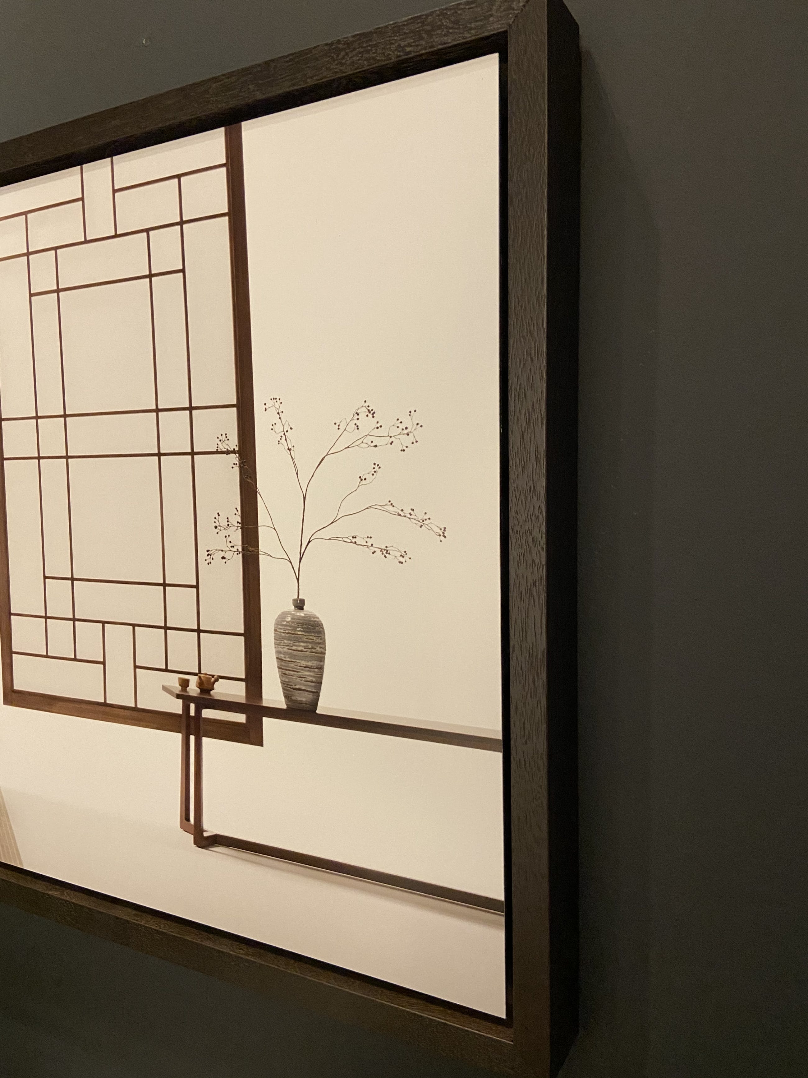 De foto is vakkundig ingelijst (handmade framed) door Wilco Vak. Het is een donkerbruine noten lijst. De foto is fraai "zwevend" ingelijst.