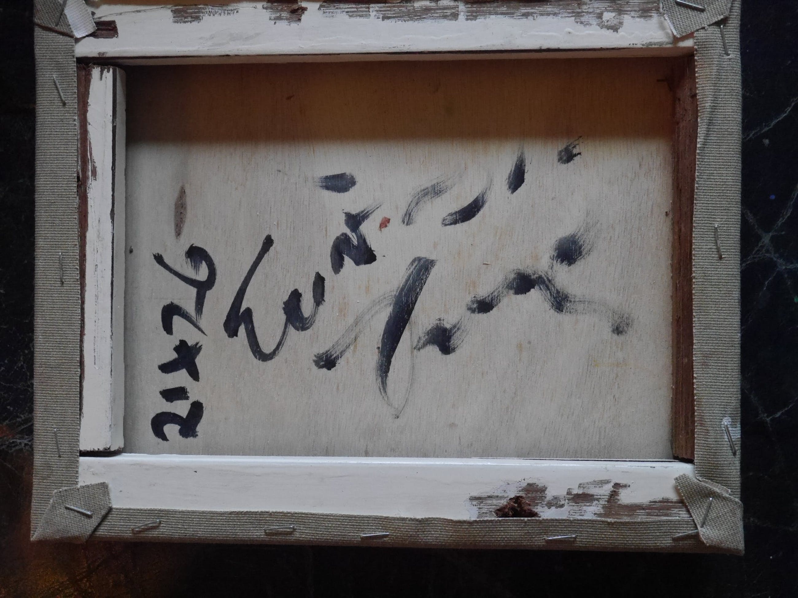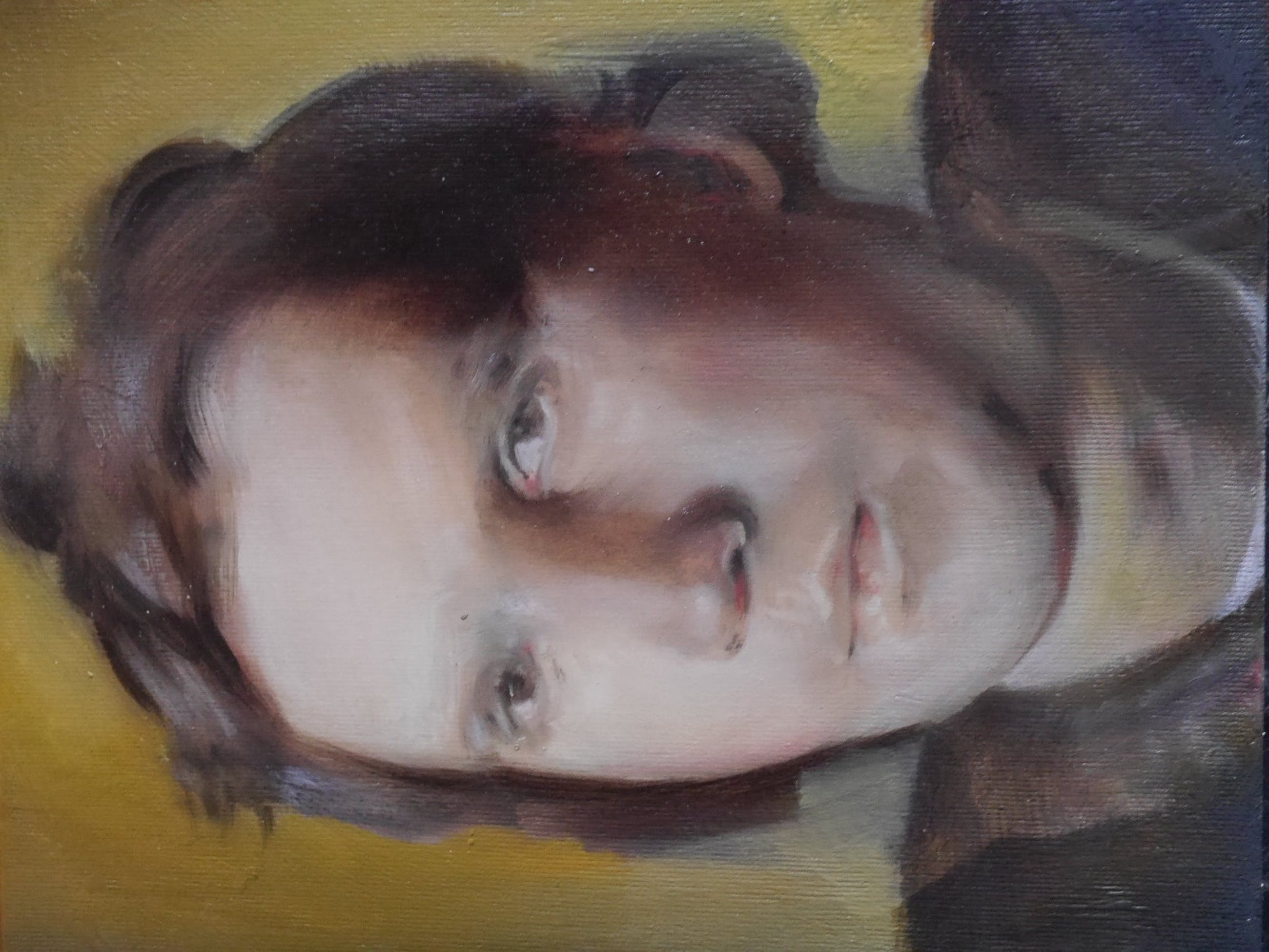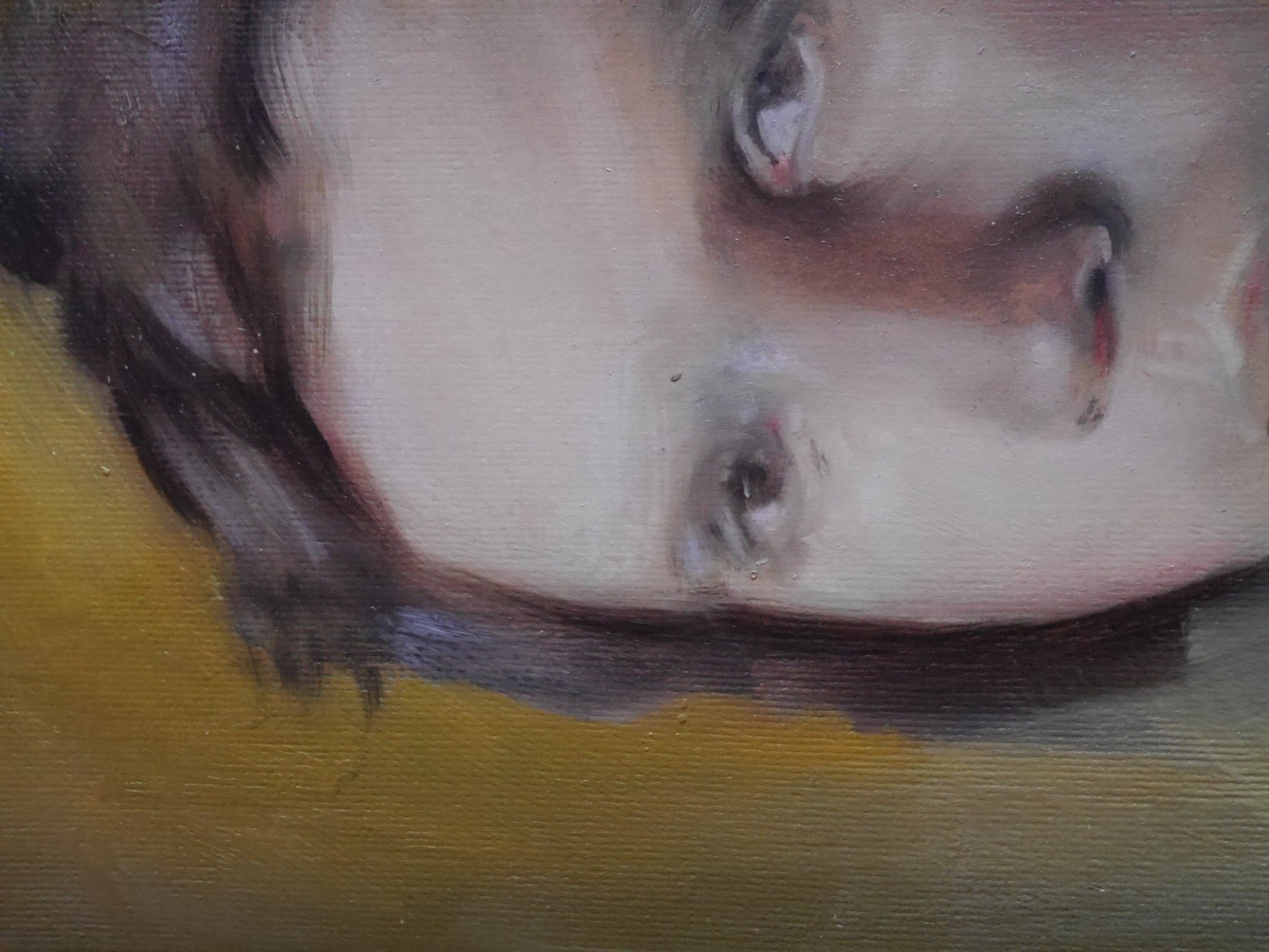 fraai portret van een jonge man in ouderwets realistische manier van schilderen neergezet.de achterkant van het doek is voorzien van een houten paneel...zodat het lang tegen schade bestand is getekend op het paneel aan de achterkant.