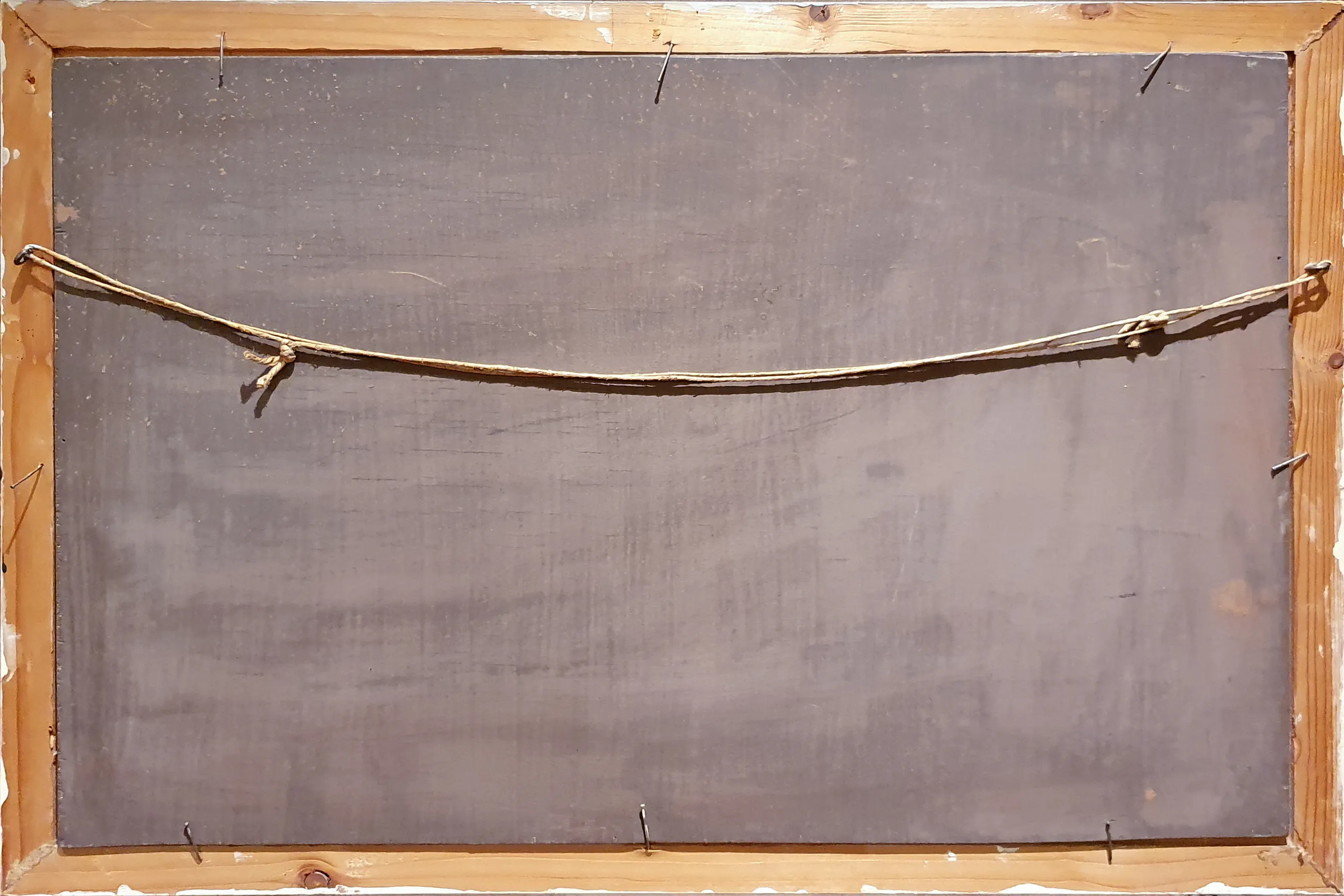 Paar kleine krasjes op de laklaag van de lijst.Langs de onderste rand een paar kleine plekjes verfverlies langs de rand van de lijst, grotendeels daarachter. Paar hele kleine vlekjes op de verflaag, waarschijnlijk goed schoon te maken. De voorstelling zelf is in zeer goede conditie.