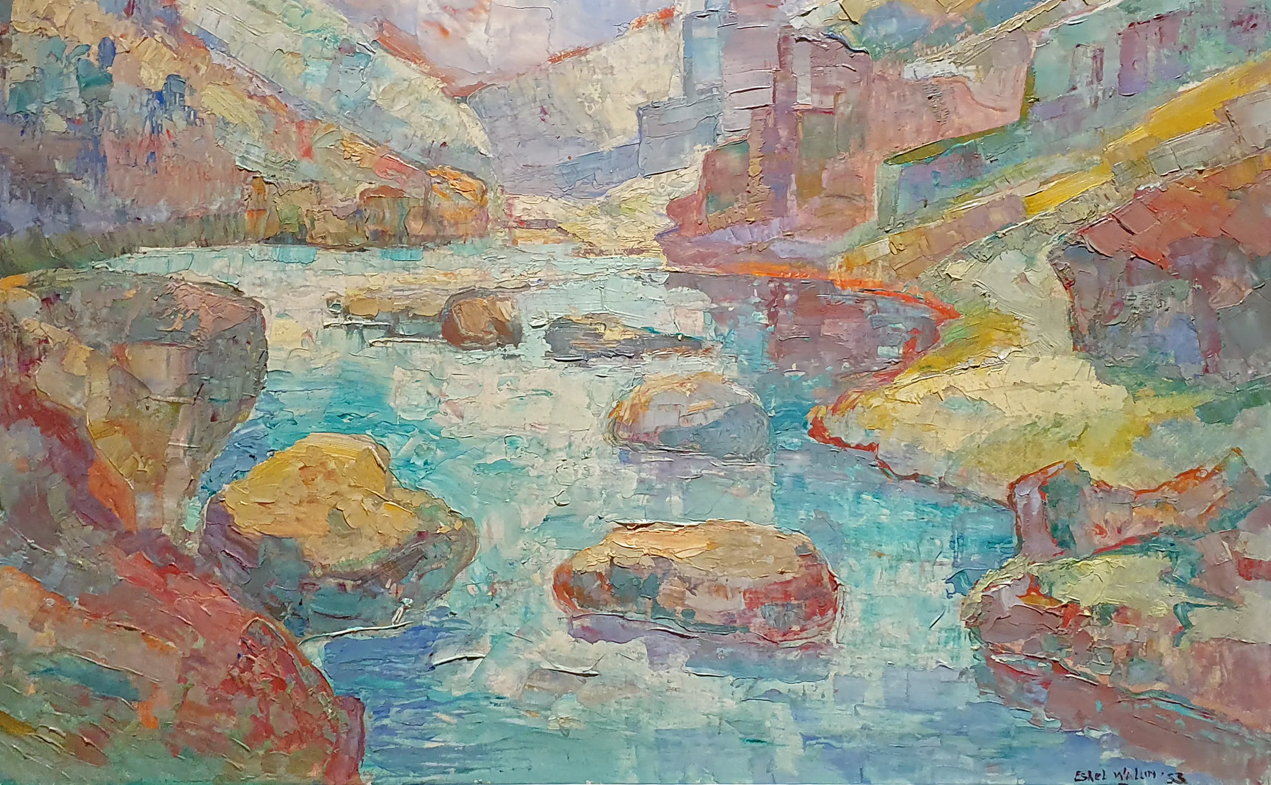 Kleurrijke, expressieve voorstelling van een rivier met daaromheen stenen/rotsen die door een kloof stroomt. Het werk is geschilderd door Eskel Wallin en is een later werk uit zijn oeuvre. Het is met de voor Wallin kenmerkende vlugge toets en korte strepen geschilderd waardoor de verf op veel plekken dik op het paneel zit, wat bijdraagt aan het mooie effect van de voorstelling en kleurcontrasten.