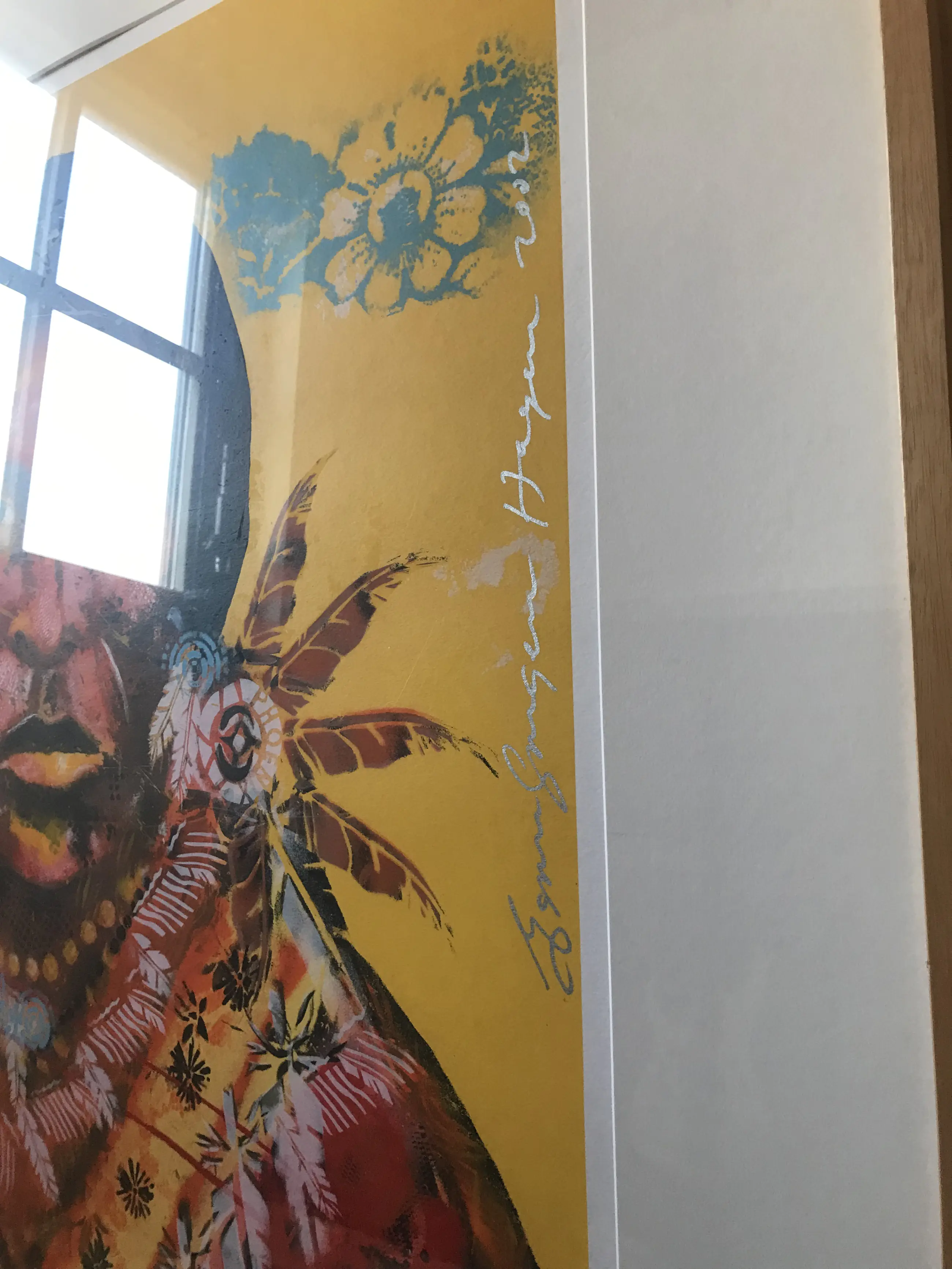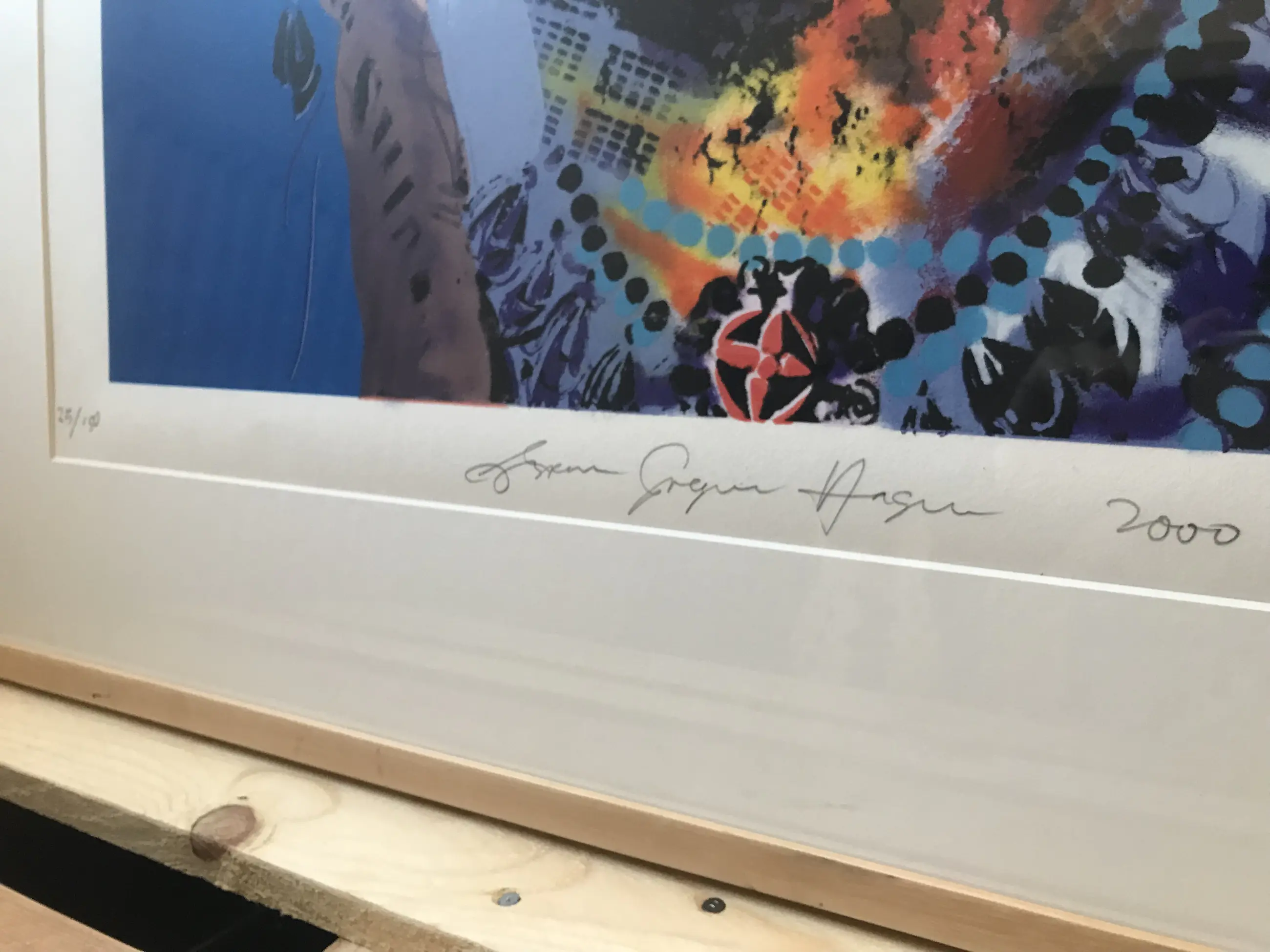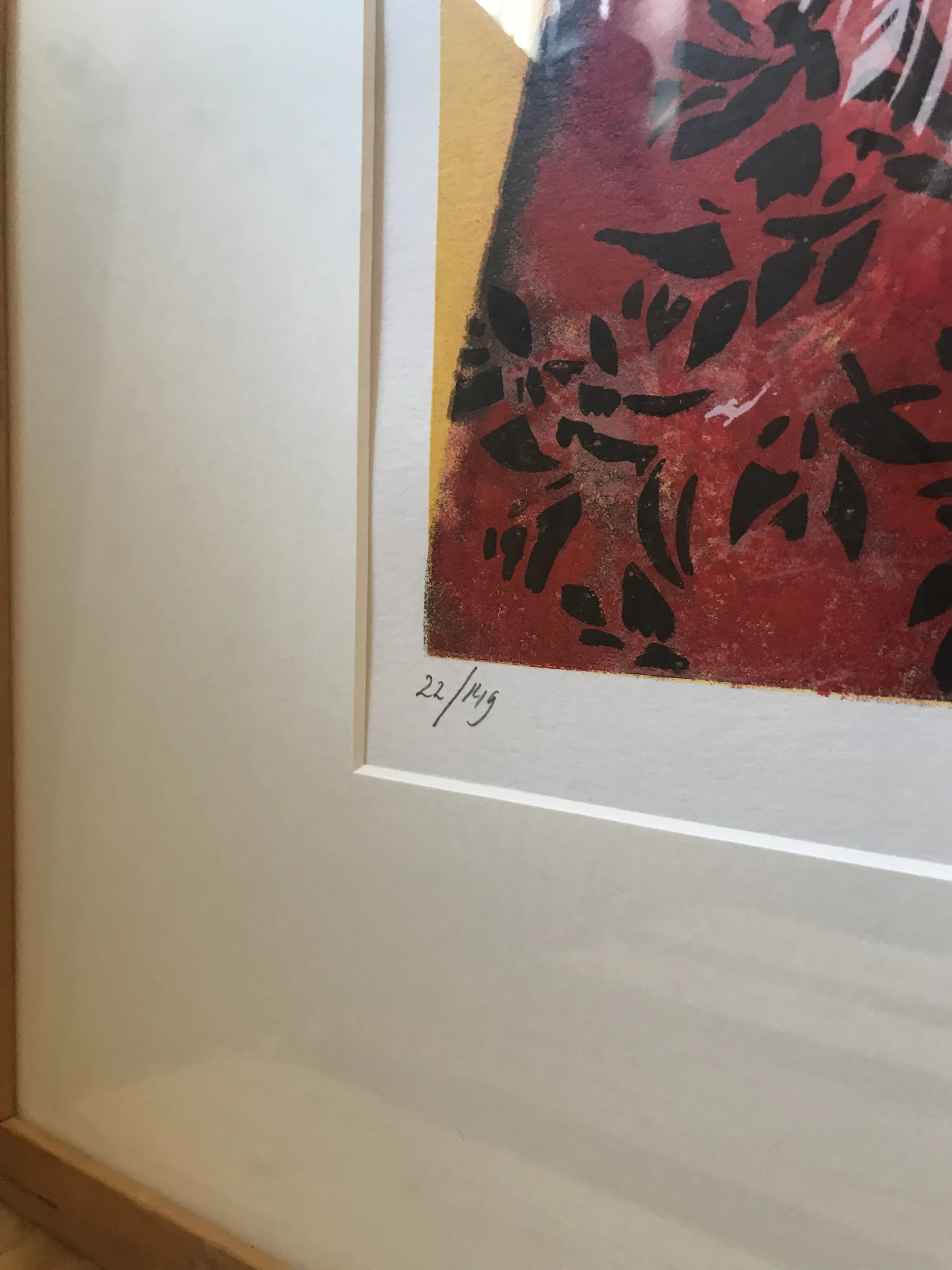 - Zeefdruk ingelijst met passe-partout / glas + houten lijst