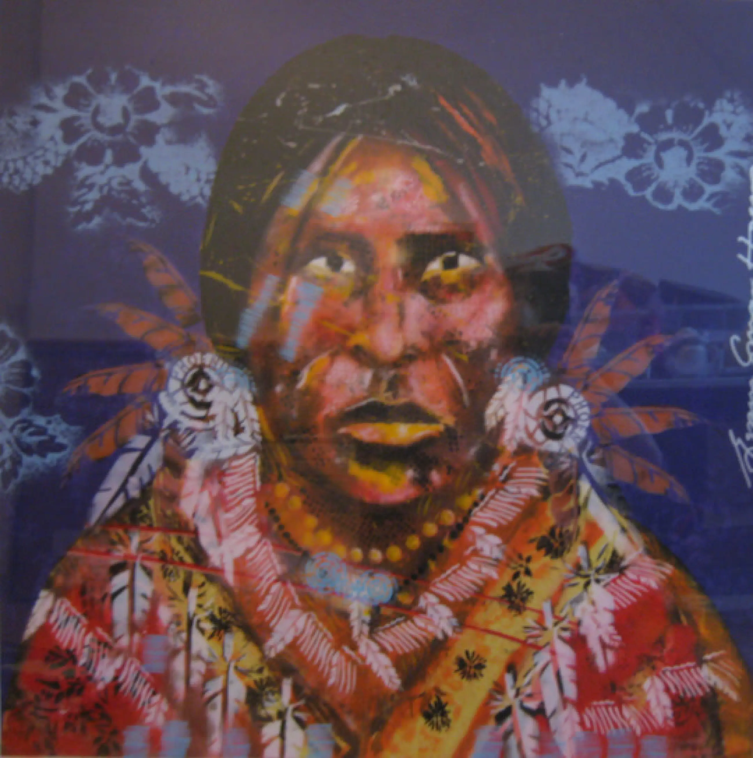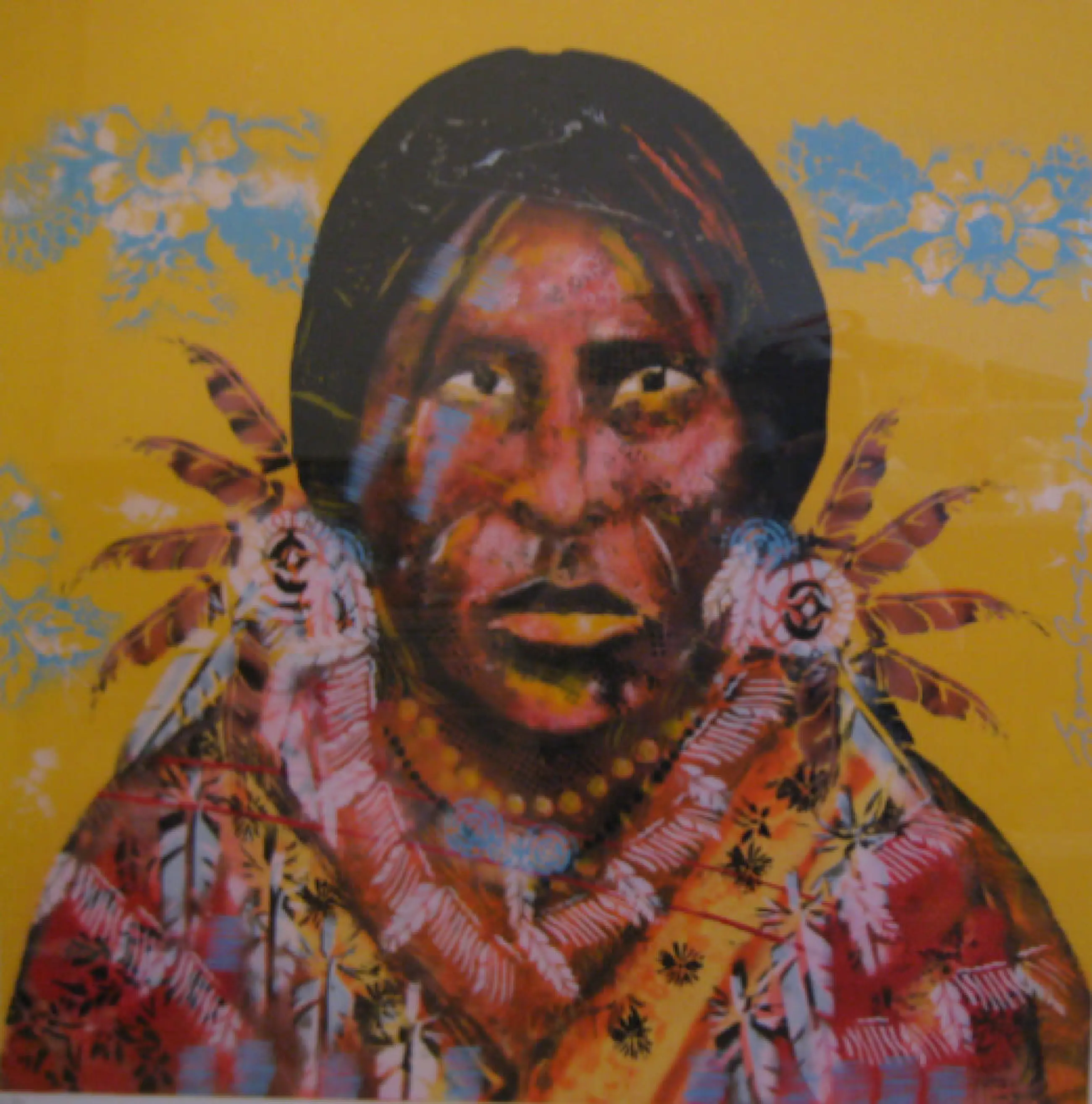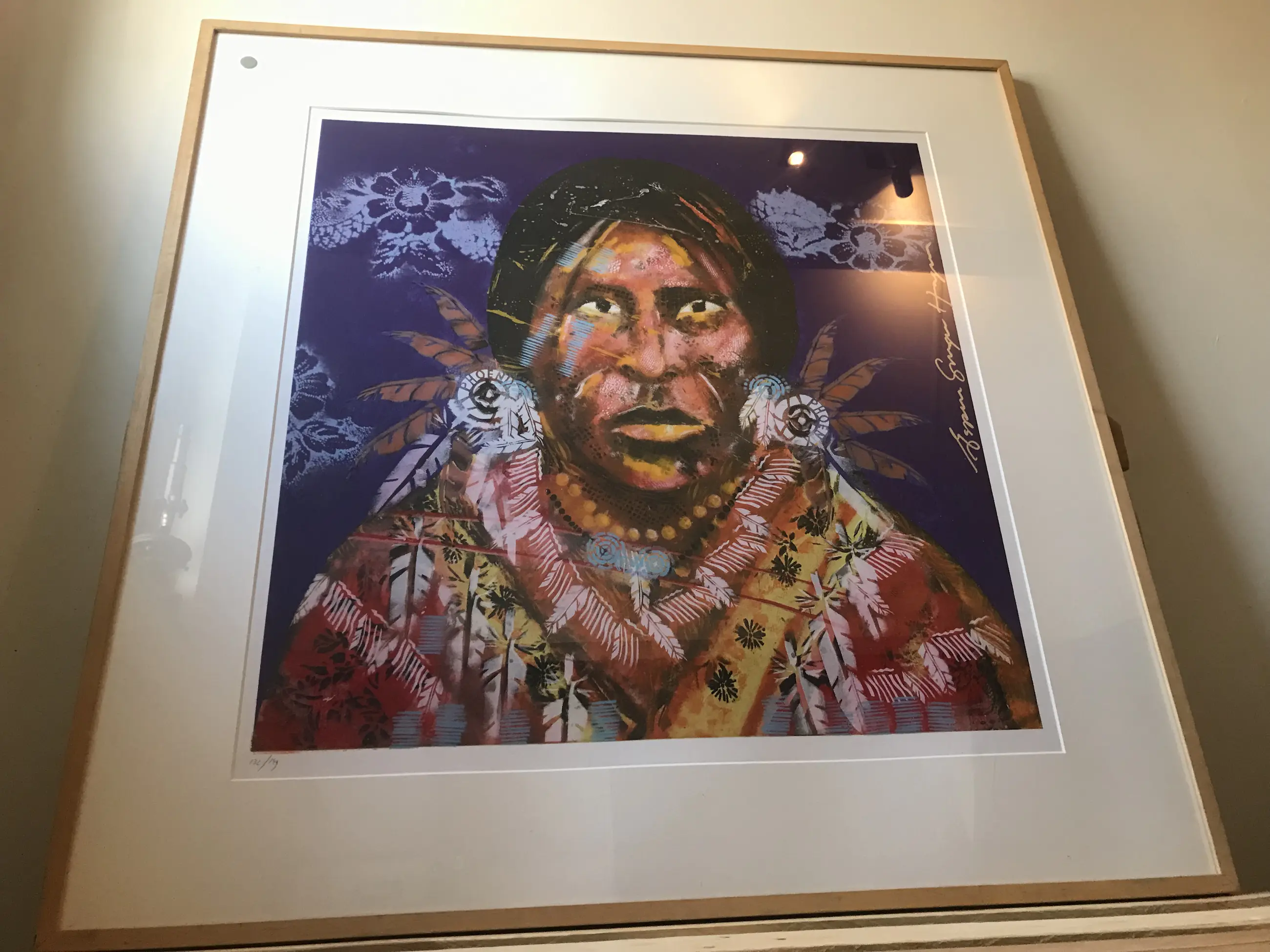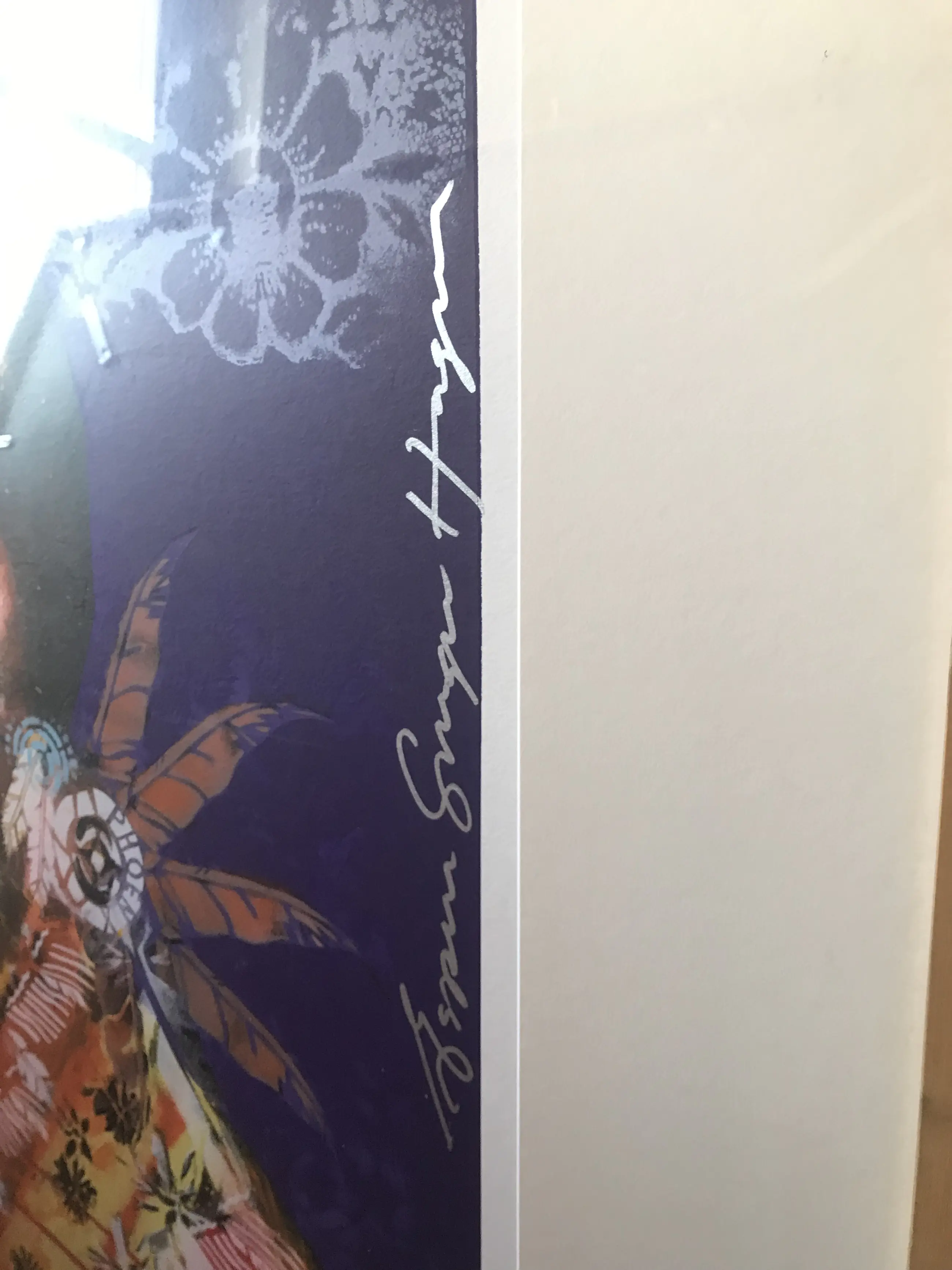 - Zeefdruk ingelijst met passe-partout / glas + houten lijst
