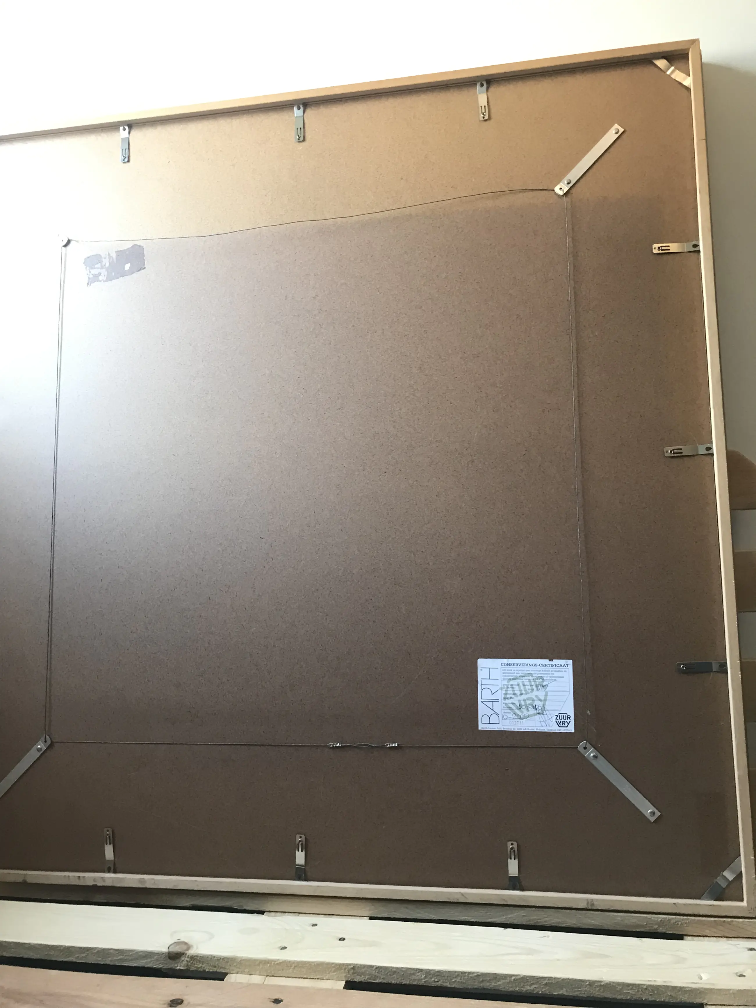 Ze hebben lang in opslag gestaan en er is een klein beetje werk aan. De passe-partouts zijn licht gebobbeld waardoor er iets opvulling aan de achterkant van de zeefdrukken geplaatst moet worden om het weer strak ingelijst te krijgen.