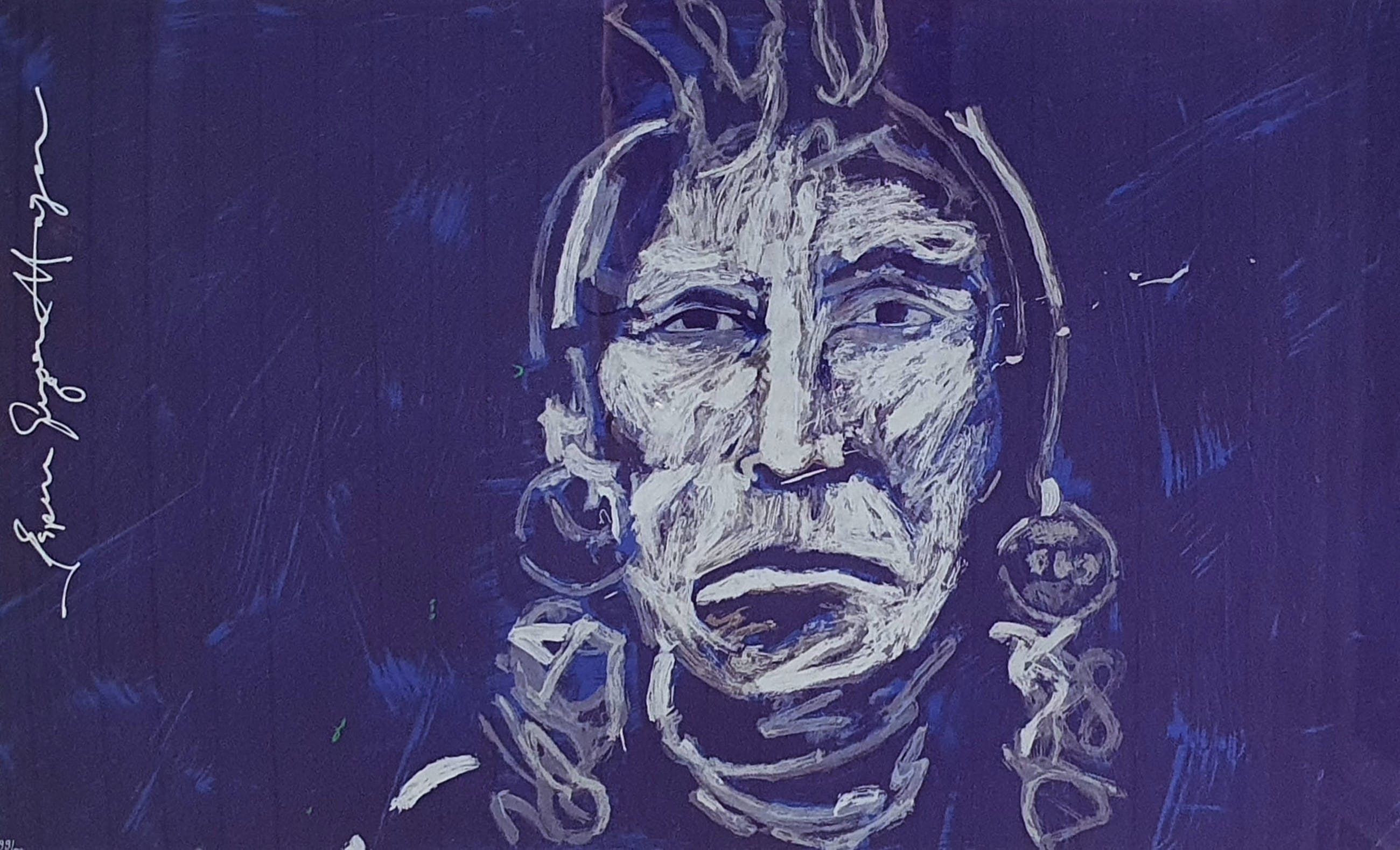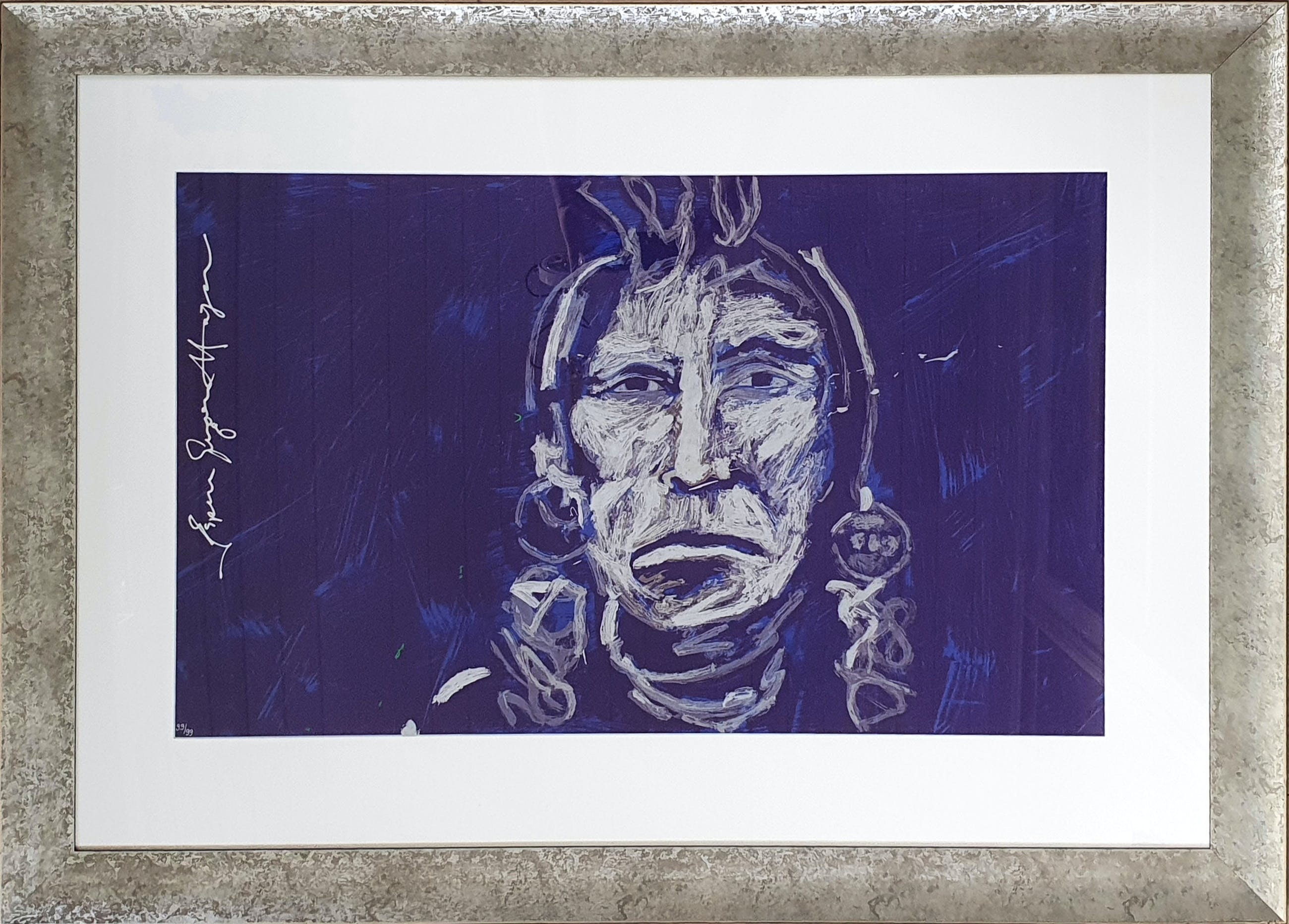 Zeefdruk van Espen Greger Hagen. De zeefdruk bestaat uit een blauwe achtergrond en het indianenhoofd is opgebouwd uit diverse kleuren zilver en een vleugje goud.
