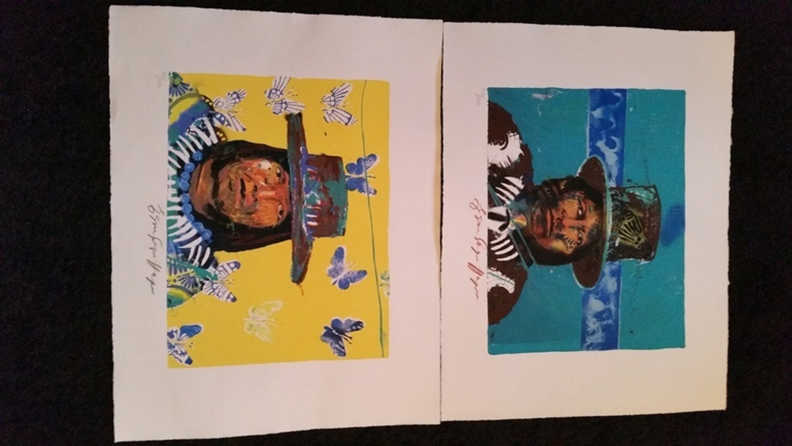 2 zeefdrukken op geschept papier handgesigneerd, afmetingen 505 x 650 mm.