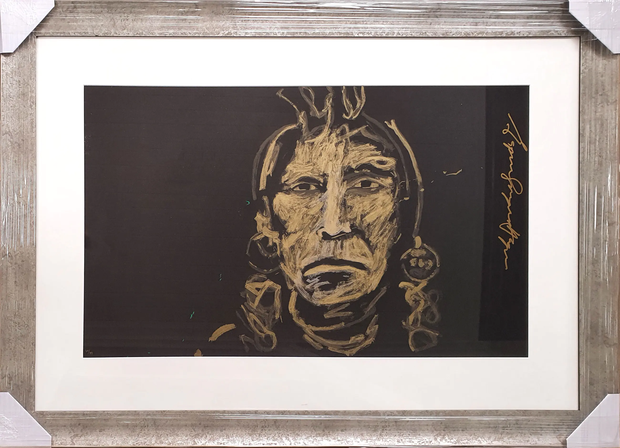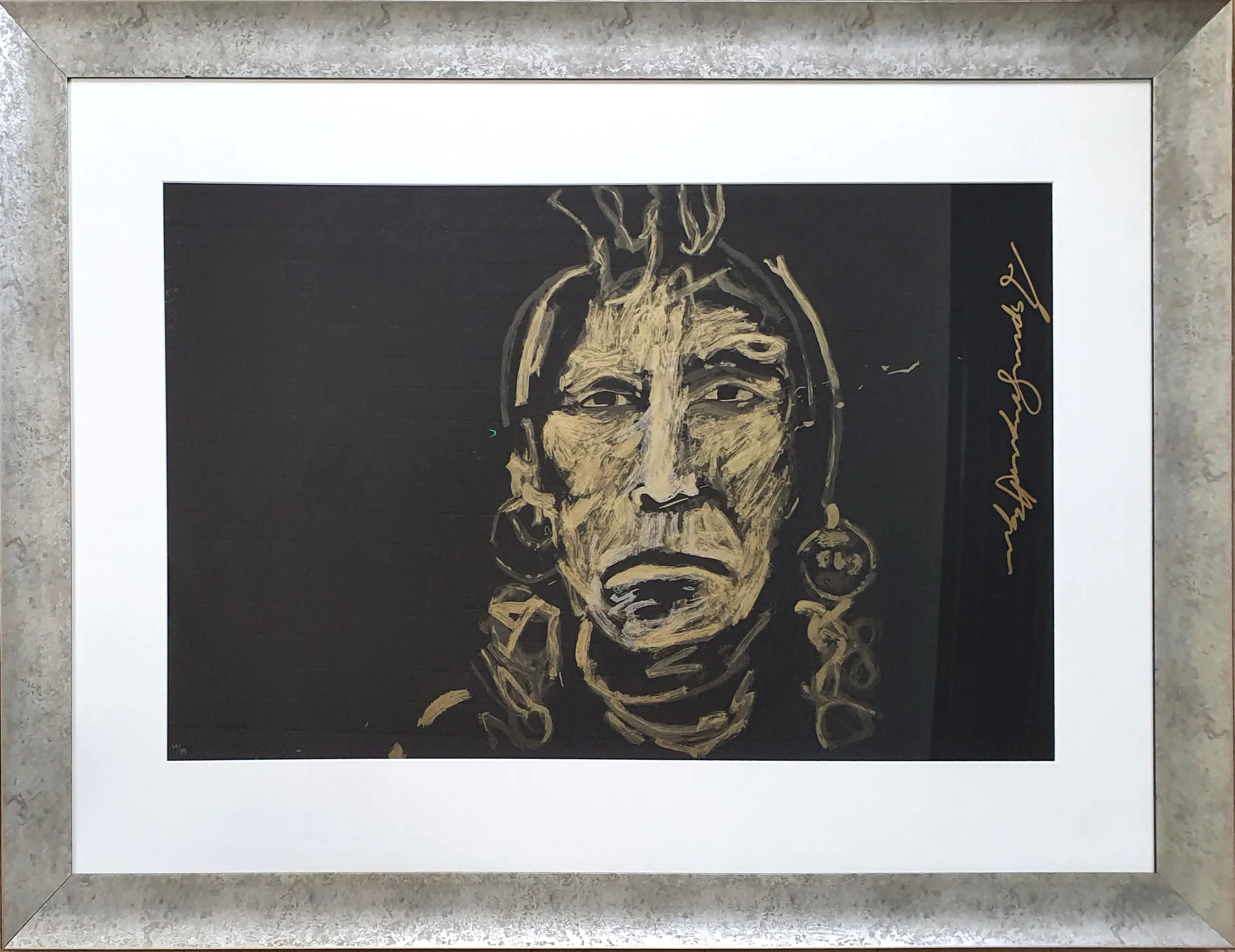 Kunstenaar: Espen Hagen Titel: Gold chief on black Periode: 1945-1999 Techniek: Zeefdruk Oplage: 40/99 Gesigneerd: Rechtsmidden Afwerking: Ingelijst Afmeting voorstelling (HxB): 59 x 79 cm Afmeting lijst (HxB): 79 x 133 cm Conditie werk: Zeer goed Conditie lijst: Gebruikt Referentie: ZK300534