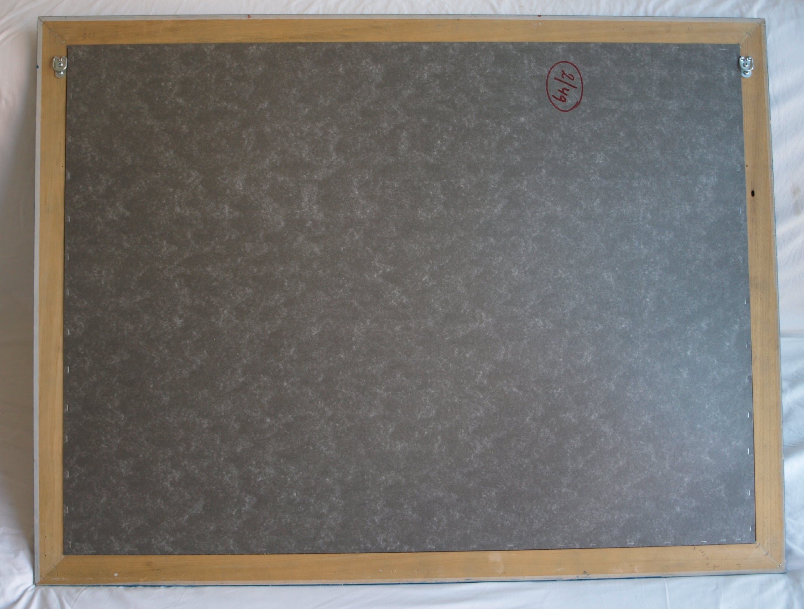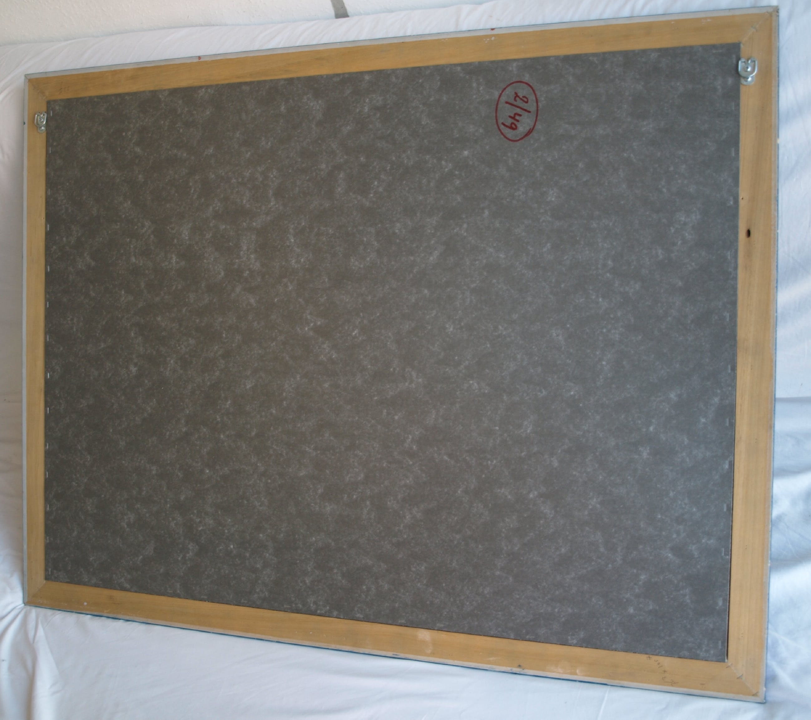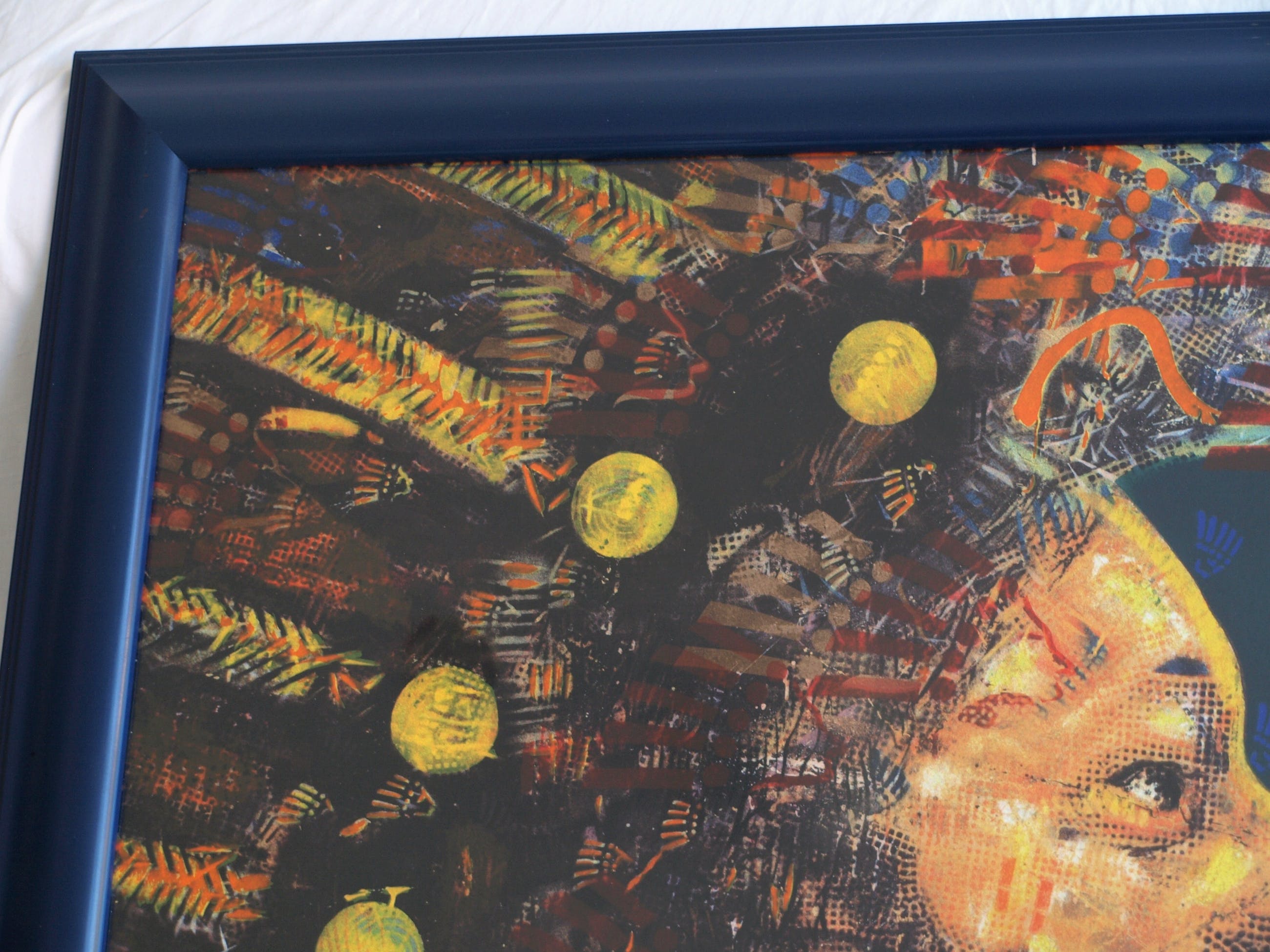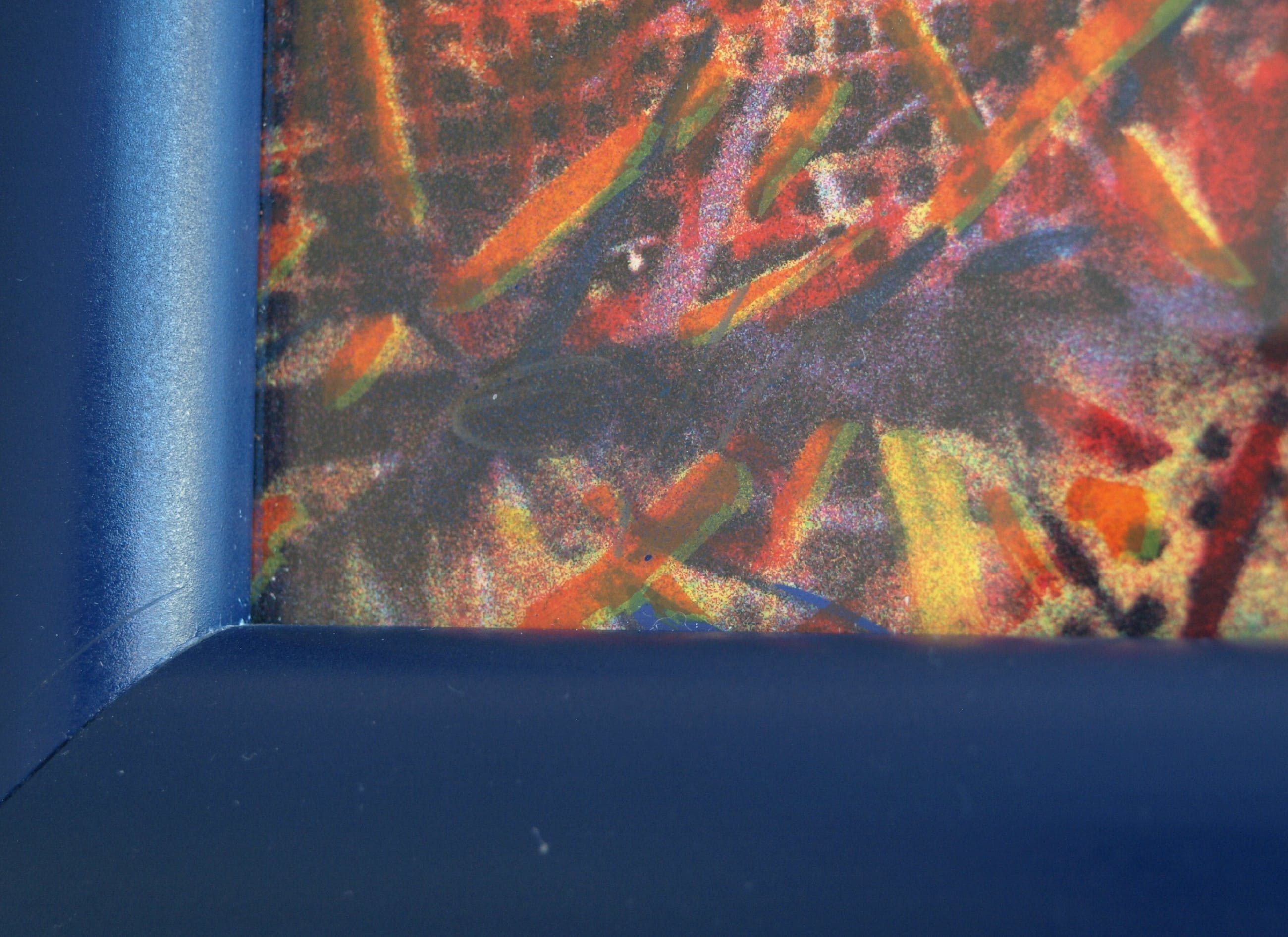 | De zeefdruk is in goede staat. De houten lijst heeft slijtplekjes en heeft kleine beschadigingen aan de blauwe toplaag, die zijn ‘aangestipt’ met blauwe verf. Zie ook de foto’s. Klaar om op te hangen. | |