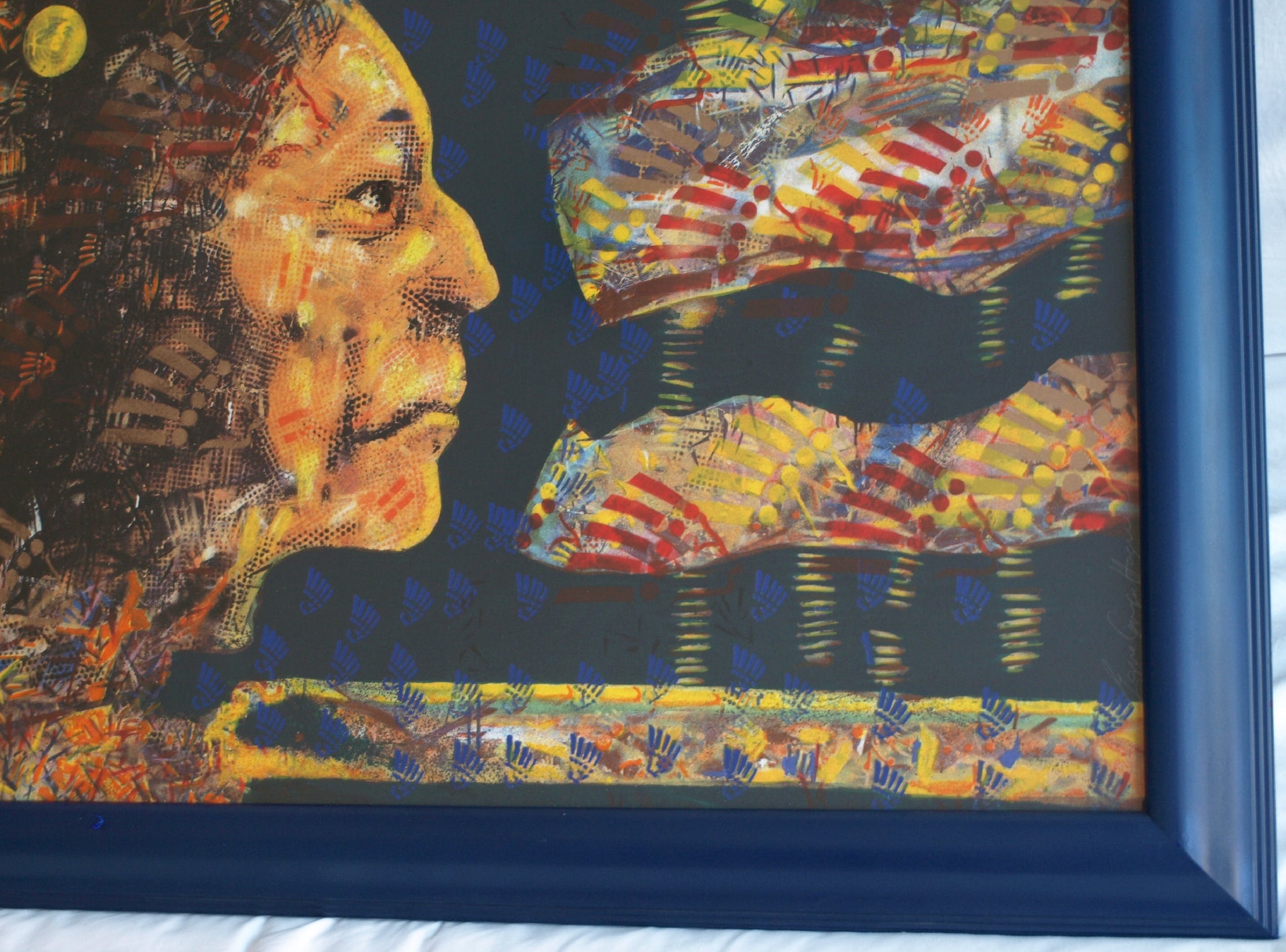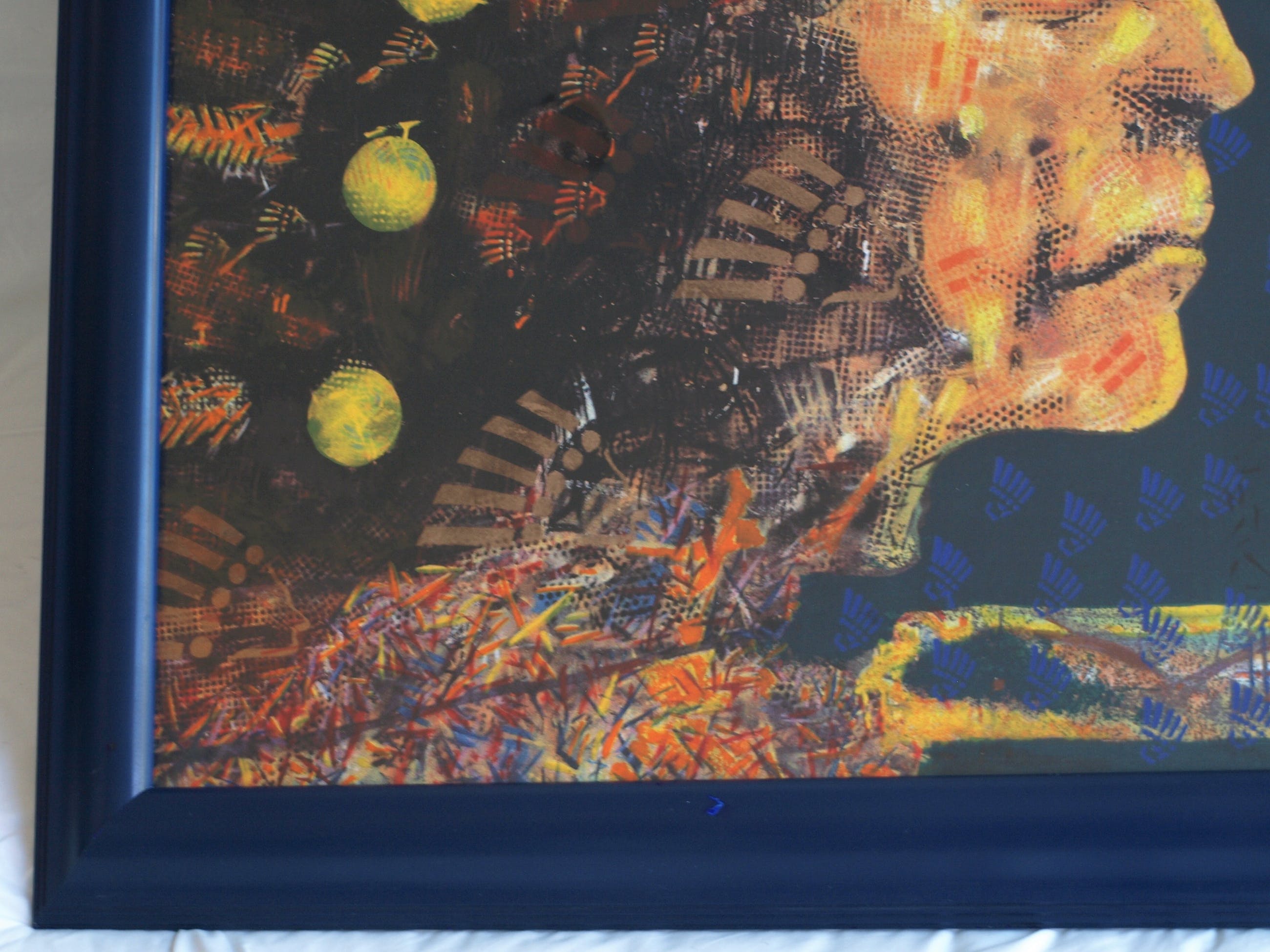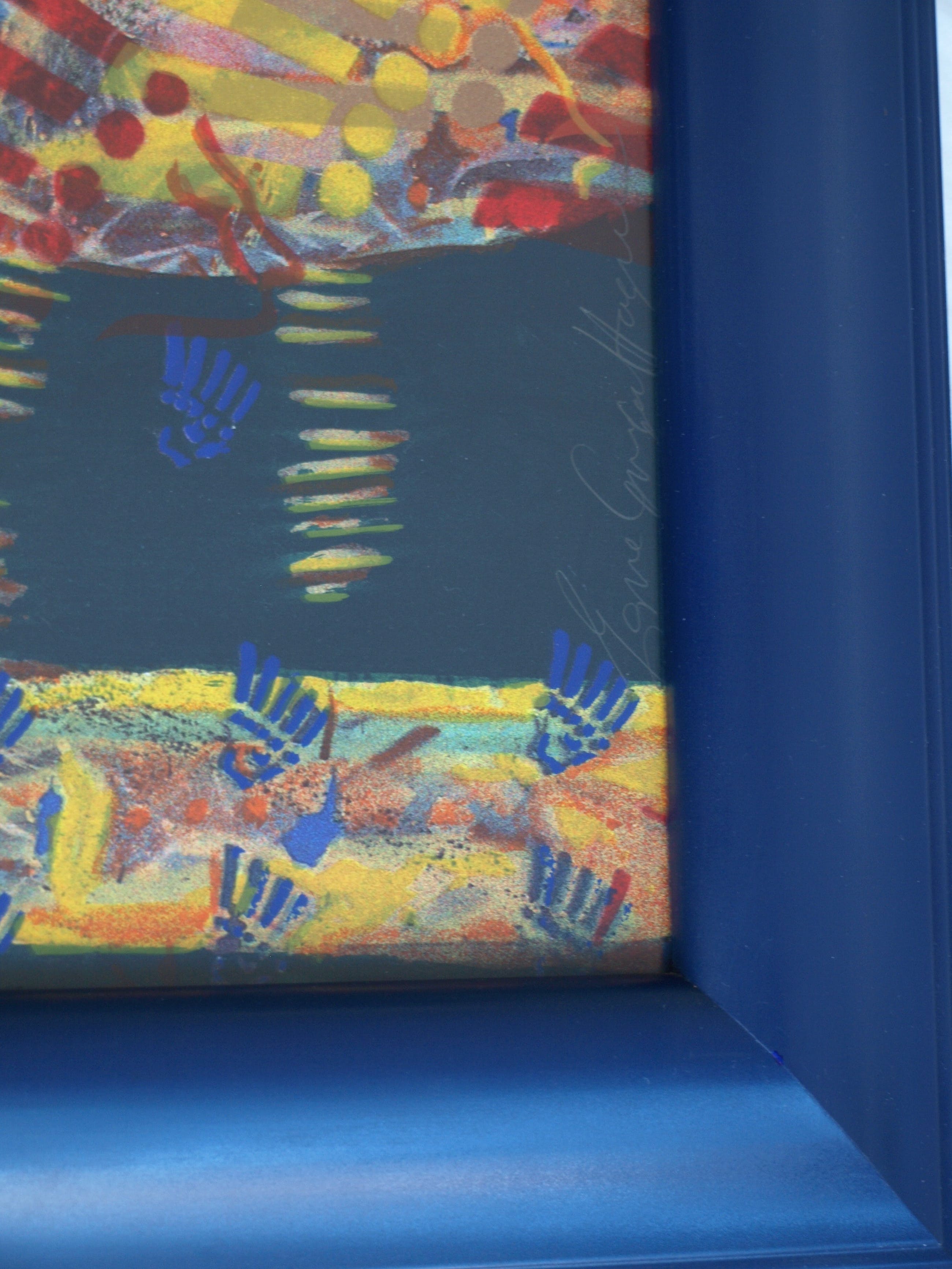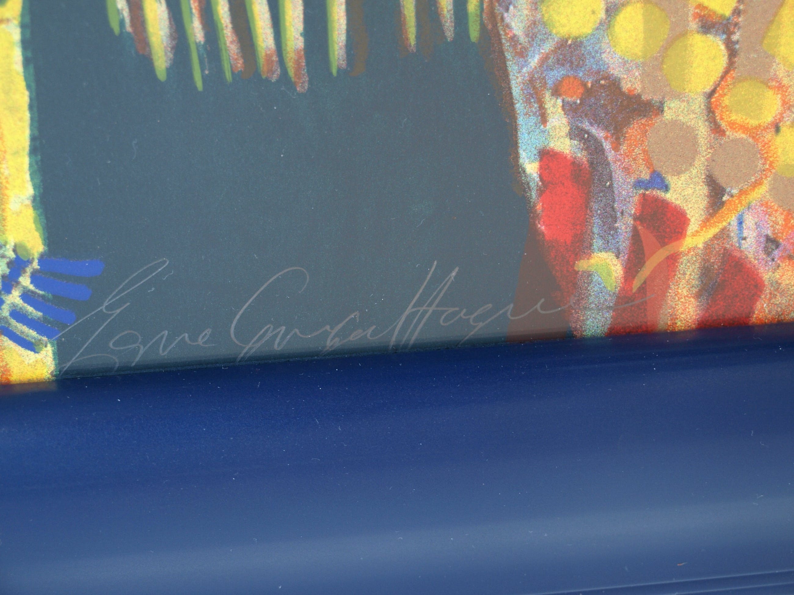 | De zeefdruk is in goede staat. De houten lijst heeft slijtplekjes en heeft kleine beschadigingen aan de blauwe toplaag, die zijn ‘aangestipt’ met blauwe verf. Zie ook de foto’s. Klaar om op te hangen. | |