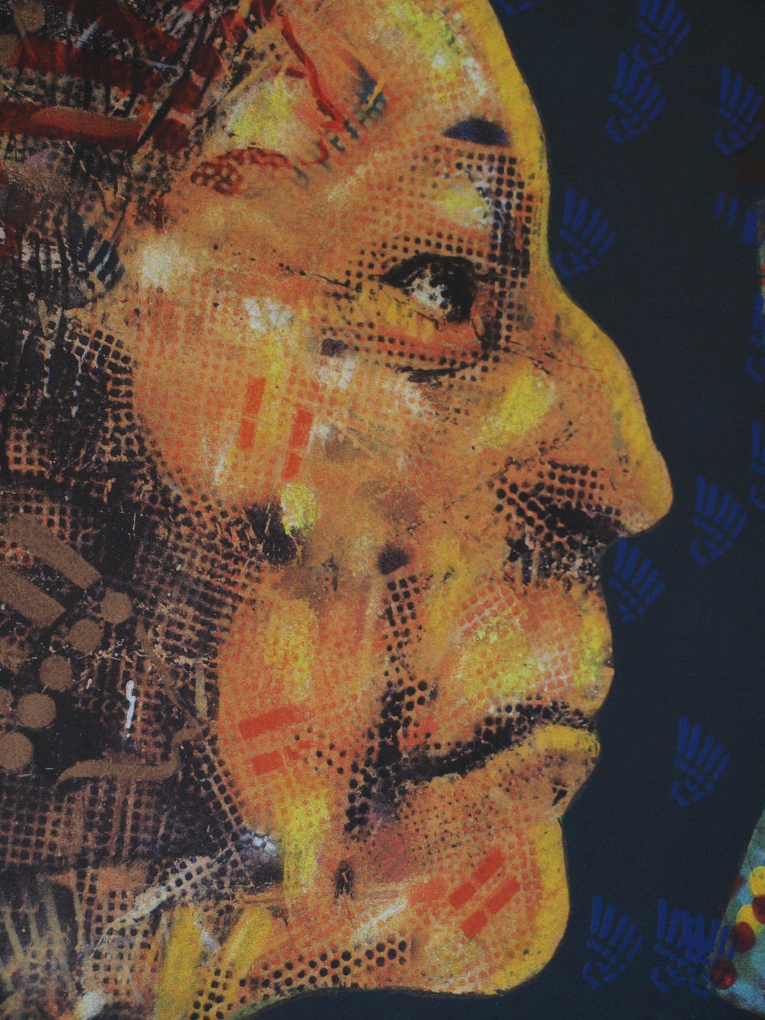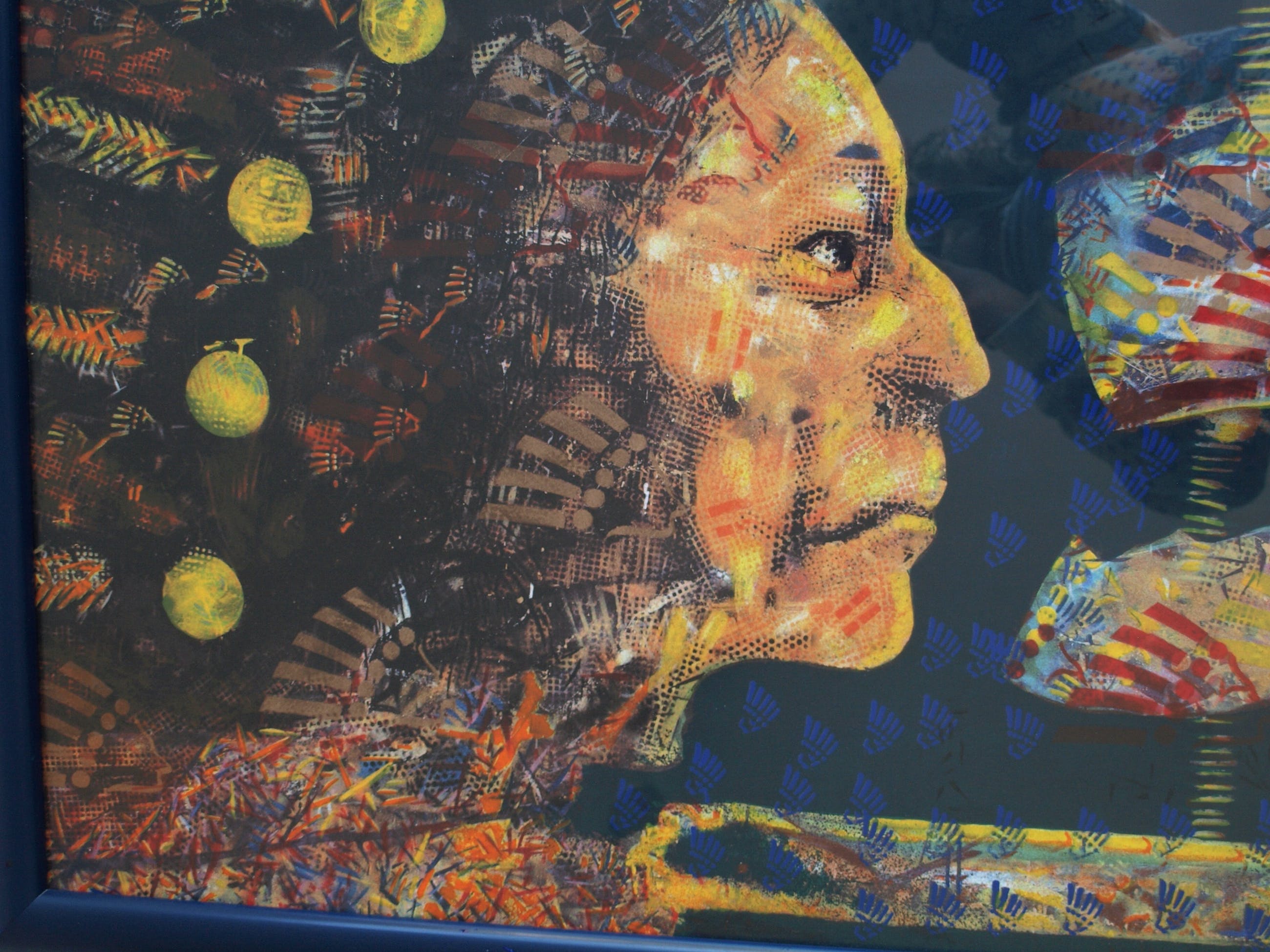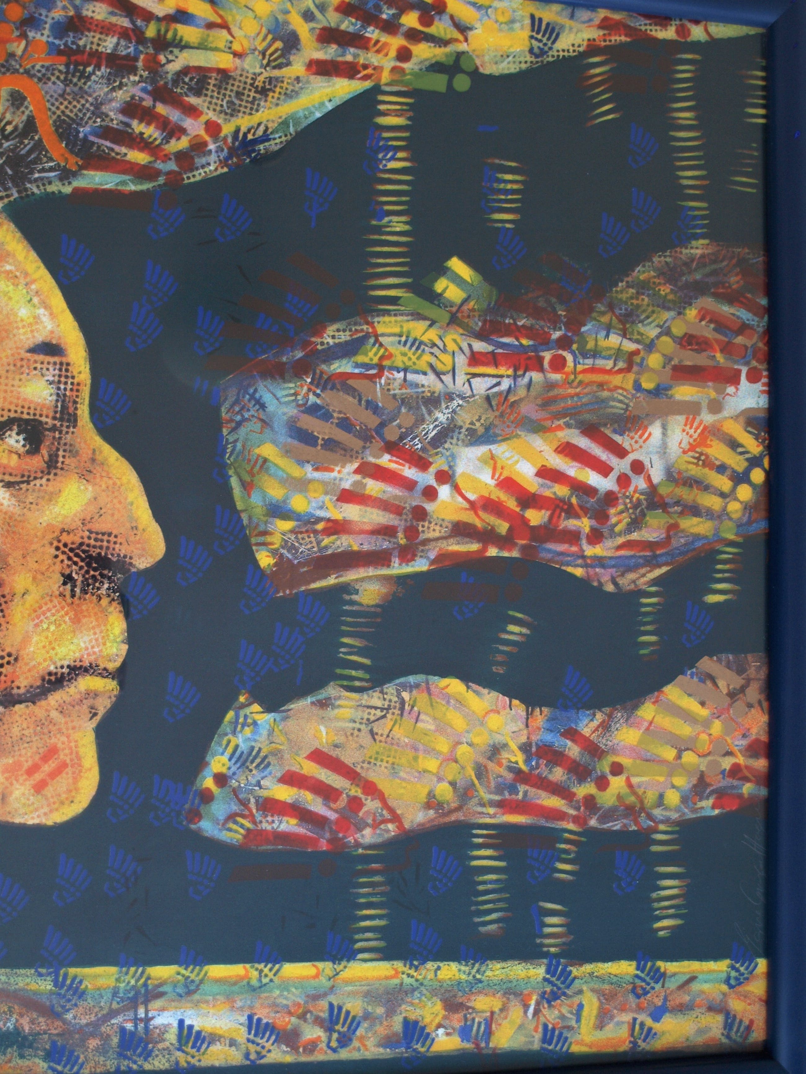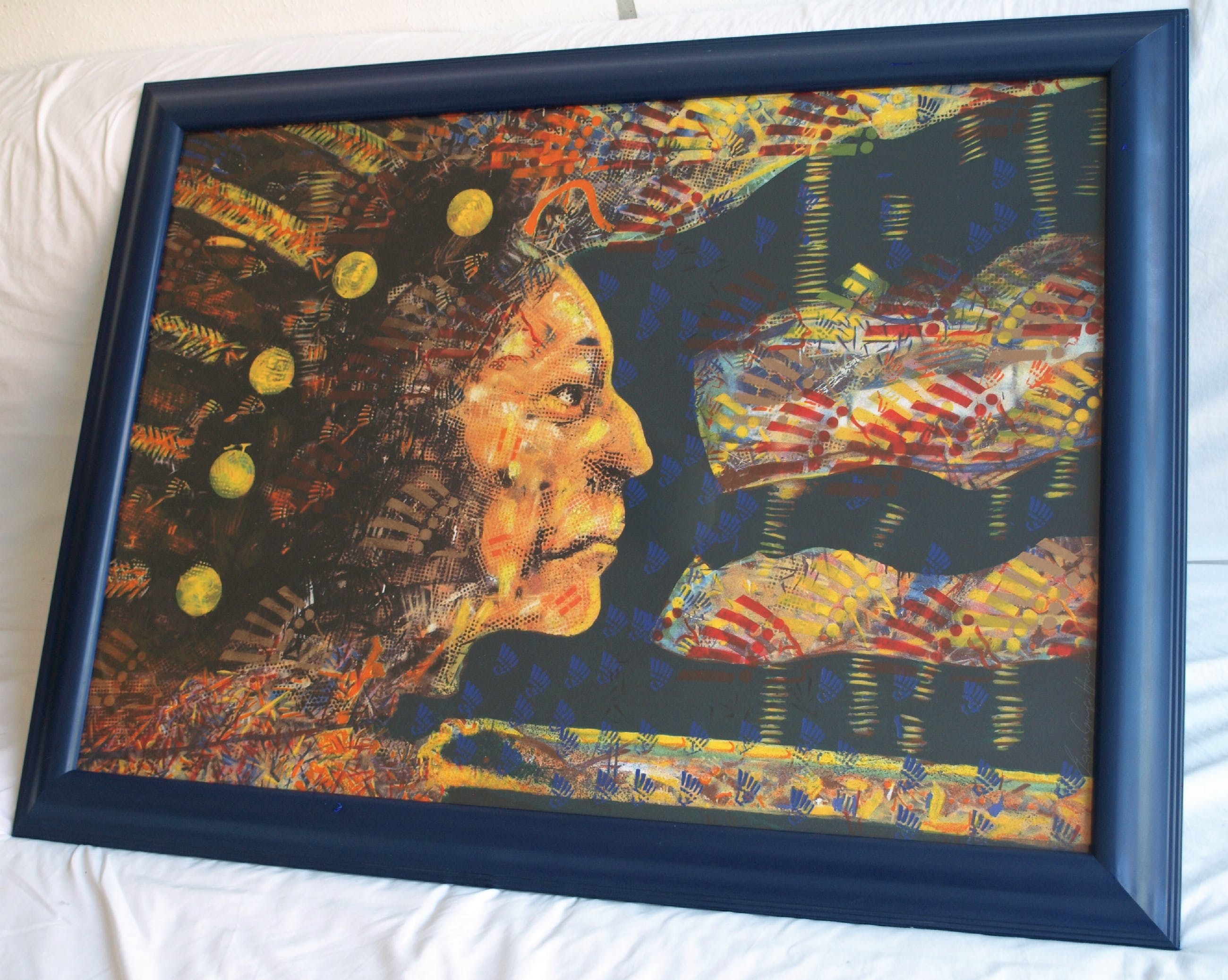 | De zeefdruk is in goede staat. De houten lijst heeft slijtplekjes en heeft kleine beschadigingen aan de blauwe toplaag, die zijn ‘aangestipt’ met blauwe verf. Zie ook de foto’s. Klaar om op te hangen. | |