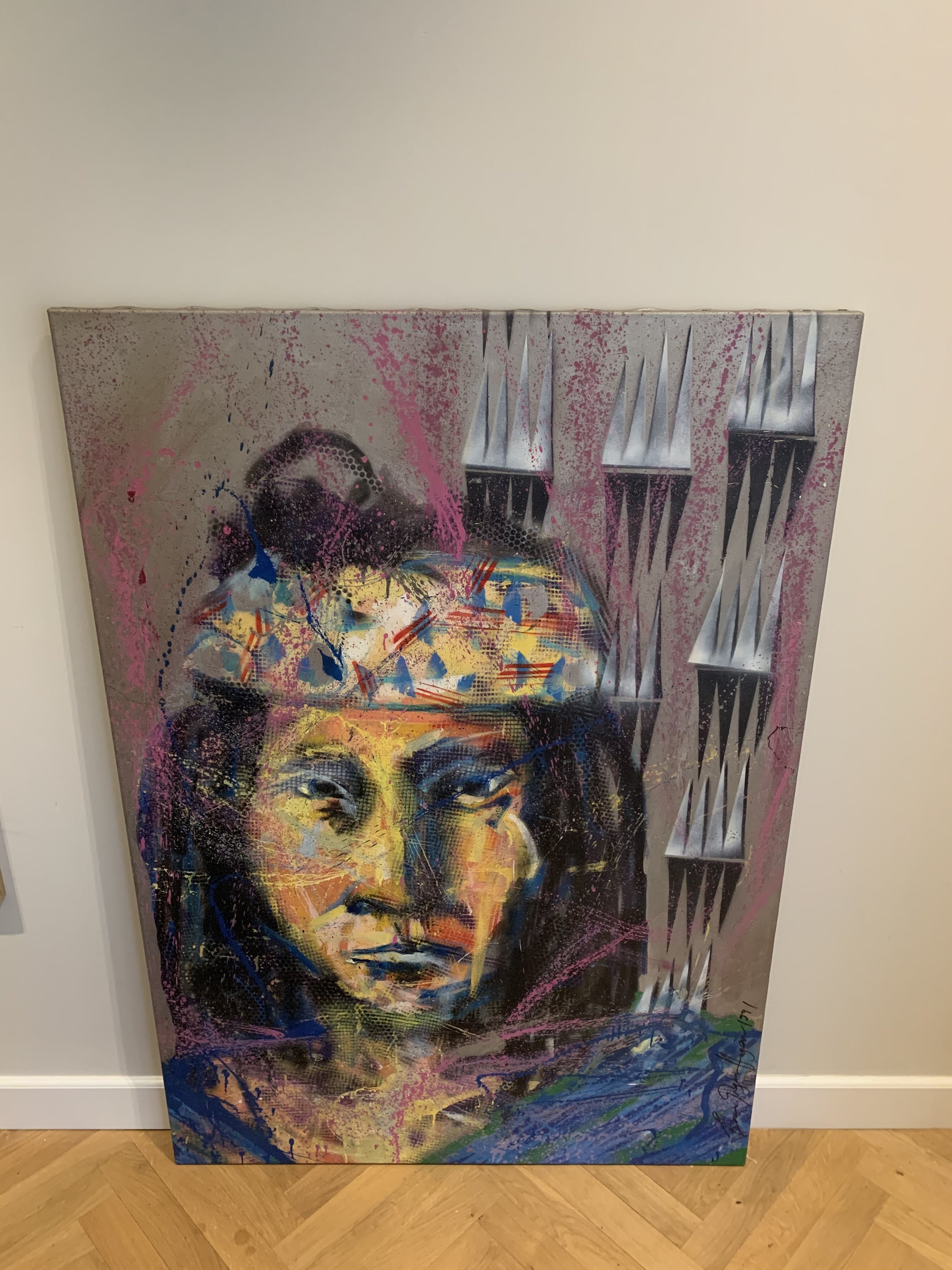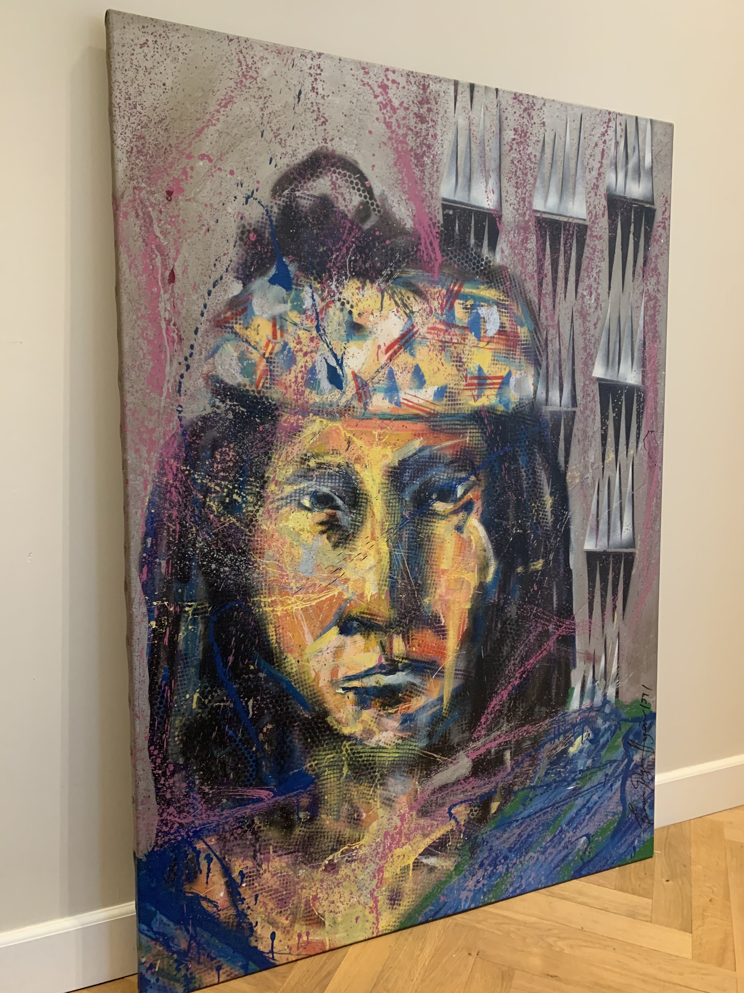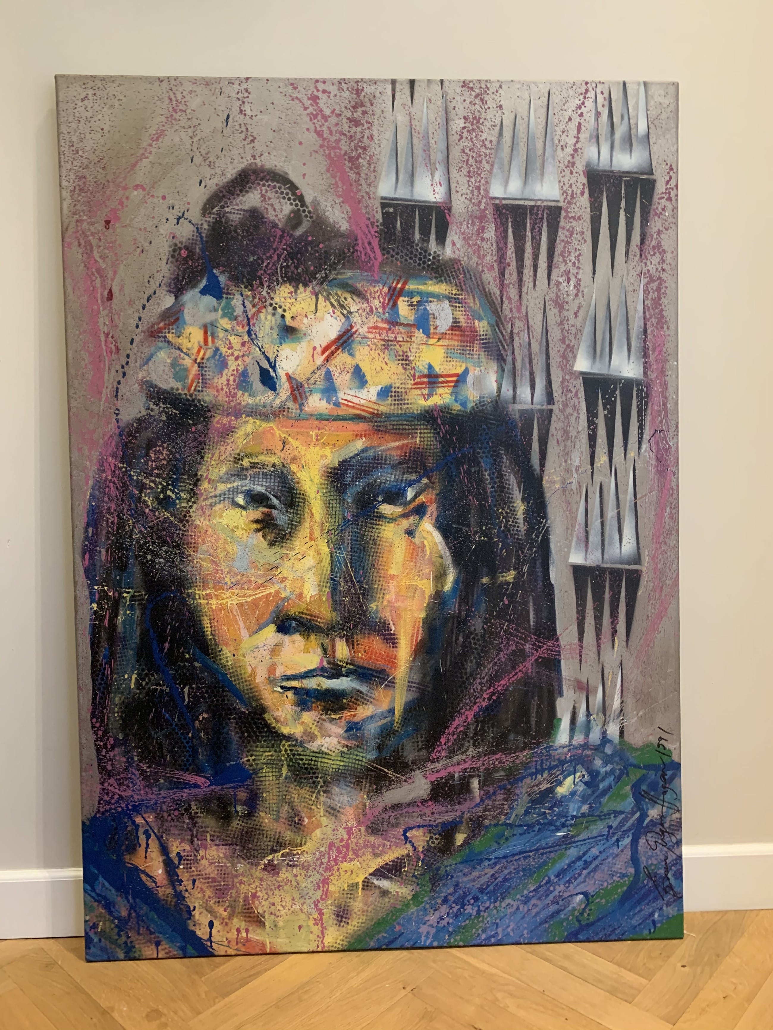 Zeer vroeg werk, 1 van zijn eerste Indianen, waar hij later zo beroemd mee is geworden. Gemaakt in 1991 en in perfecte staat. Origineel werk op doek waarbij diverse technieken zijn gebruikt.