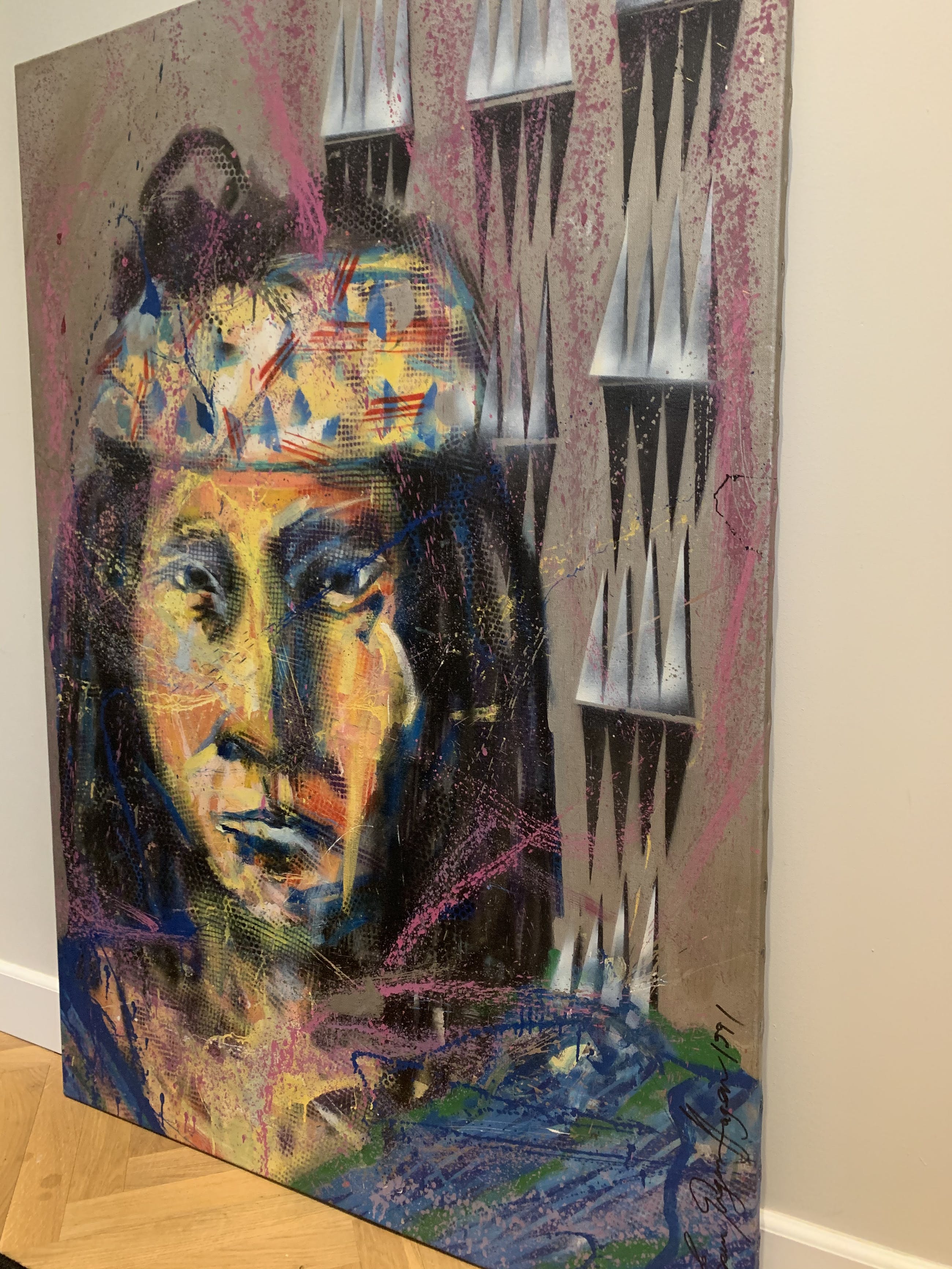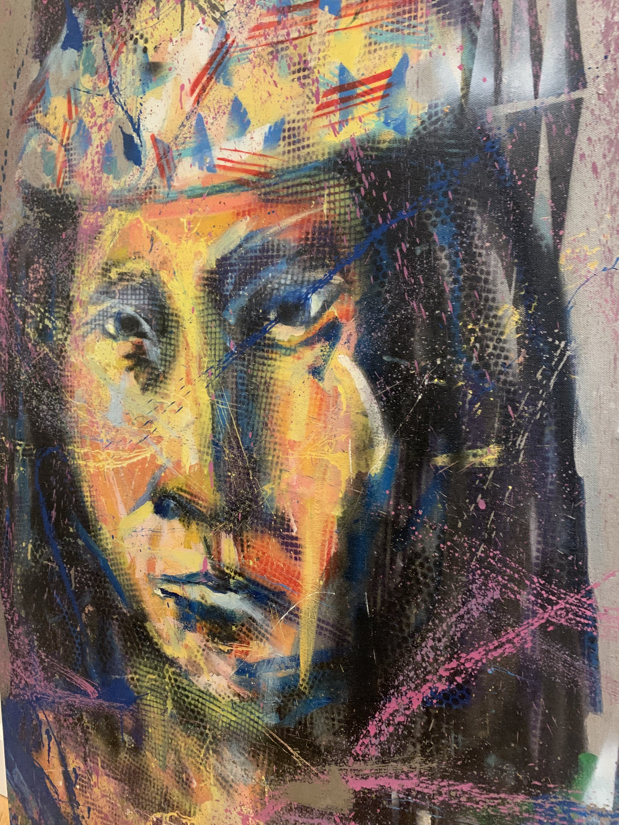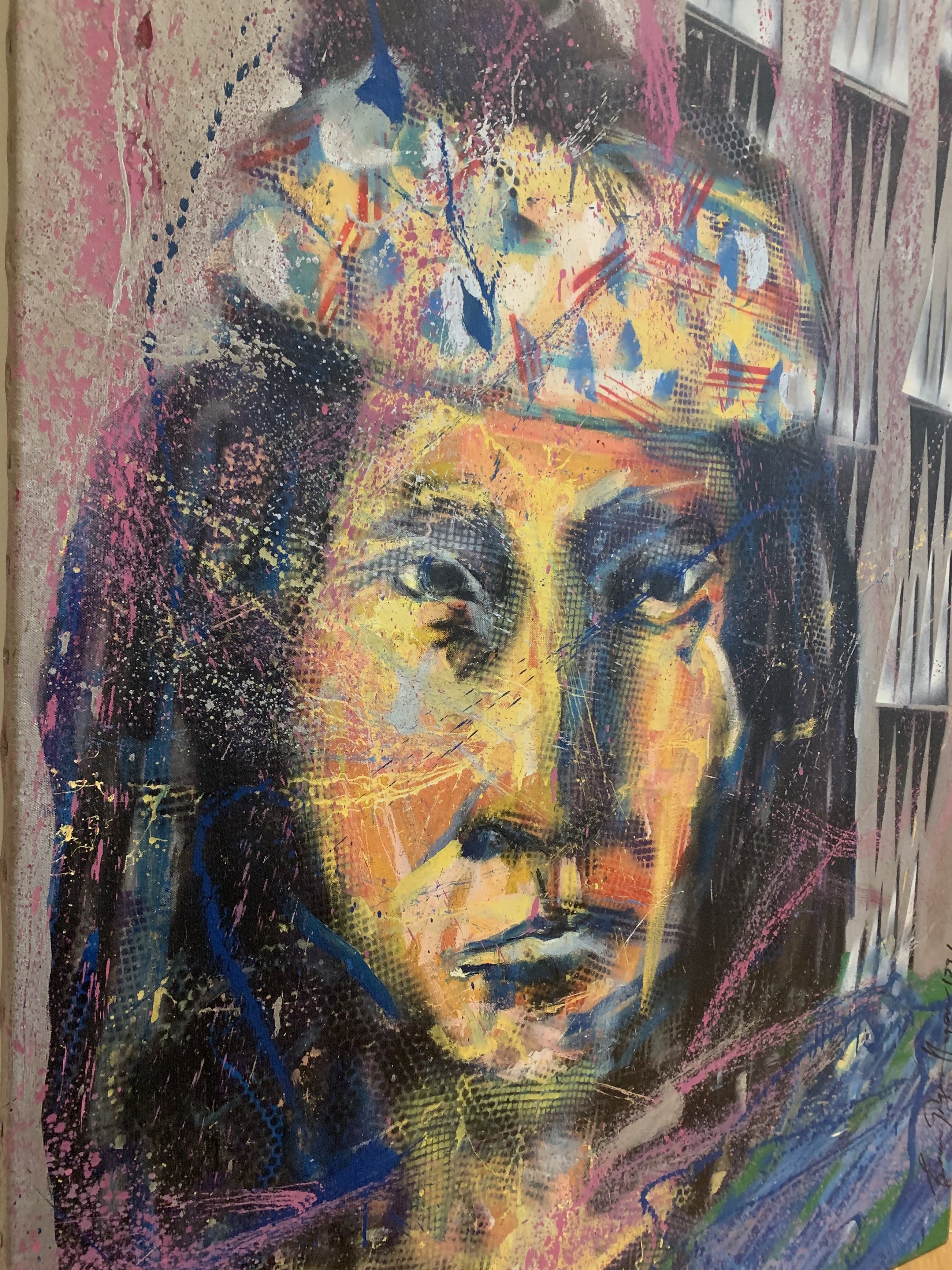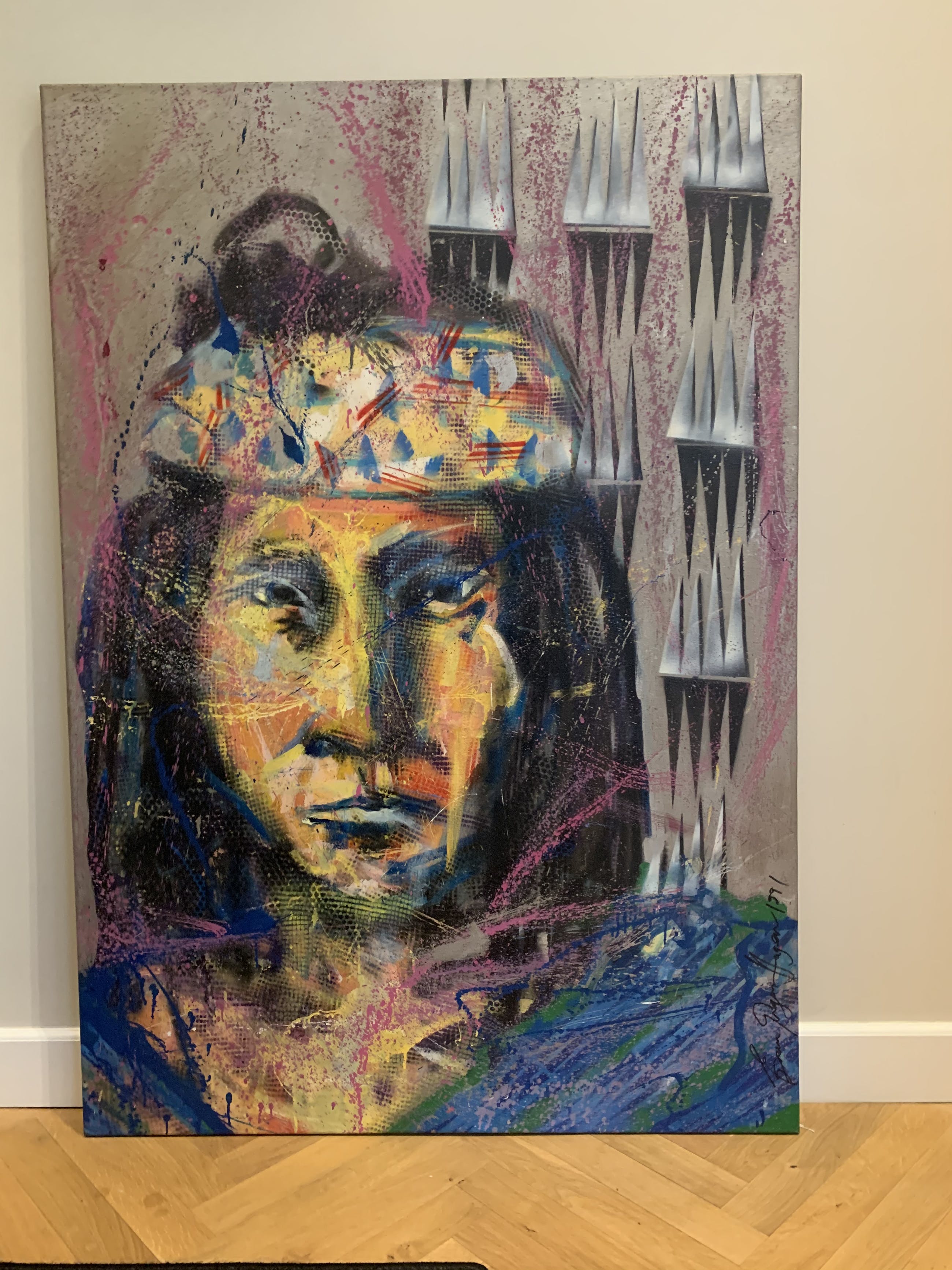 Zeer vroeg werk, 1 van zijn eerste Indianen, waar hij later zo beroemd mee is geworden. Gemaakt in 1991 en in perfecte staat. Origineel werk op doek waarbij diverse technieken zijn gebruikt.