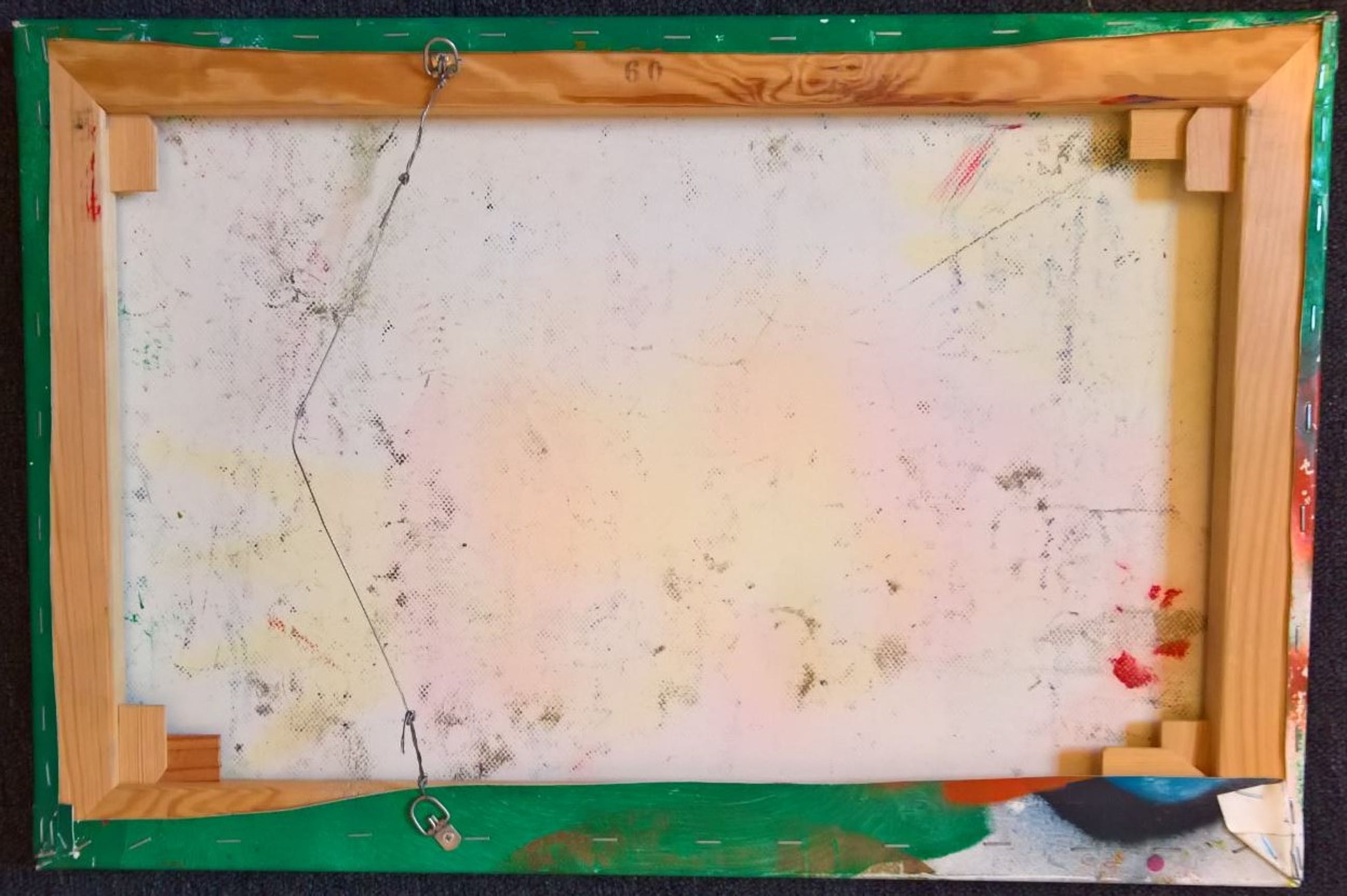 Bijzonderheden: niet gelijst, verf is doordat oorspronkelijk opgerold is meegenomen destijds er wat vanaf gegaan, dit is gefixeerd met een kwaliteitsvernis evenals de natuurlijke insluitsels in de verf tijdens de creatie van het werk.