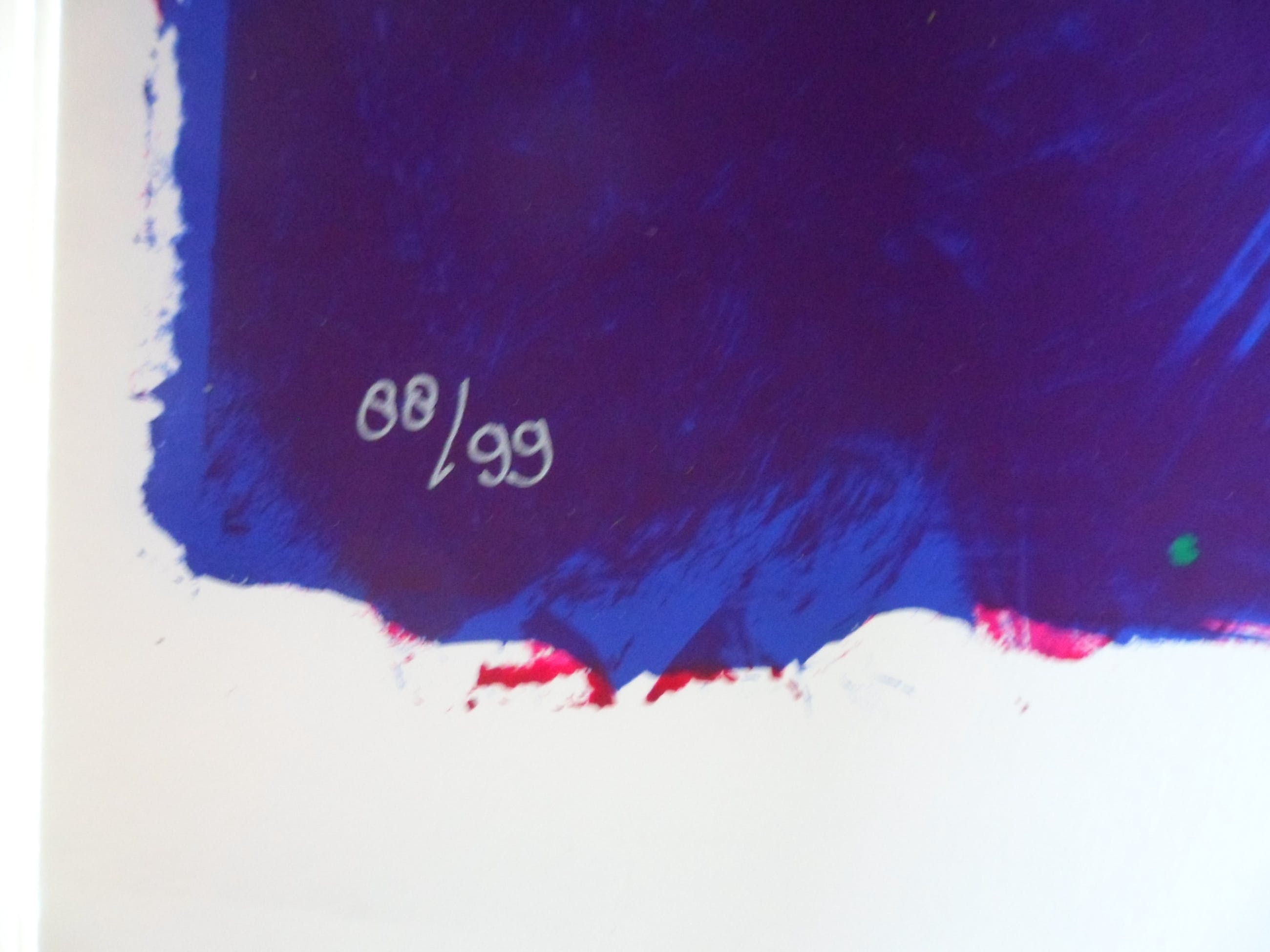 Een grote zeefdruk van de Noorse kunstenaar Espen Greger Hagen in prachtige helder kleuren en vormgeving op zwaar materiaal.