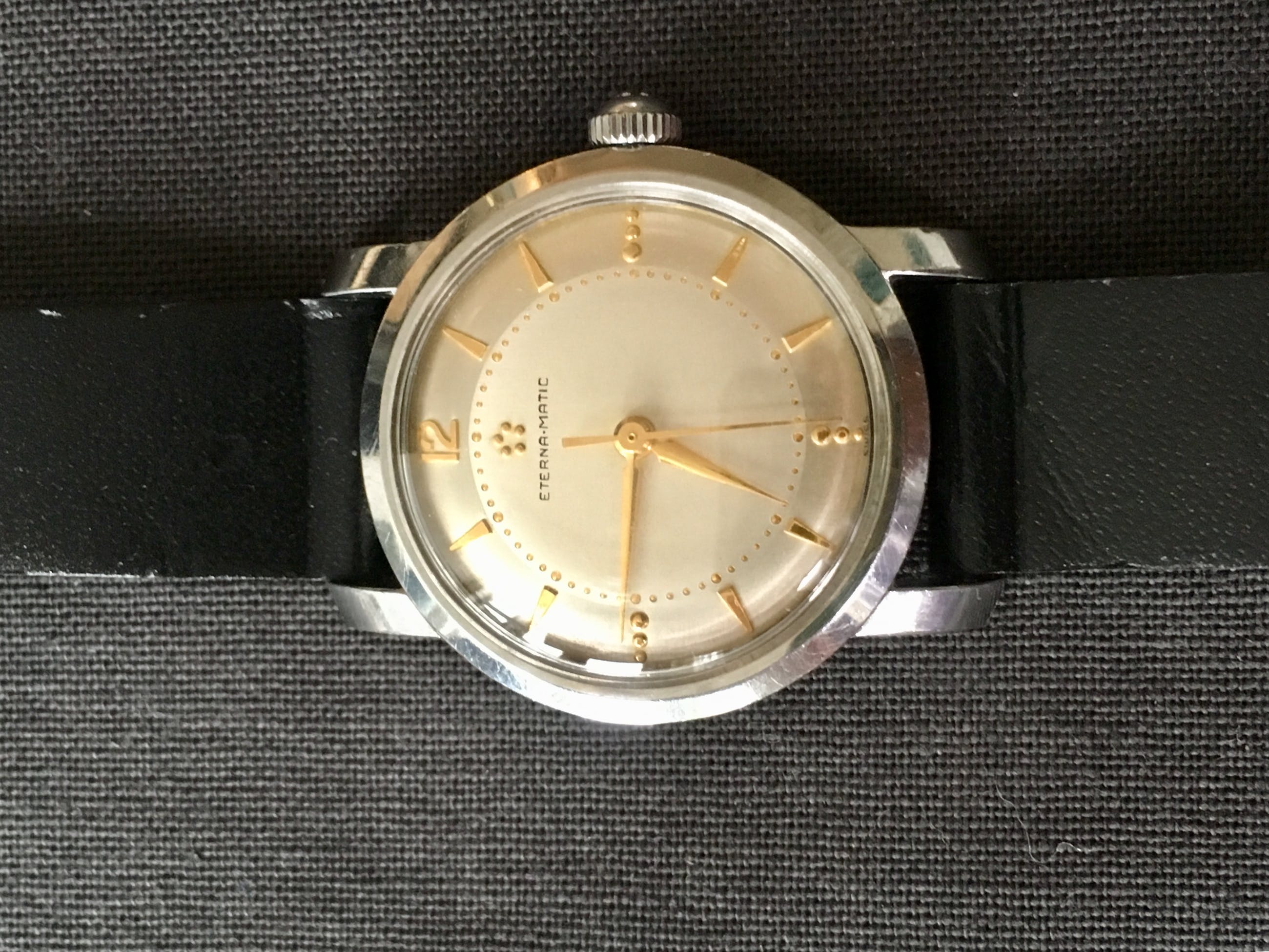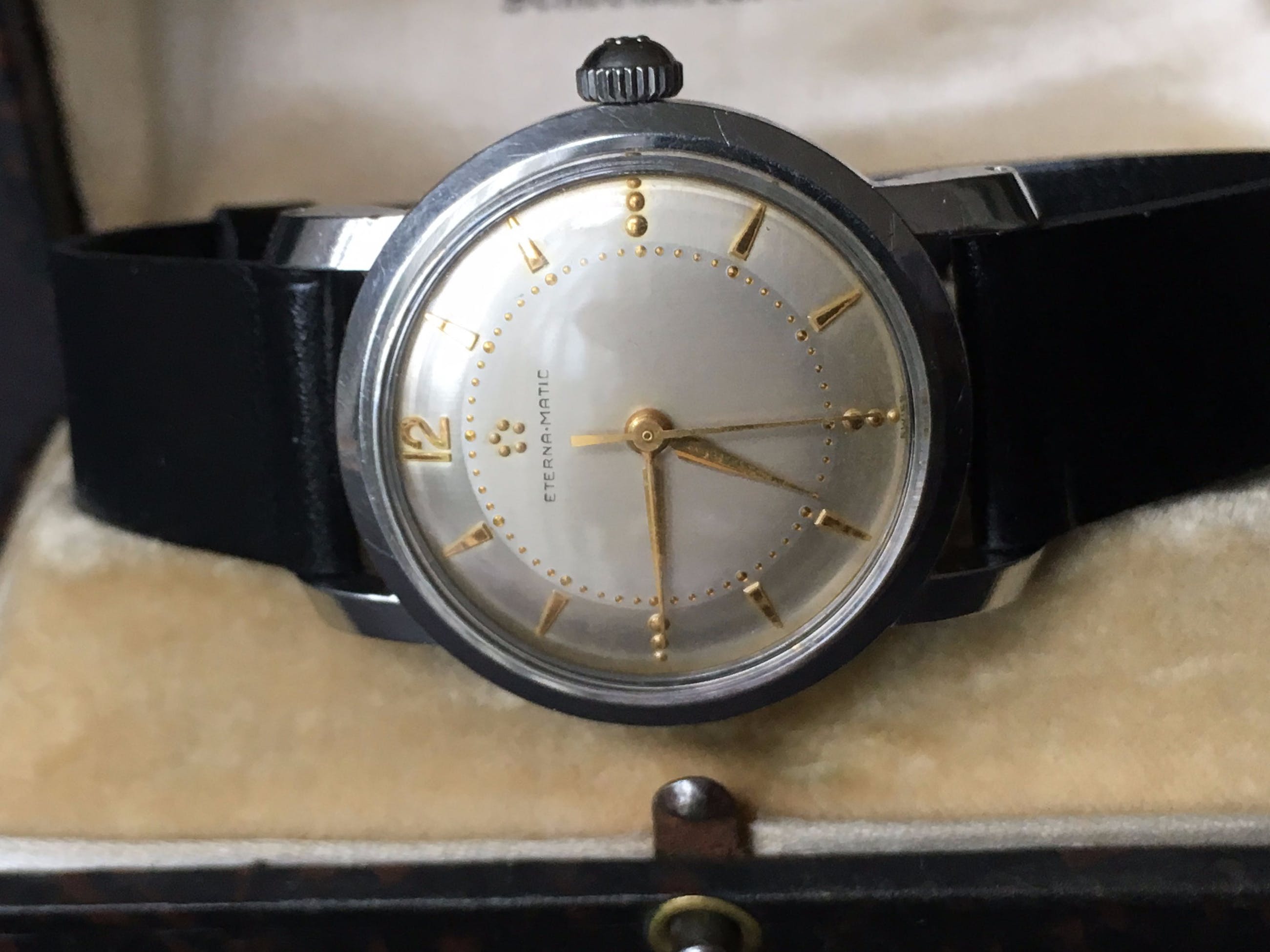 Eterna-matic vintage horloge met automatisch uurwerk in een stalen kast, ca. 1940.