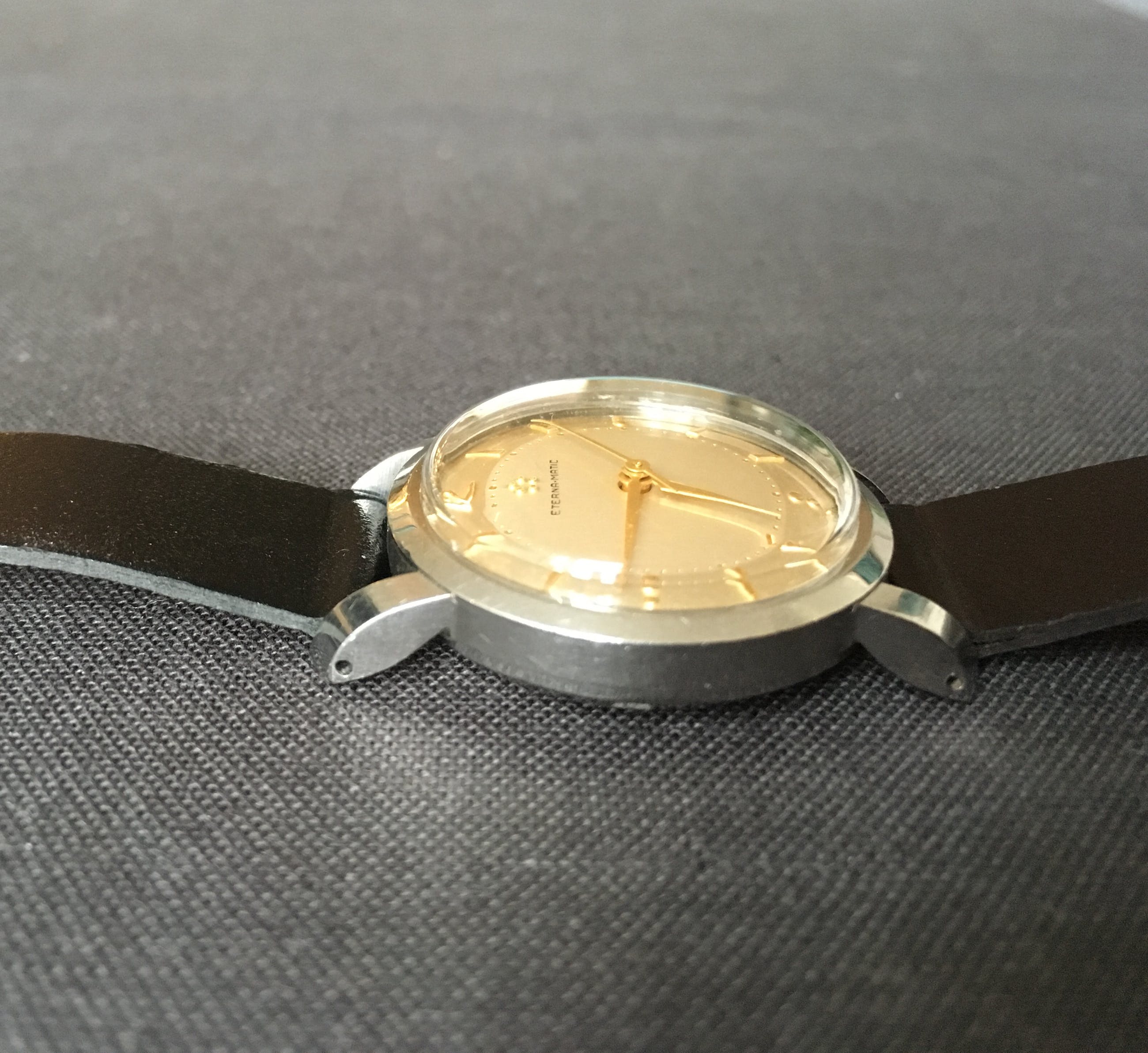 Mooi patina uurwerk, geheel origineel (incl. de kroon).Het uurwerk heeft goudkleurige streep tijdsaanduiding en een secondewijzer. De zwarte leren band en gesp zijn niet origineel.